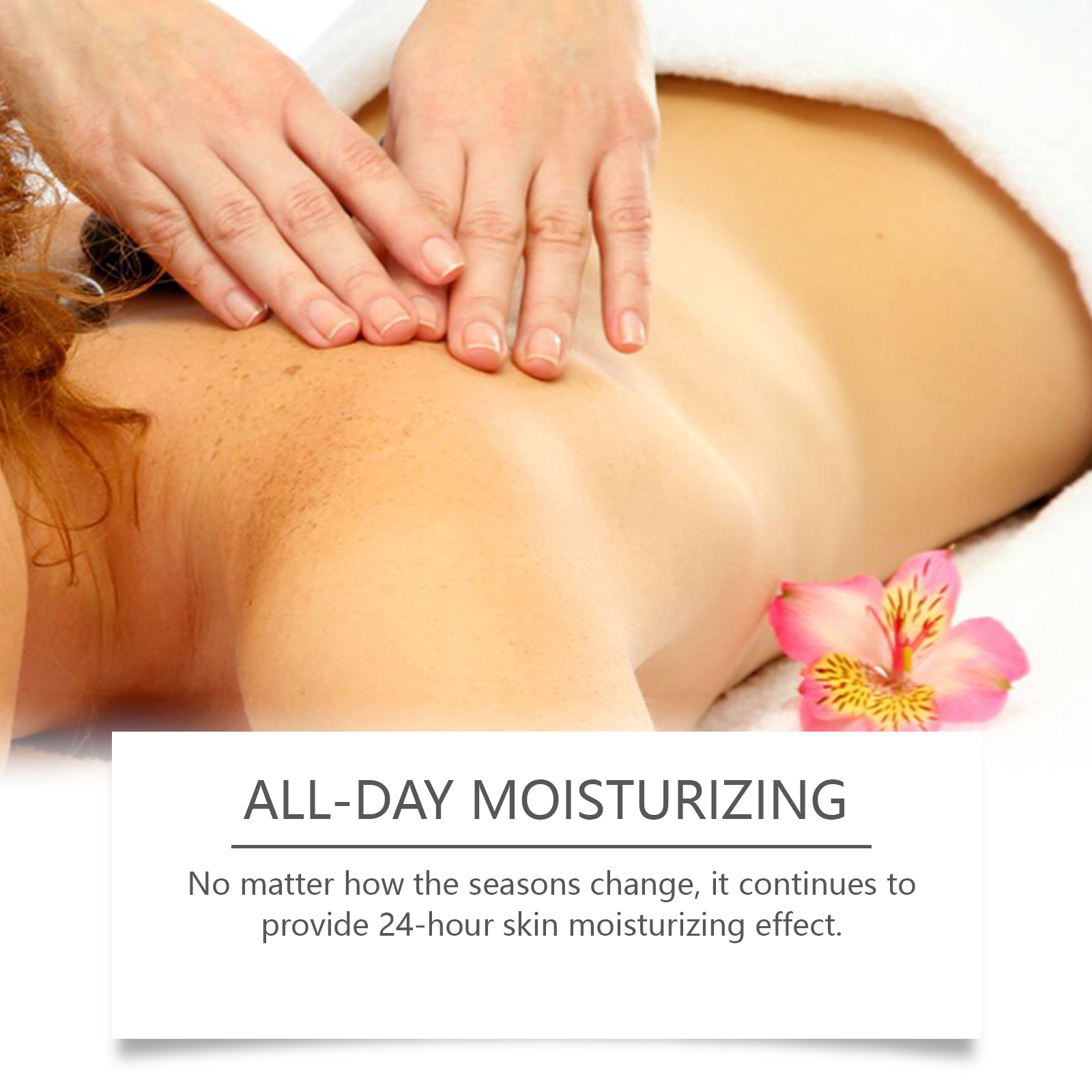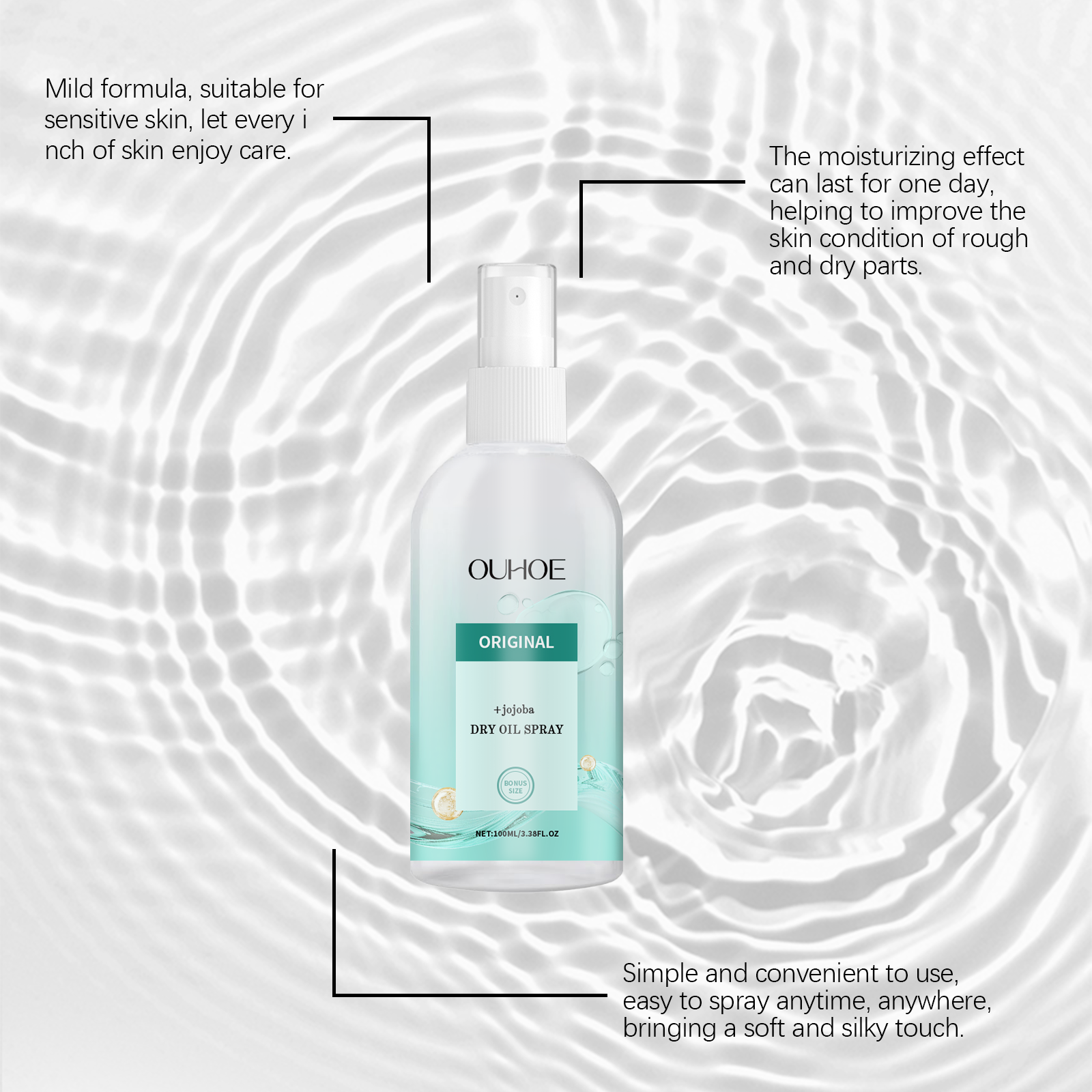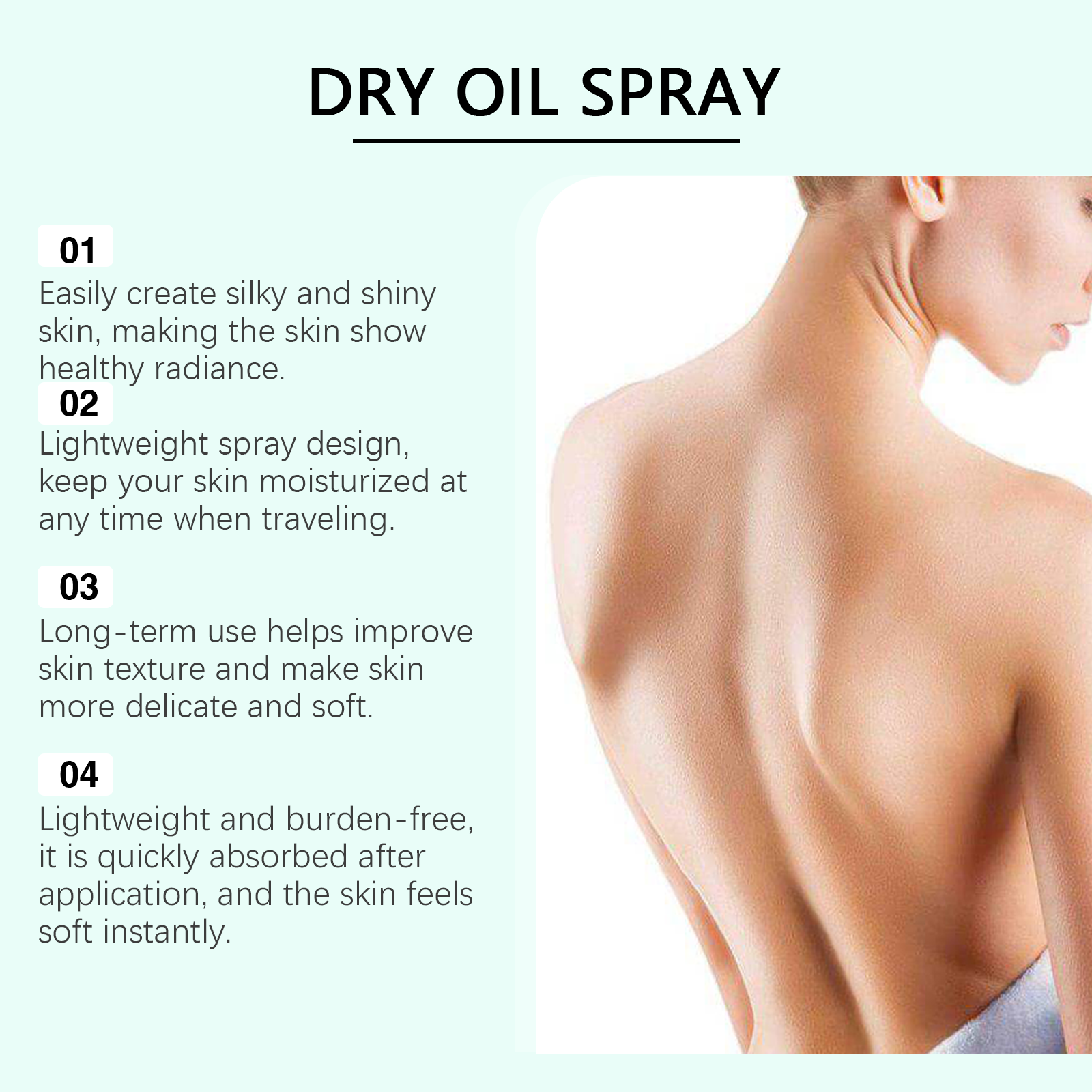 Our Moisturizing Body Oil spray contains lemon extract, vitamin E (tocopherol). It can effectively moisturize dry skin, help repair roughness, and return skin to a smooth touch. Its application method is very simple: clean the skin, keep the skin dry, spray an appropriate amount of this product on the body skin, gently massage until absorbed. And no matter how the season changes, it continues to provide 24-hour skin moisturizing effect.