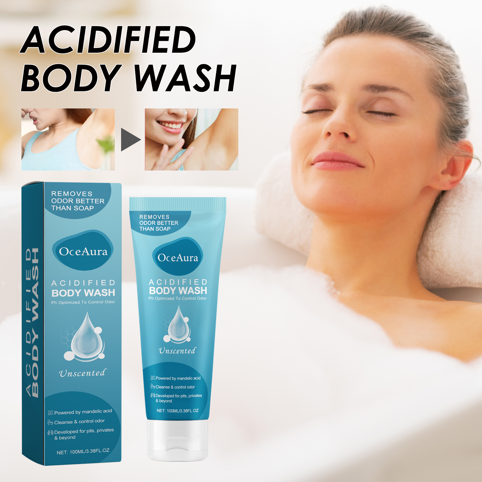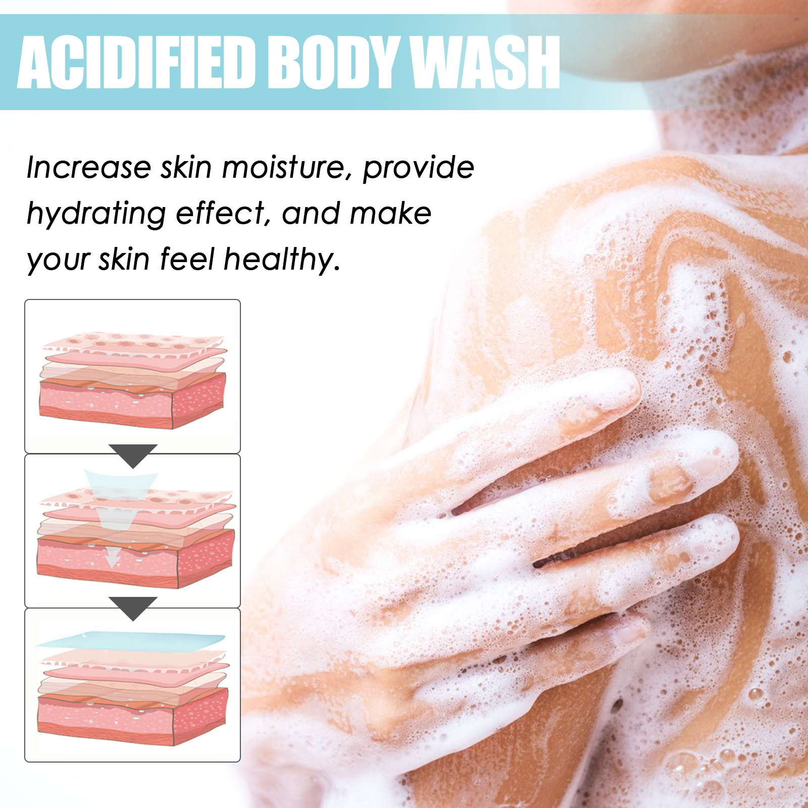 Our Acidified Body Wash contains Cocos Nucifera(Coconut)Oil, Mandelic Acid, Glycerin. It removes odors, keeps you fresh throughout the day, deeply cleans pores and dirt, balances the top layer of water and oil, reduces skin acne, removes excess dead skin, and leaves your skin glowing. Its use method is very simple: Wet your body first. Take an appropriate amount of shower gel on the palm of your hand or on a bath ball, and rub it into foam. Apply the foam to the body and massage gently. Finally, rinse the foam with warm water. Can improve clogged pores and provide deep cleansing.