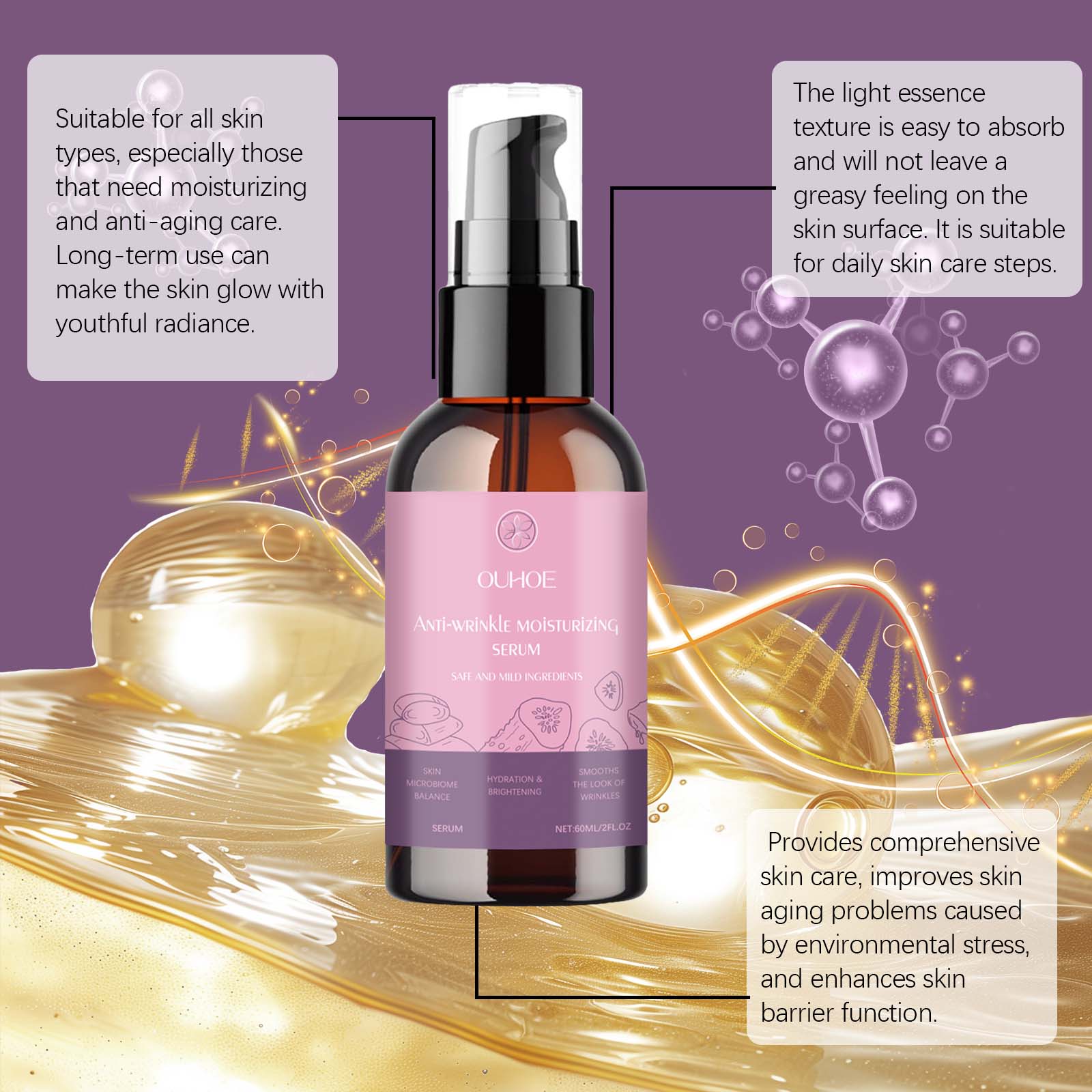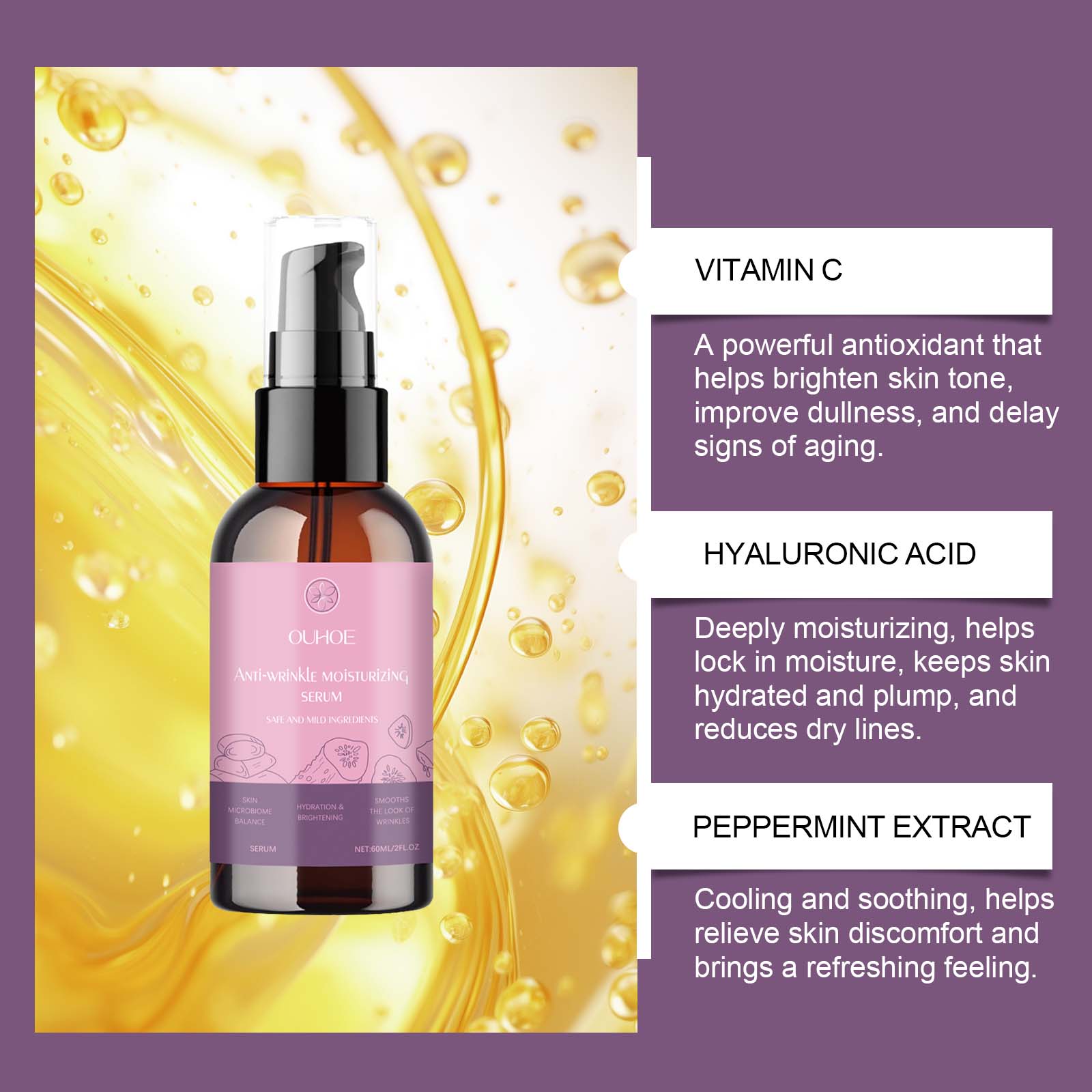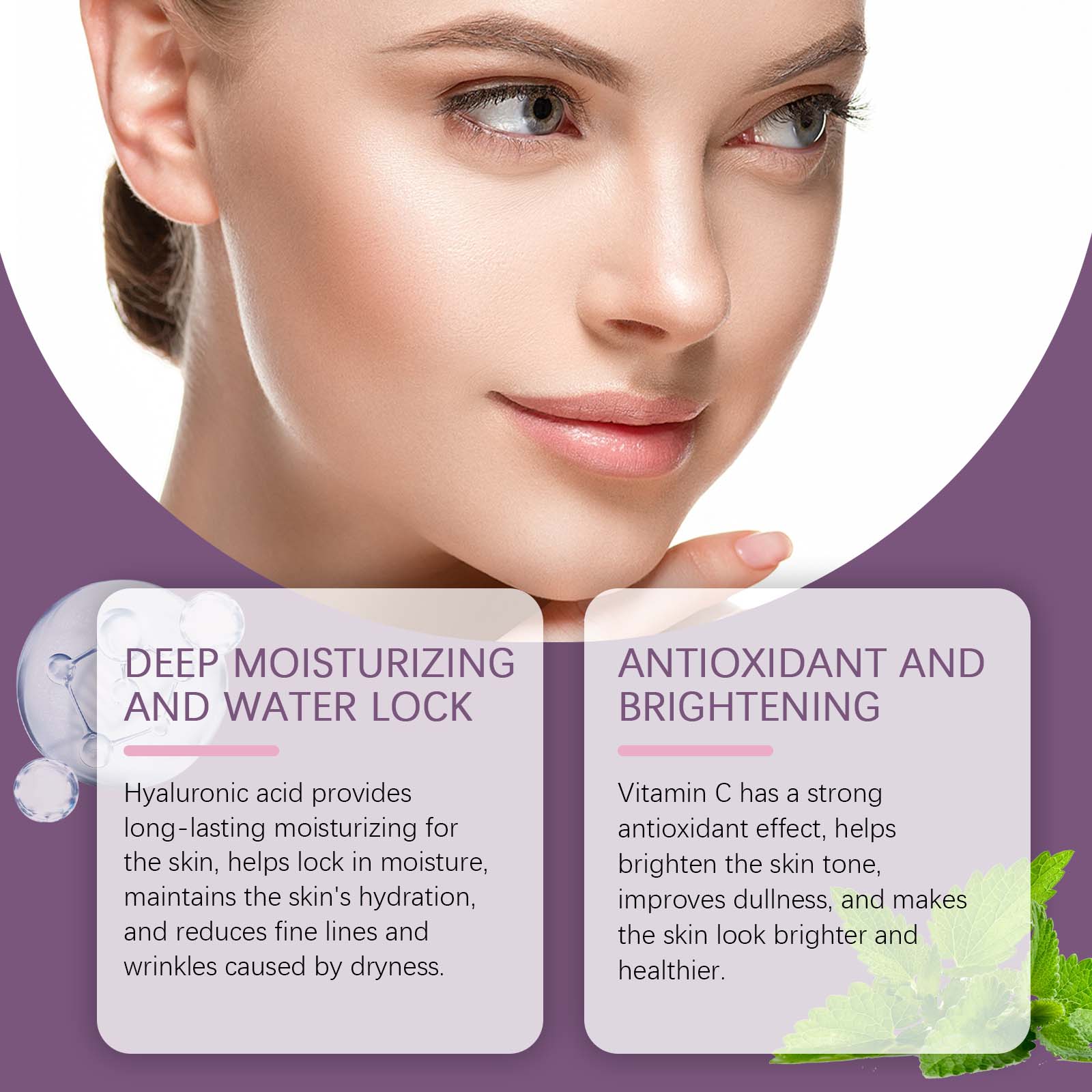 Our moisturizing serum contains vitamin C (ascorbic acid), hyaluronic acid, and peppermint extract. It provides long-lasting moisture to the skin, helps lock in moisture, maintains moisture in the skin, and reduces fine lines and wrinkles caused by dryness. The way to use it is simple: clean the facial skin and keep the skin dry. Apply appropriate amount of this product evenly on the face. Gently massage until absorbed. It also has a strong antioxidant effect, which helps to lighten the skin, improve the dullness of the skin, and make the skin look brighter and healthier.