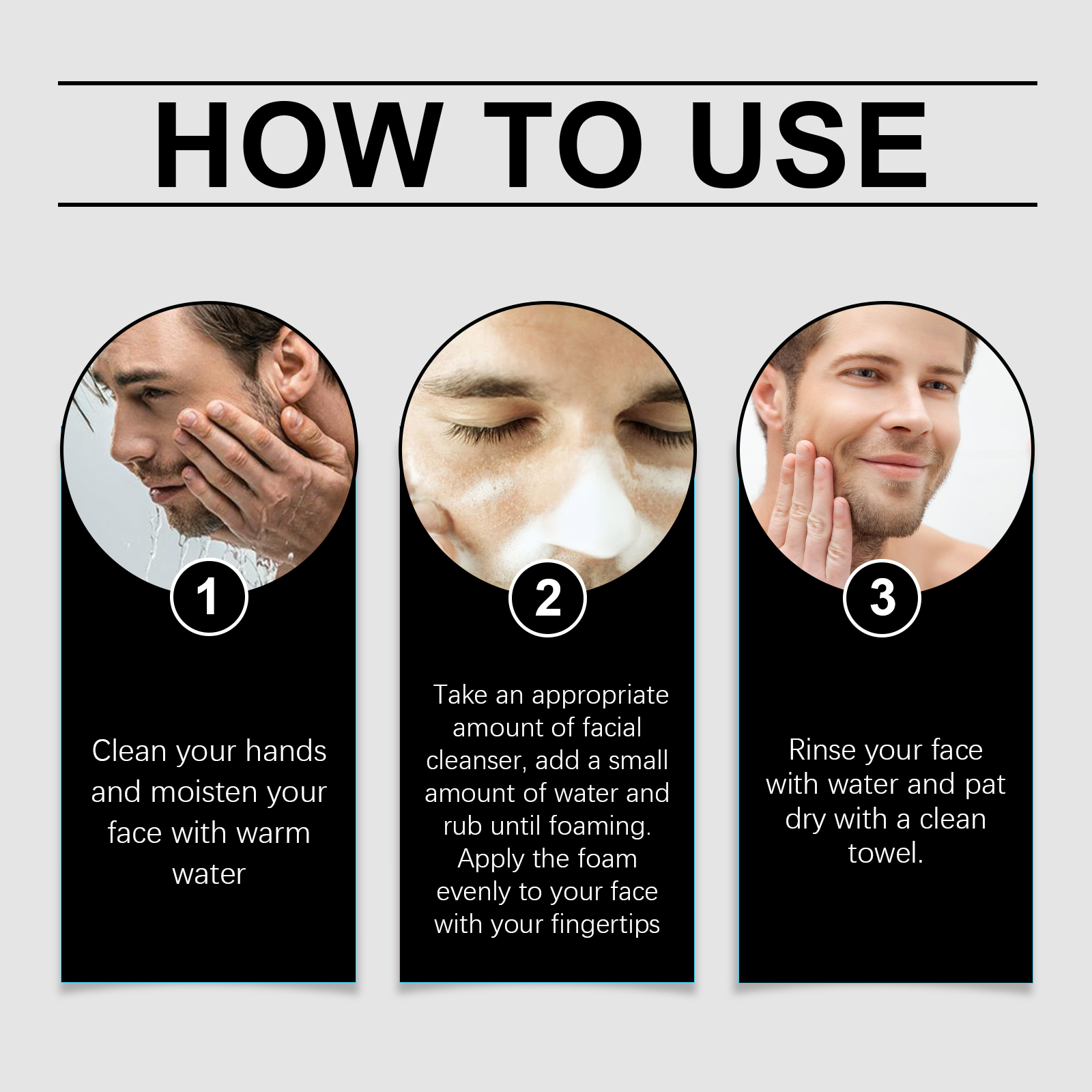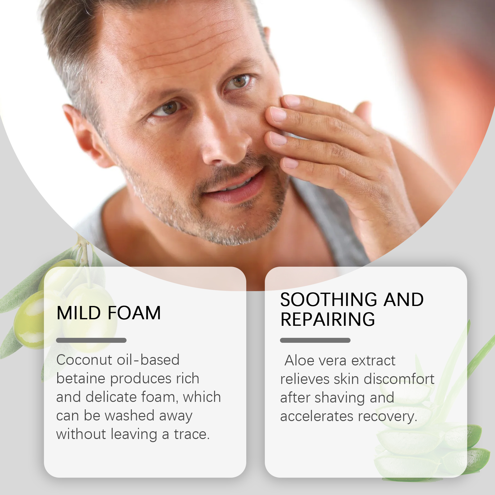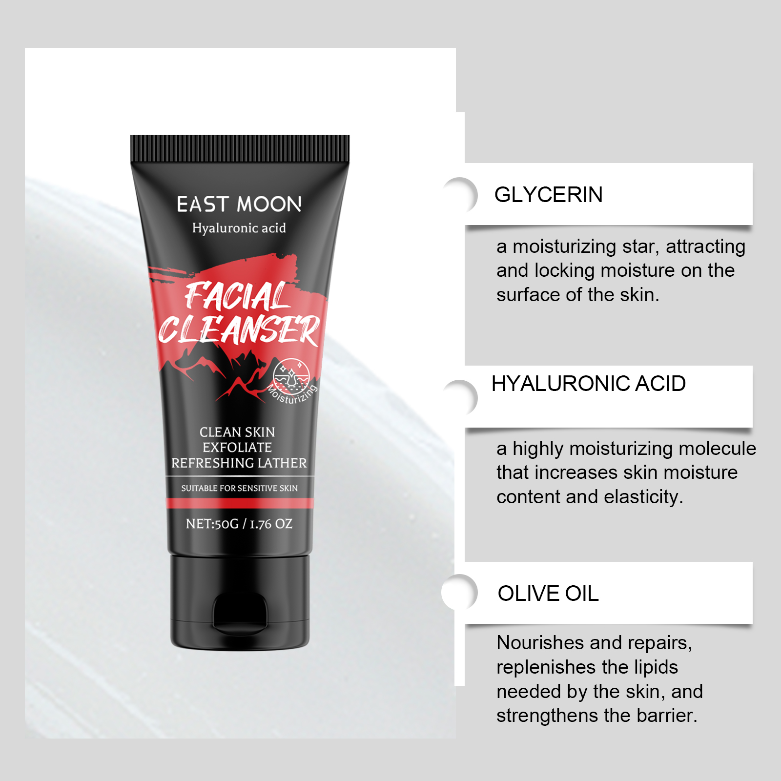 Our moisturizing facial cleanser contains glycerin, hyaluronic acid, olive oil. It attracts and traps moisture from the surface of the skin. Increases skin moisture content and elasticity; Nourish and repair, replenish the lipids needed by the skin, and strengthen the barrier. The way to use it is very simple: 1. Clean your hands and wet your face with warm water; 2. Take proper amount of cleanser, add a small amount of water, rub until foaming. Apply the foam evenly to your face with your fingertips; 3. Rinse your face with water and dry it with a clean towel. Aloe vera extract eases post-shave skin discomfort and accelerates recovery; Glycerin and hyaluronic acid replenish and lock in skin moisture.