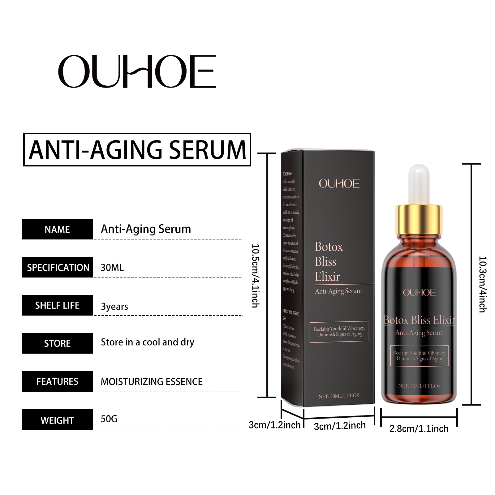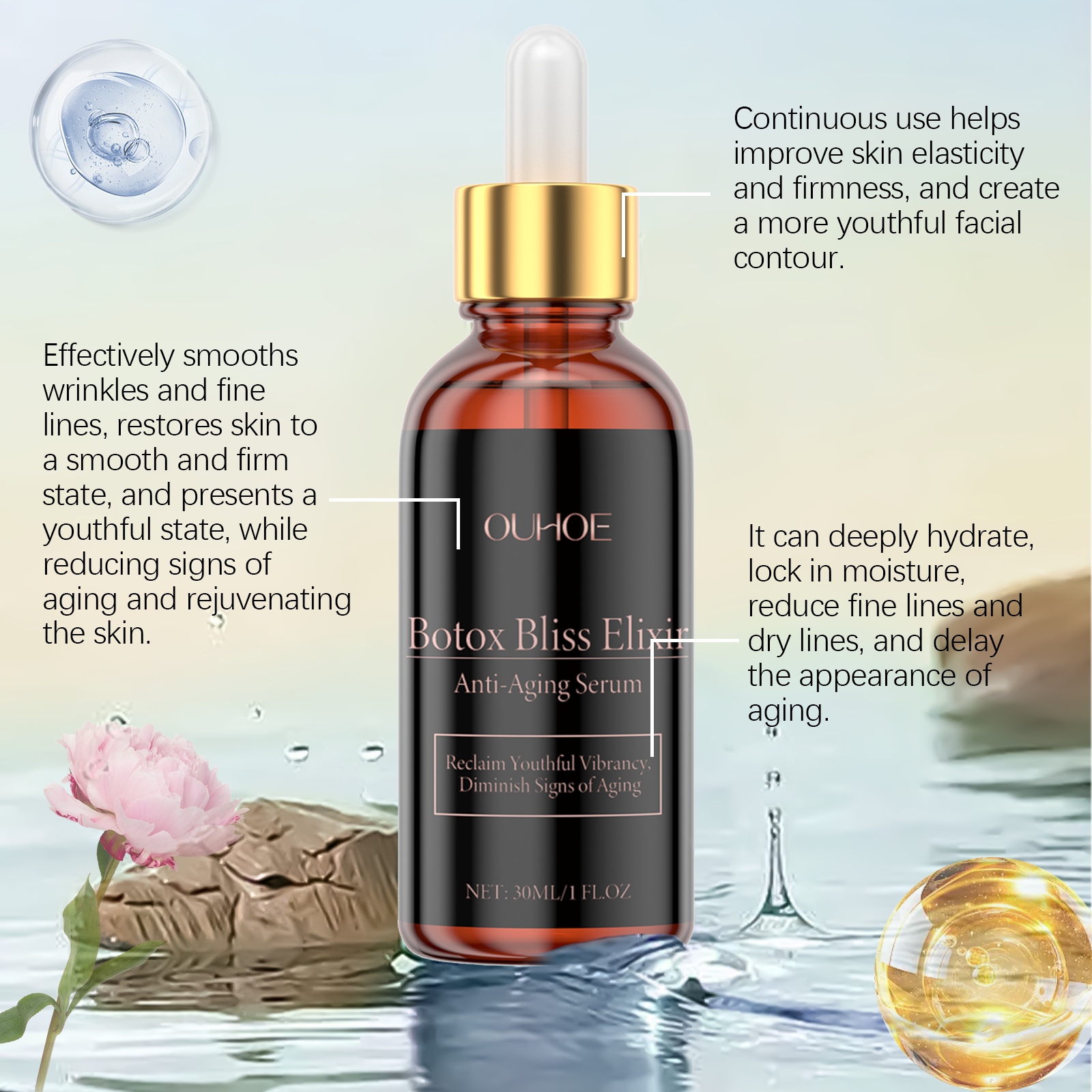Our moisturizing serum contains glycerin, hyaluronic acid and Peony root extract. It can significantly improve skin firmness, make skin more elastic and vigorous; Effectively locks in moisture and helps skin stay hydrated for a long time. Its use method is very simple: 1. Wash your face. 2. Apply appropriate amount to face evenly. 3. Gently massage the eye sockets to promote absorption. Slows down the signs of aging, and the visibility of lines and wrinkles below the line is significantly reduced. Even skin tone, improve skin quality, and show a healthy skin tone.