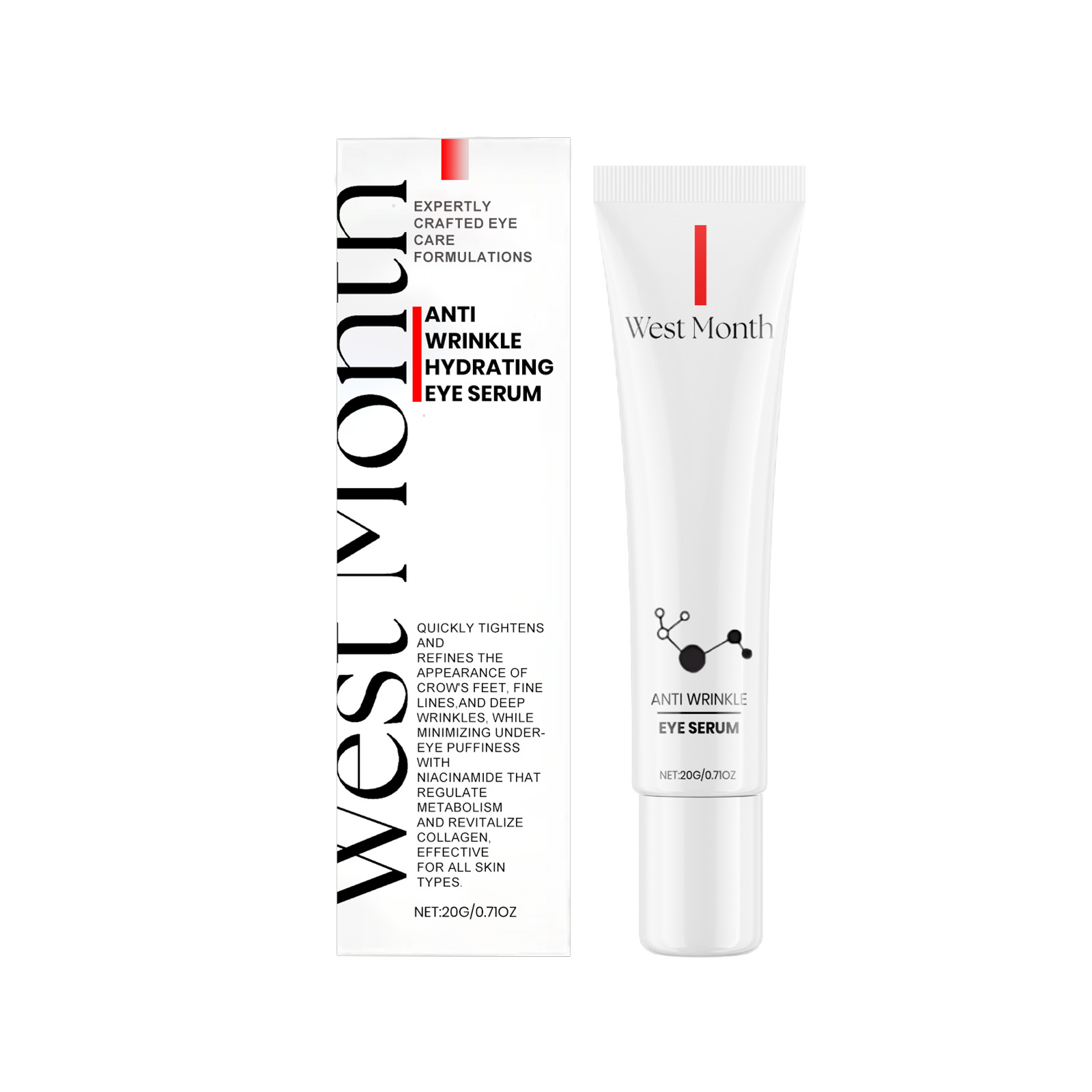 Our moisturizing firming eye cream contains Asiaticum extract, niacinamide. It tightens the skin around the eyes, reduces the appearance of bags under the eyes, and makes you look younger. The way to use it is simple: after cleansing, take a small amount of eye cream and apply it to the fingertips. Use your fingertips or a cotton swab to gently apply to areas of the eye that need to be removed. Relax your facial muscles for 60 seconds and wait for the product to be absorbed. It can also improve skin elasticity and tighten the eye area.