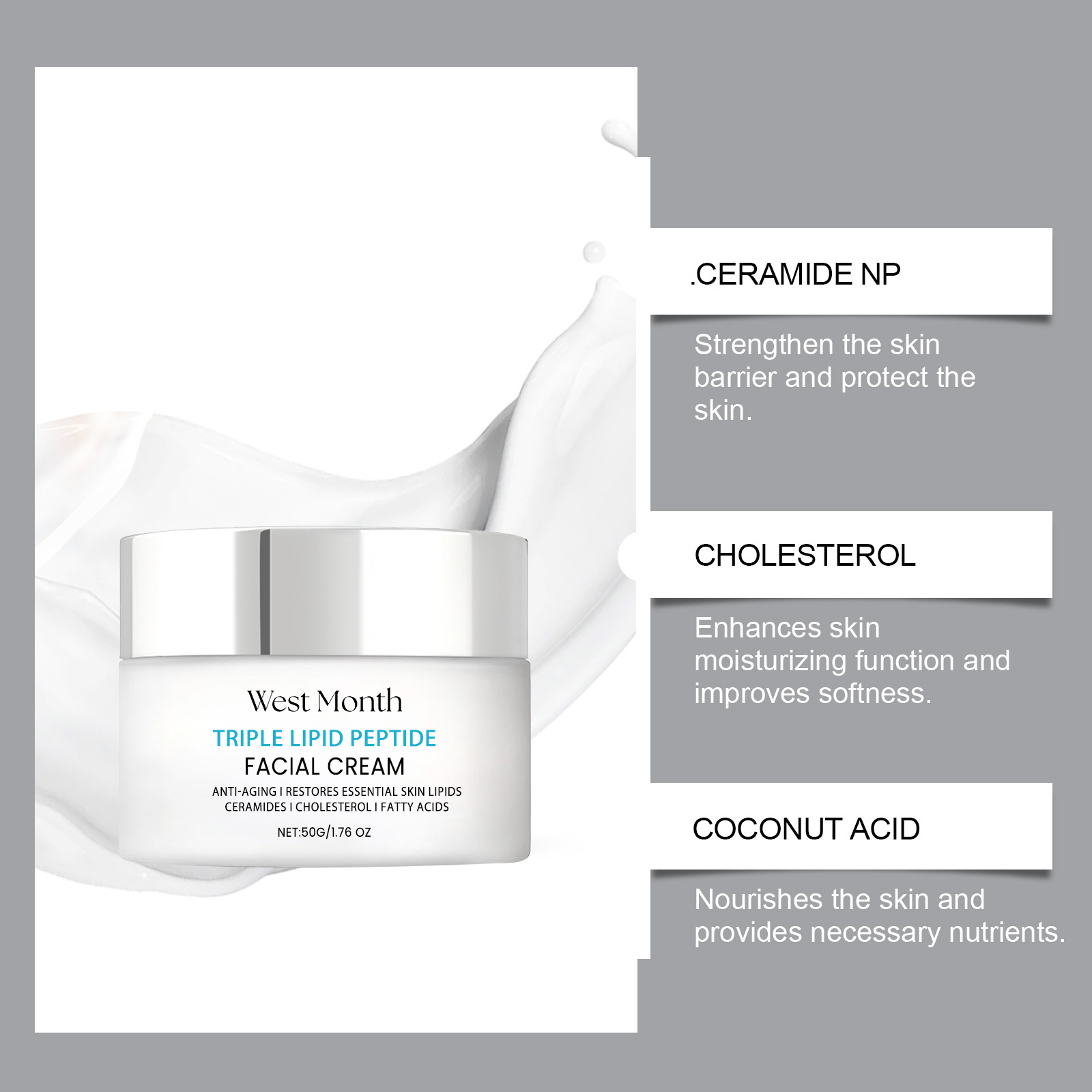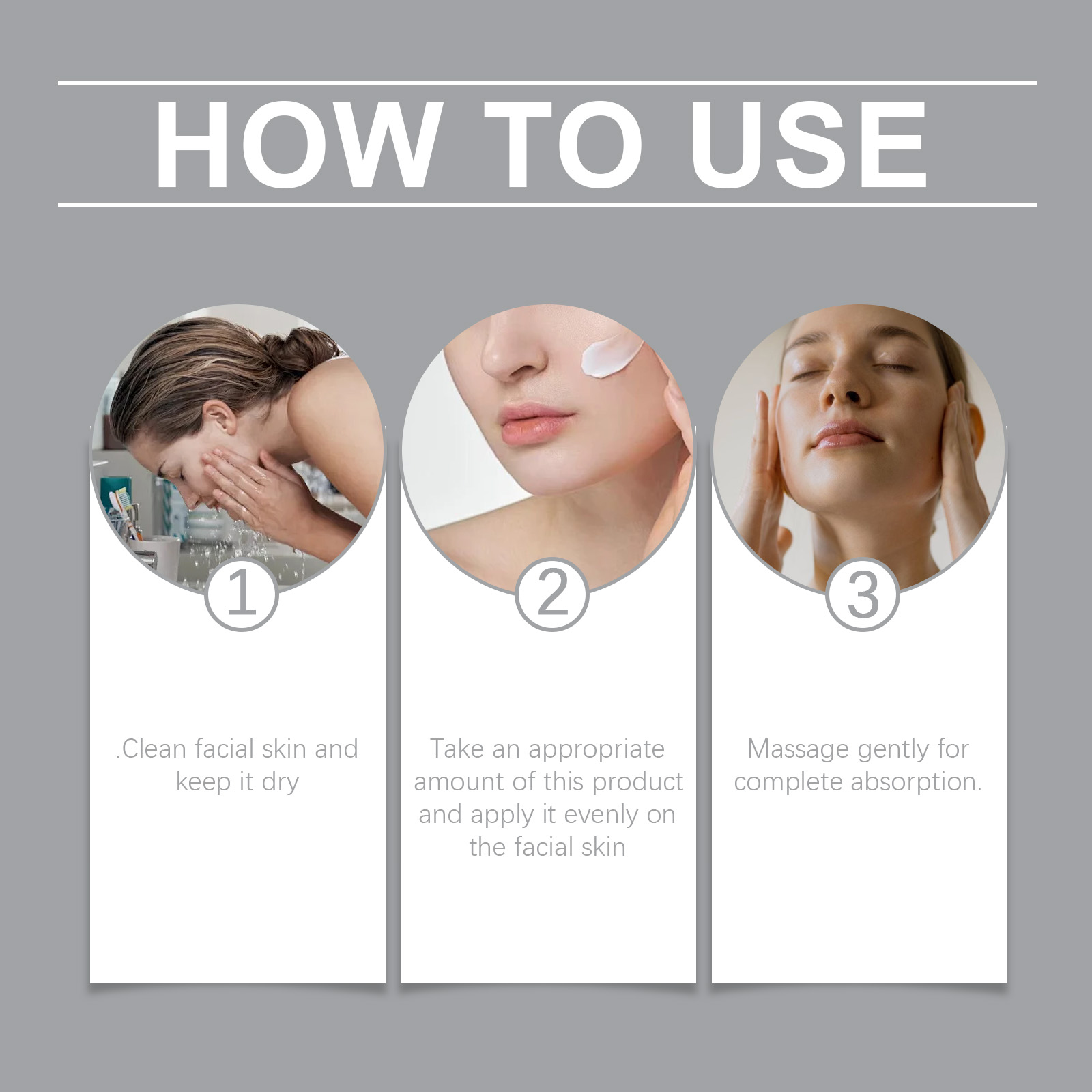 Our tripeptide cream contains coconut acid and glycerin. It can help restore the skin barrier, promote a healthy elastic complexion and keep the skin glowing. Its use method is very simple: clean facial skin, keep dry, apply appropriate amount of this product evenly on facial skin, gently massage, so that it is completely absorbed. And it keeps your skin hydrated throughout the day.