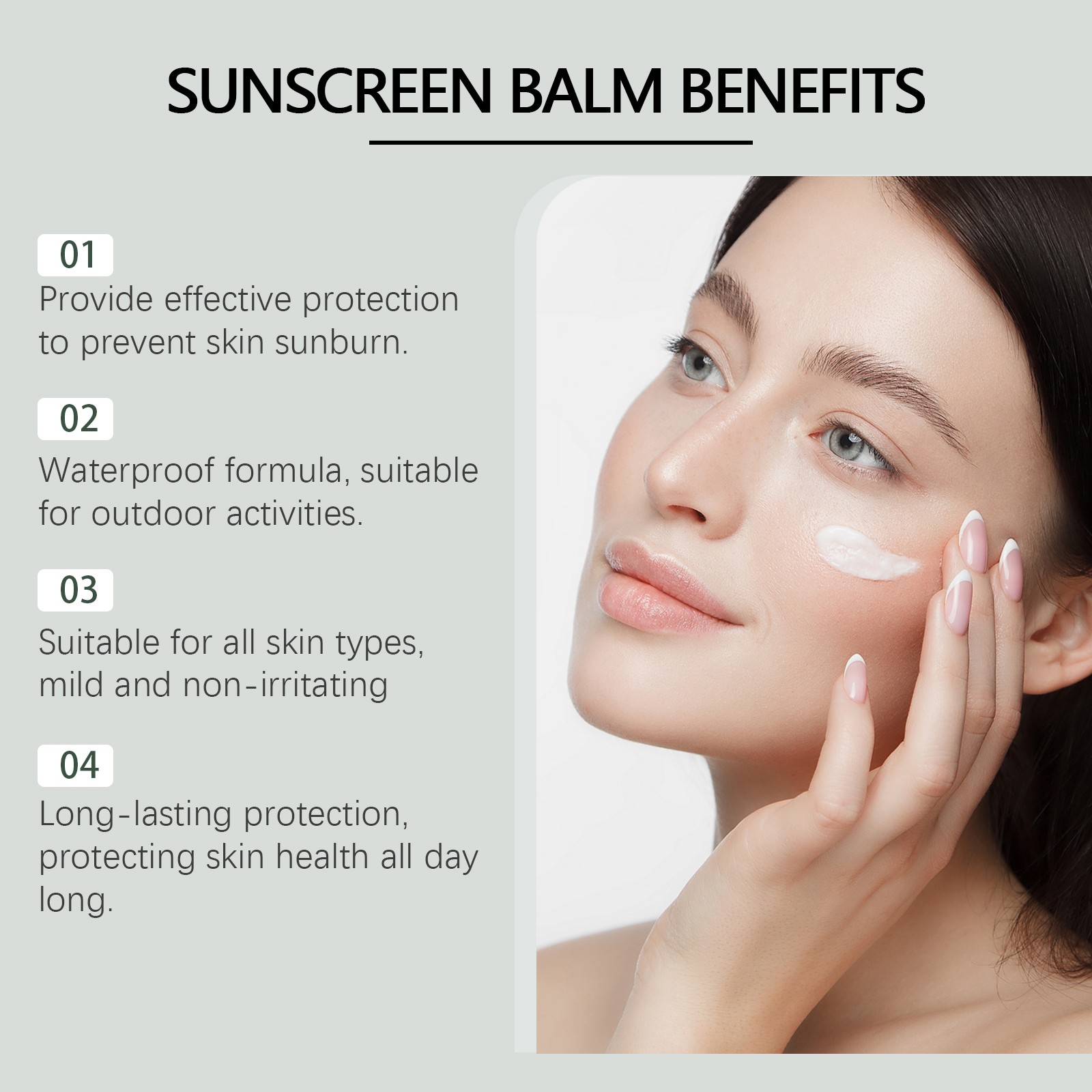 Our moisturizing and protective cream contains titanium dioxide and glycerin. It can be absorbed quickly, leaving no white spots or greasy feeling. Lightweight formula that comfortably lasts all day. Its use method is very simple: clean the skin, keep dry, take appropriate amount of this product, evenly apply to the desired skin, gently massage, so that it is completely absorbed. And can be durable protection, 24/7 protection of skin health.