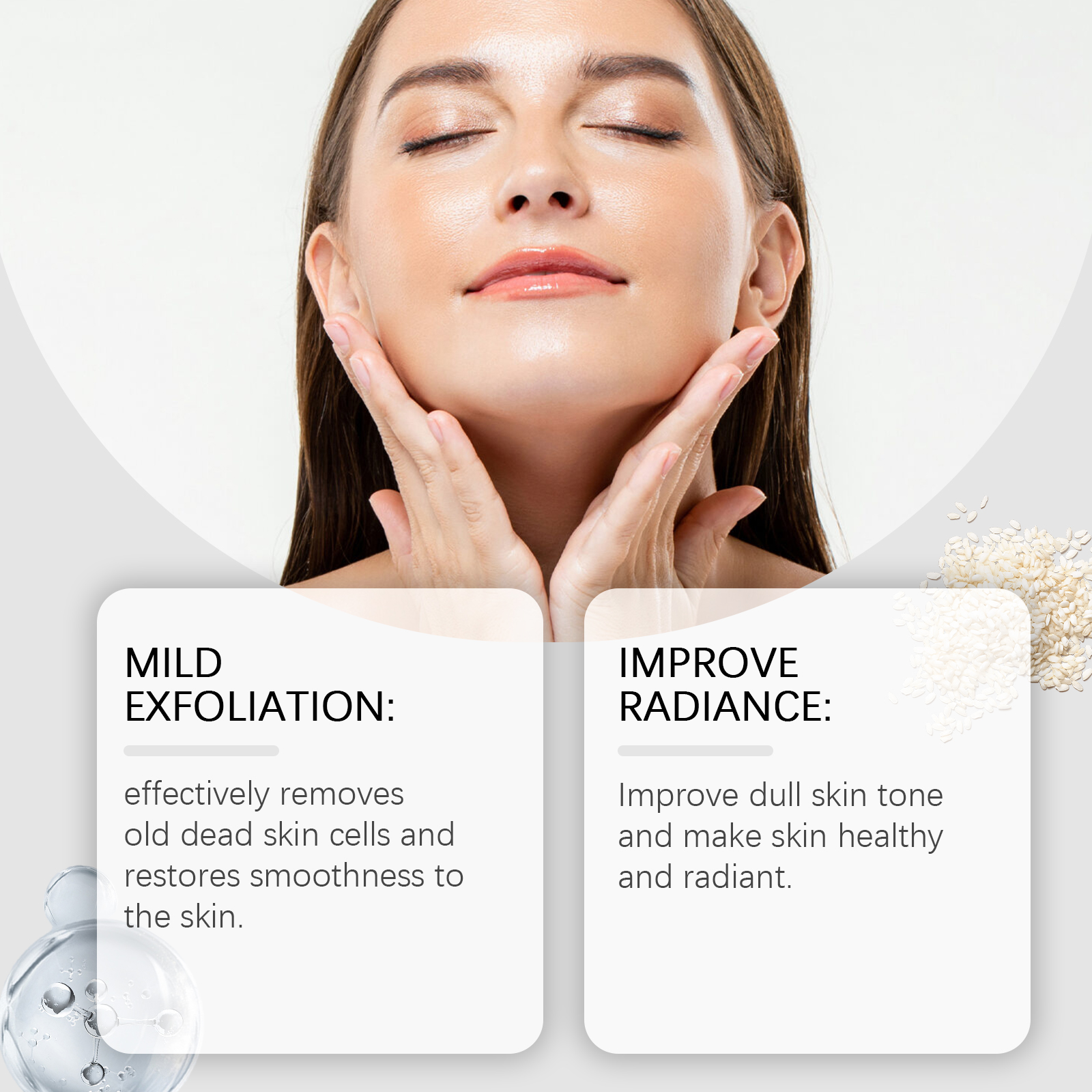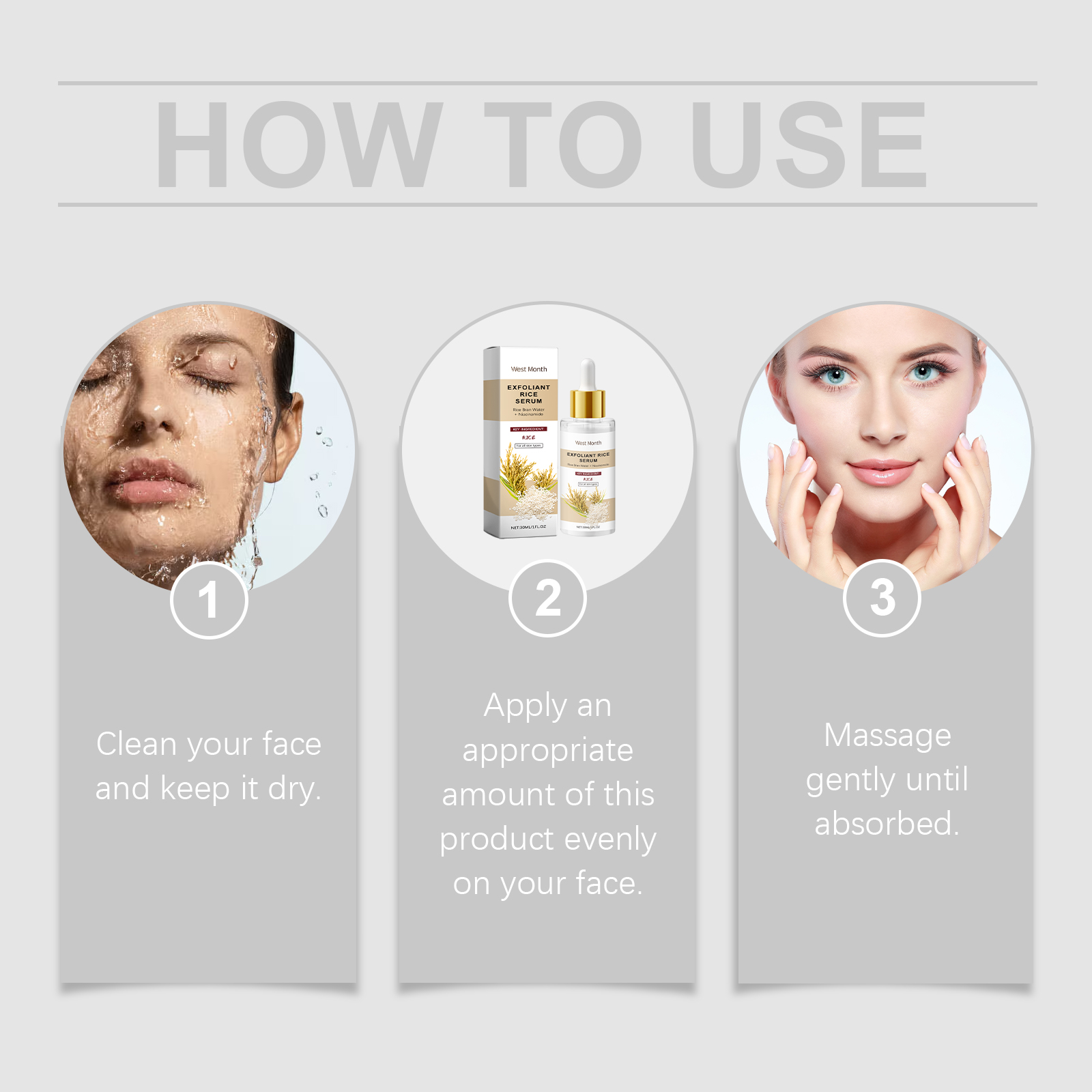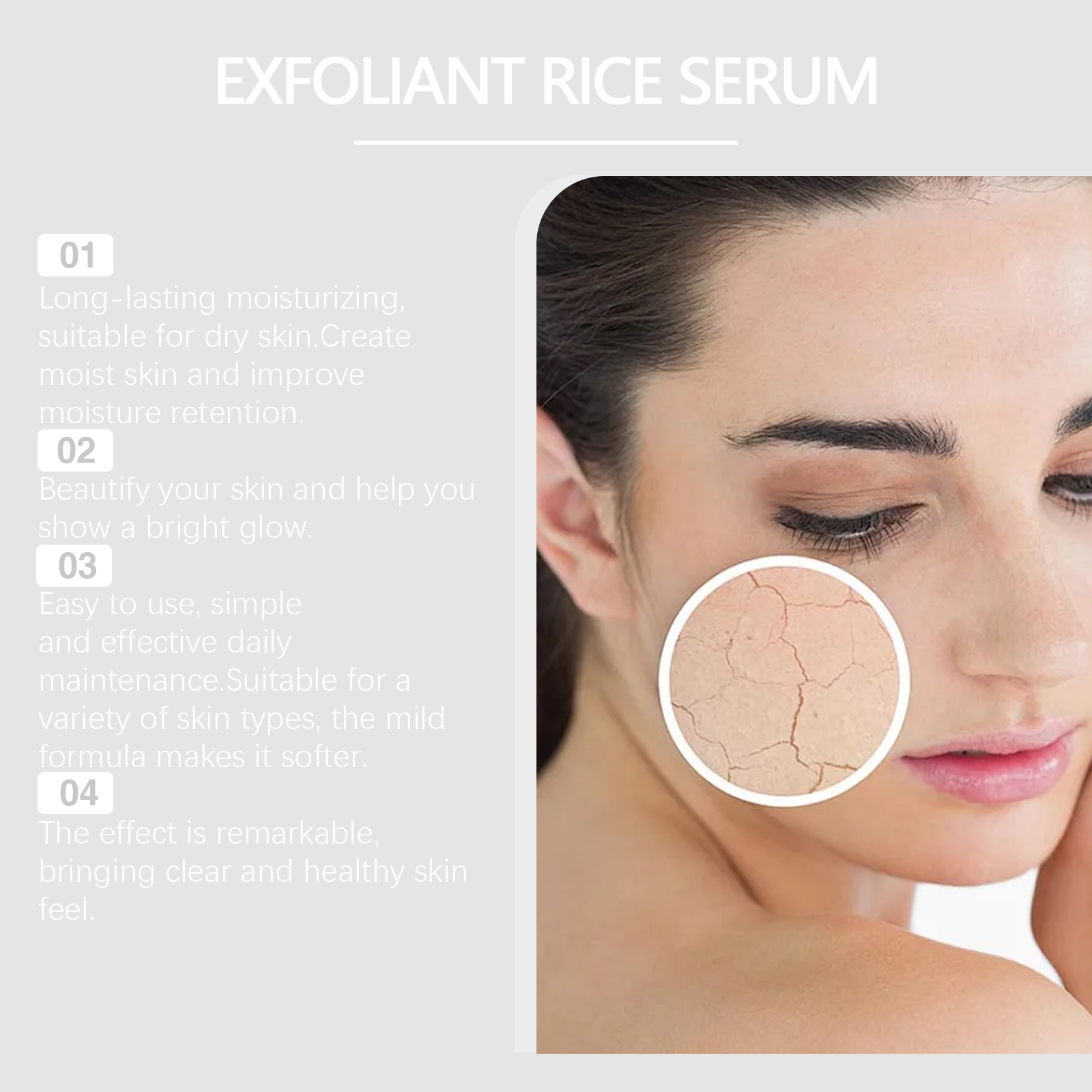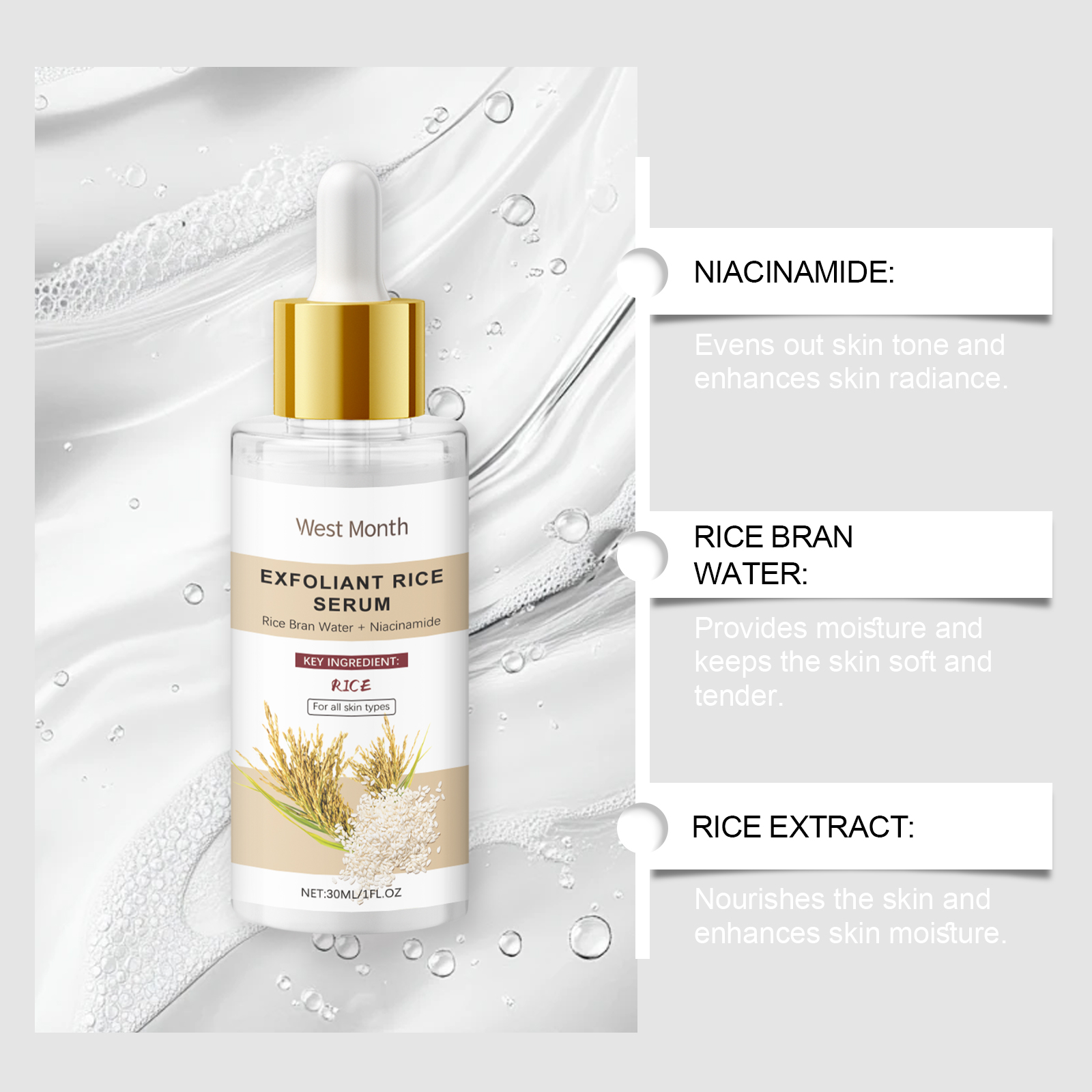 Our moisturizing serum contains glycerin and rice bran water. It can effectively remove aging dead skin cells and restore smooth skin. Improve dull skin tone and leave skin healthy and glowing. Its application is simple: clean your face and keep it dry. Apply appropriate amount to face evenly. Gently massage until absorbed. It can also regulate the condition of pores and make the skin more delicate.
