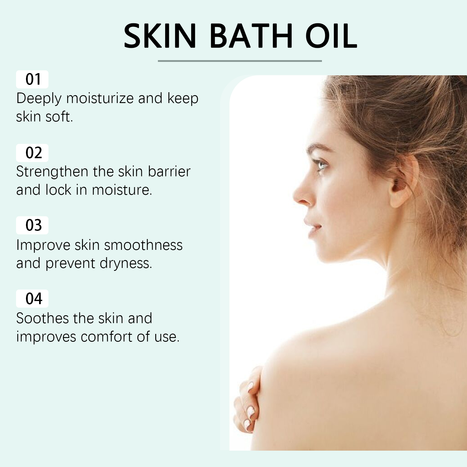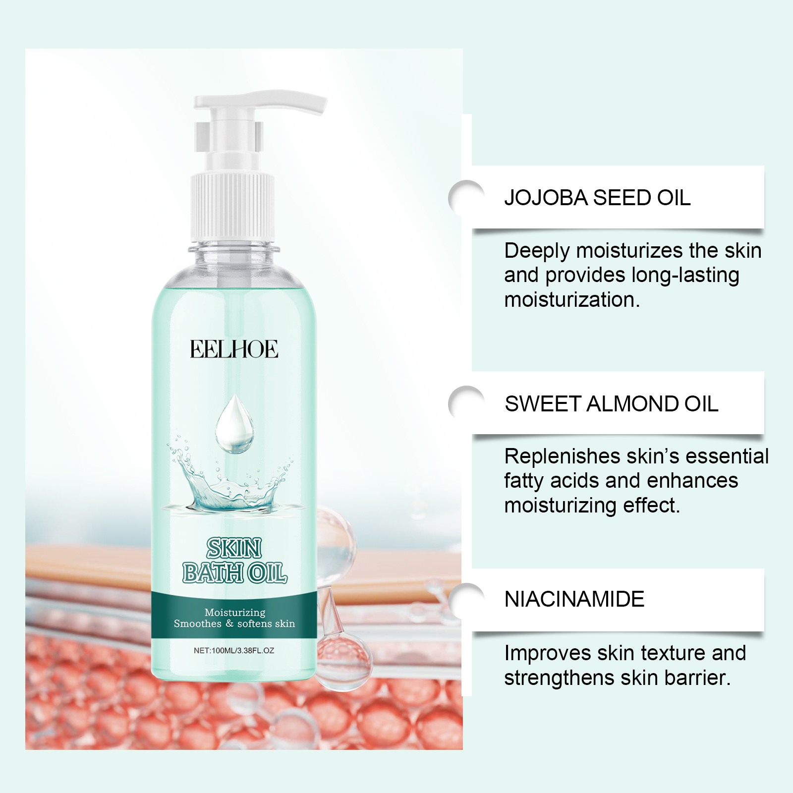 Our moisturizing bath oil contains Jojoba seed oil, sweet almond oil, nicotinamide. It can improve skin smoothness and prevent dryness. Its use method is very simple: 1. Moisturize the body skin with warm water. 2. Apply appropriate amount of bath oil to palm and evenly apply to arms, legs and other parts. 3. Massage gently to promote absorption. 4. Rinse with water. Rich in Jojoba seed oil and sweet almond oil. It provides lasting moisture and keeps skin soft. Contains niacinamide, which helps strengthen the skin barrier and locks in moisture.