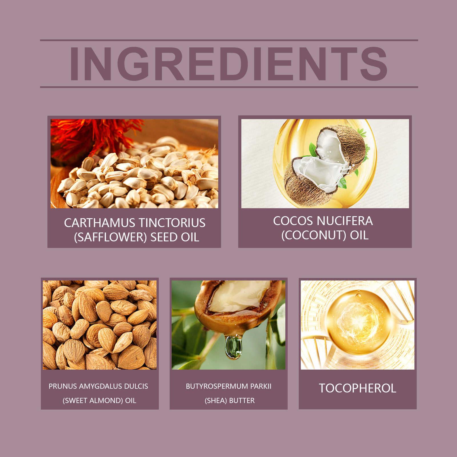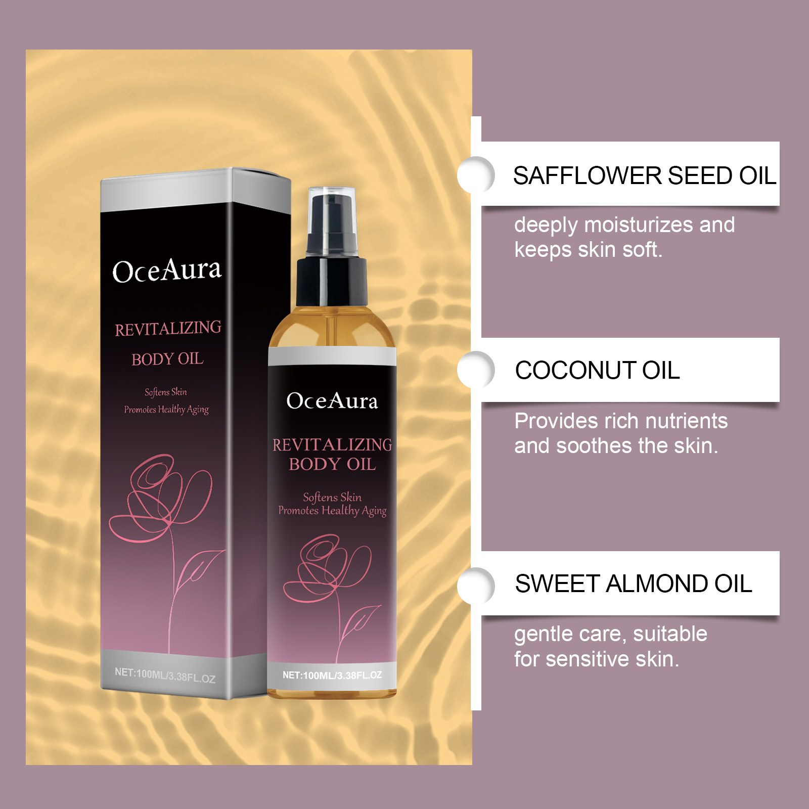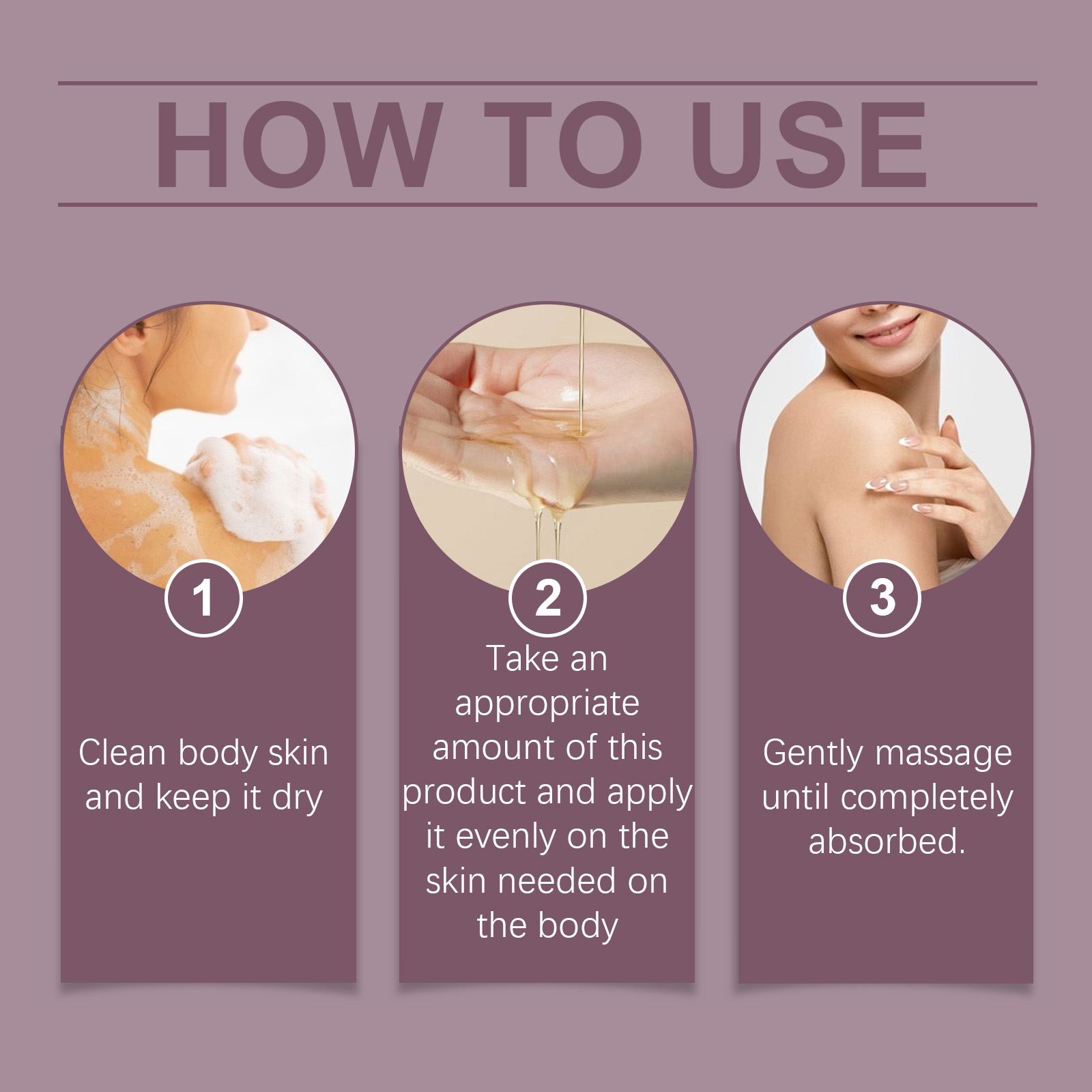 Our moisturizing and soothing body oils contain sweet almond oil, shea butter and Vitamin E (tocopherol). It can improve skin moisture. Its use method is very simple: clean the body skin and keep dry, take appropriate amount of this product, evenly apply to the skin required by the body, gently massage until completely absorbed. And it can relieve skin tightness.
