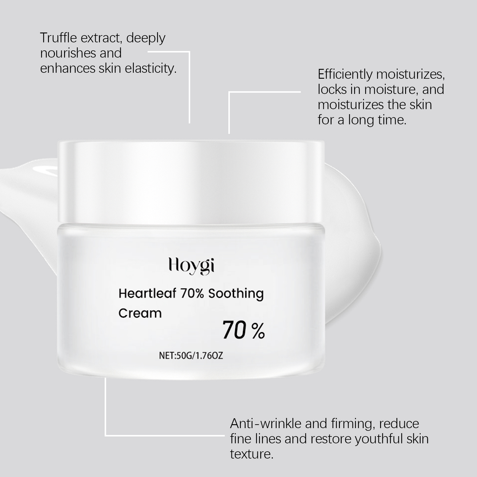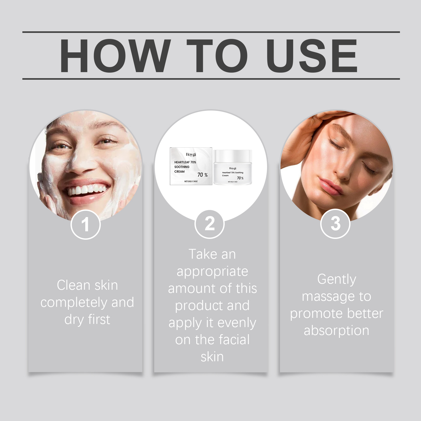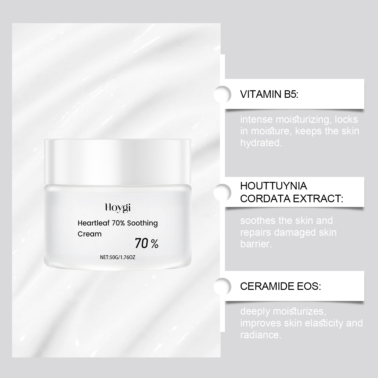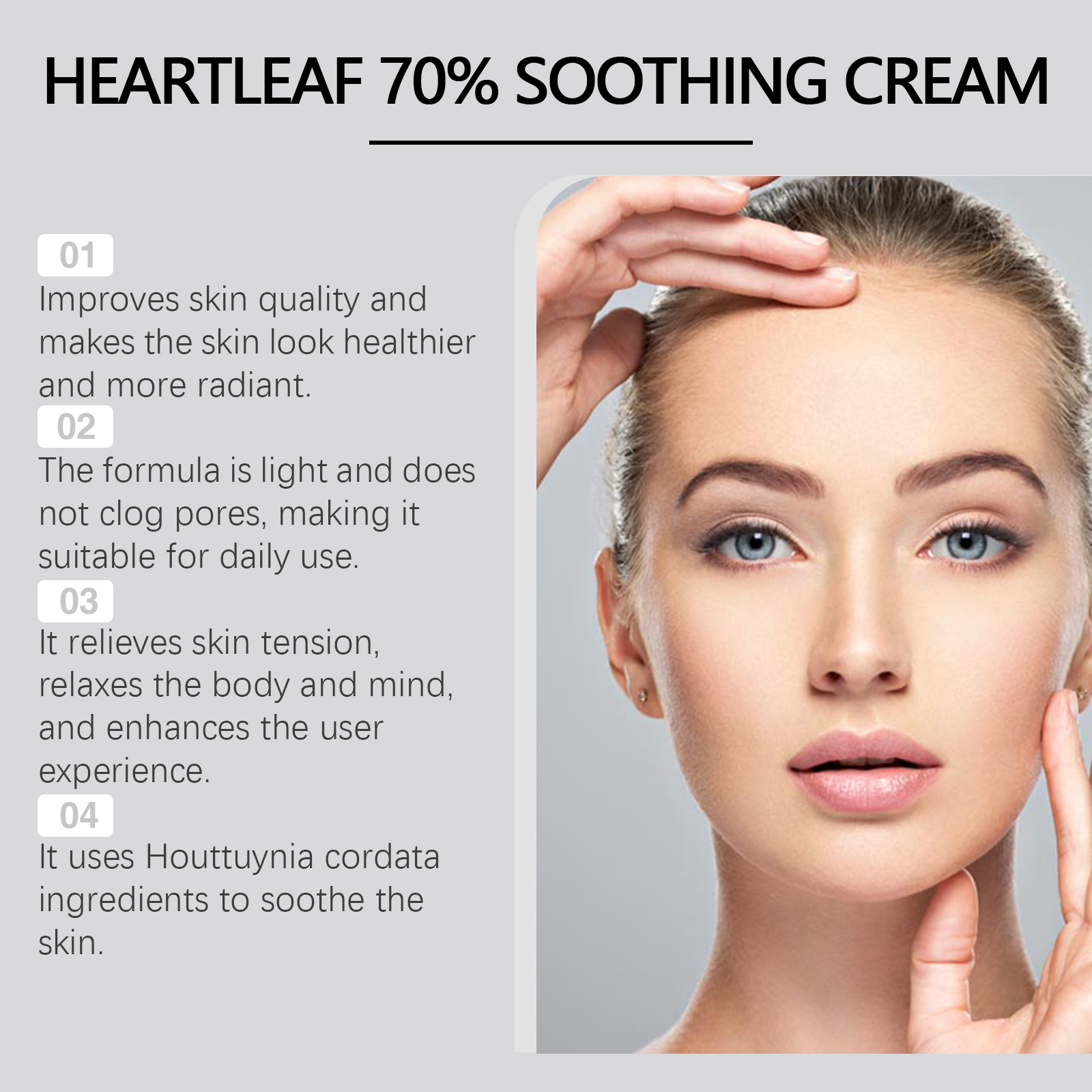 Our Heart Leaf moisturizing and soothing cream contains ceramide EOS and aloe vera leaf extract. It deeply moisturizes the skin and keeps it hydrated throughout the day. The way to use it is simple: thoroughly clean the skin, dry it first; Apply appropriate amount of the product evenly on the face; Massage gently to promote better absorption. And can effectively relieve skin discomfort, repair damaged barriers, reduce redness.