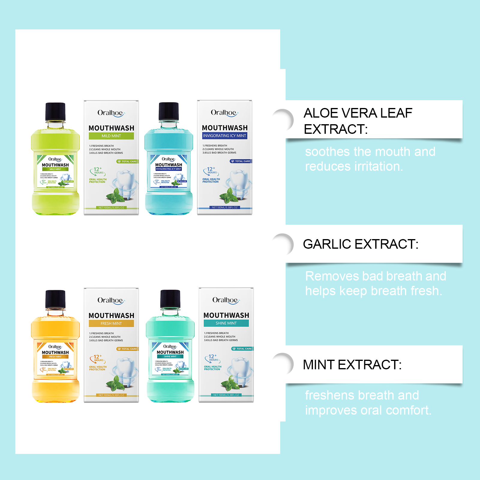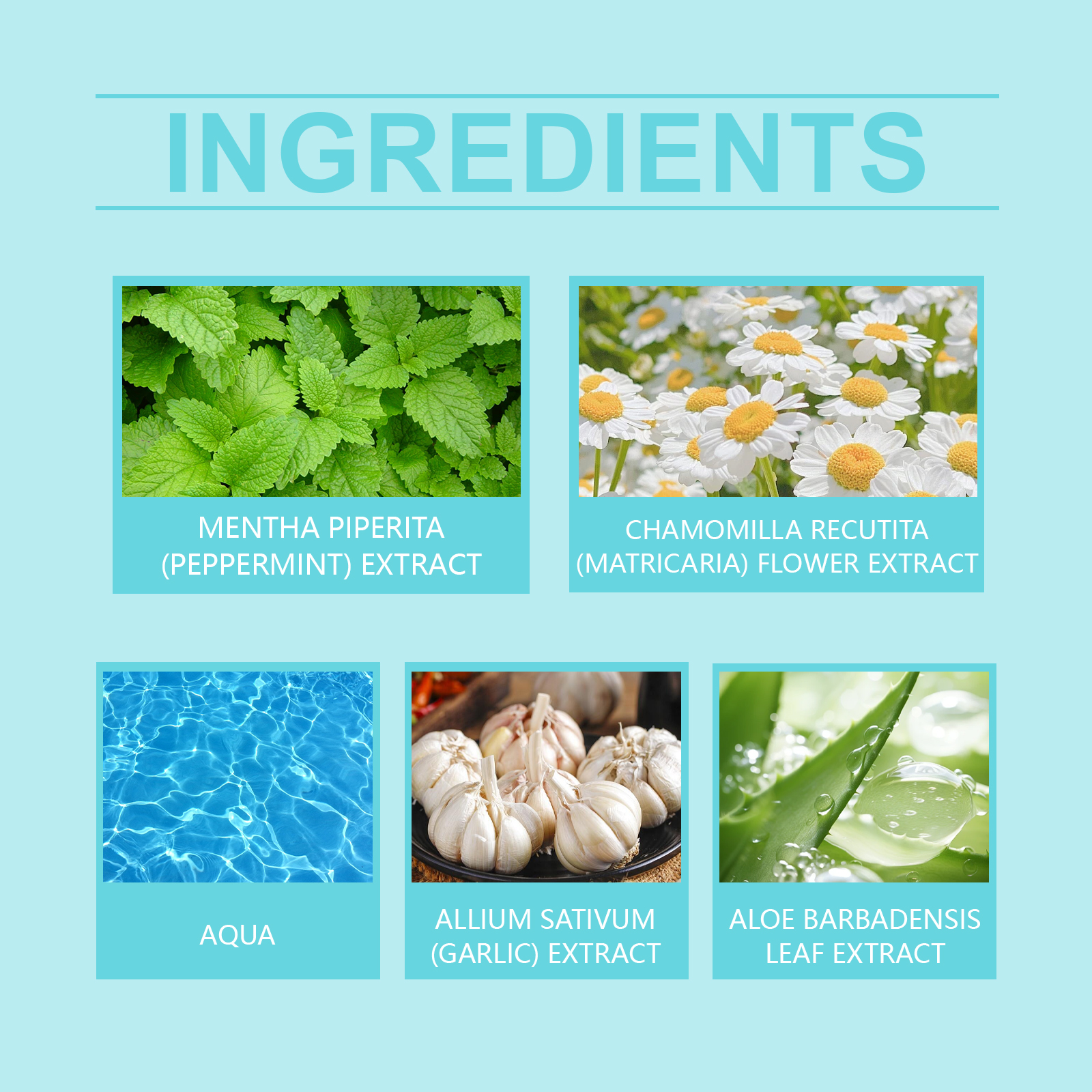 Our breath refreshing mouthwash contains aloe vera leaf extract, garlic extract and chamomile extract. It can effectively remove bad breath and keep your breath fresh for a long time. Deep clean the mouth to restore oral hygiene. Its use is simple: 1. Take one tablespoon of this product; 2. Gargle for 2-3 minutes, then spit it out. 3. Then brush your teeth and rinse your mouth with water. Soothe the mouth and reduce irritation. Garlic juice removes bad breath and keeps breath fresh. Peppermint extract freshens breath and improves oral comfort.