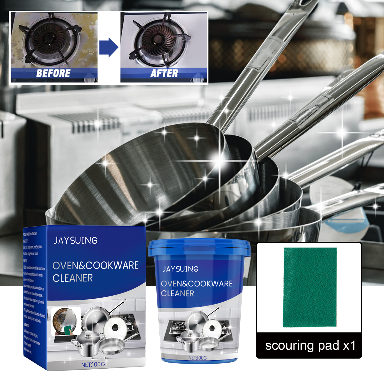 Our versatile and powerful cleanser contains baking soda, enzymes, lemon extract. It can quickly remove all kinds of stainless steel surface stubborn stains, oxide layer, rust stains, extend the service life of metal kitchen utensils; Quickly and effectively remove stubborn stains on various stainless steel surfaces, its use is simple: soak a sponge or cloth, and then wring it out; Pour appropriate amount of detergent on the stain; Then wipe repeatedly; Finally rinse with water. Easy to remove stubborn dirt, easy to use, just wipe and rinse, to get a mirror-like shiny effect on kitchen utensils.