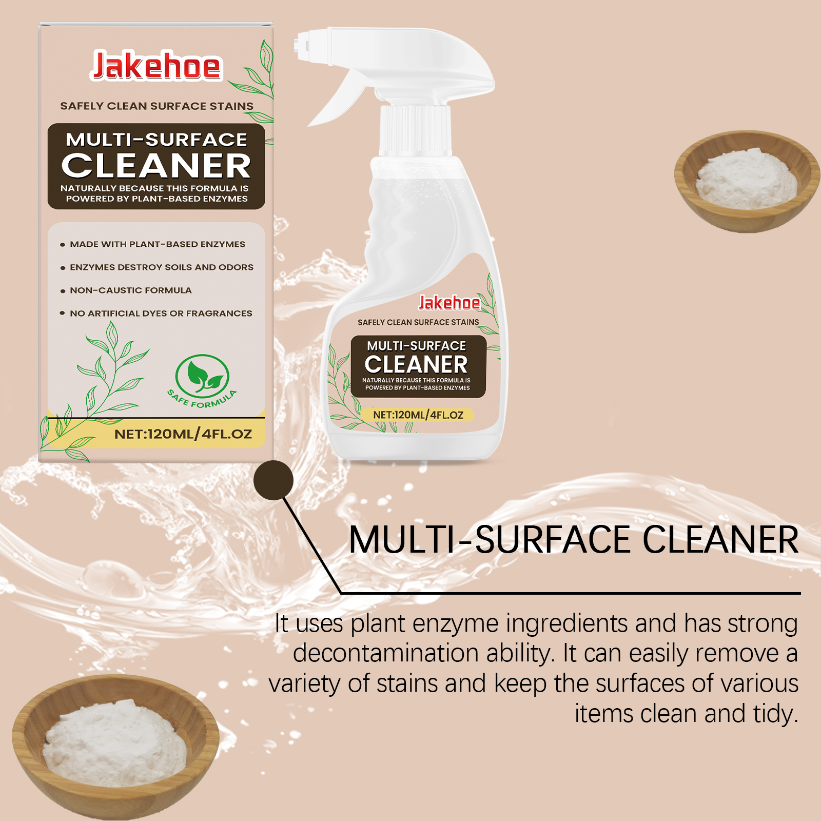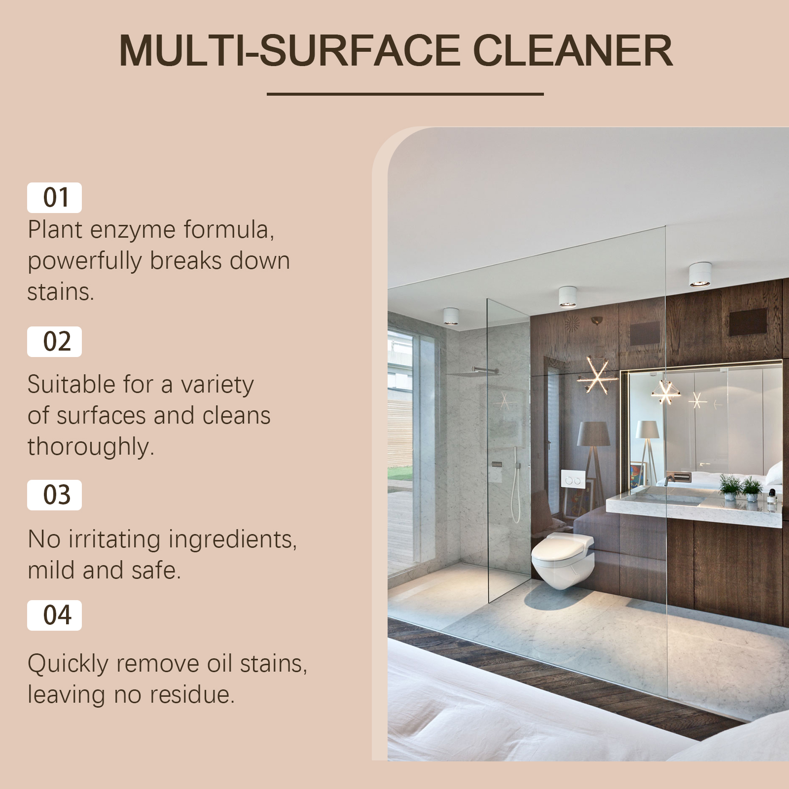Our multi-surface cleaners contain plant enzymes, sodium bicarbonate, lauryl ether 7. It can quickly break down dirt and odor, safely clean various surfaces, and protect the environment. Its use method is very simple: 1. Spray the cleaner on the part that needs to be cleaned, and wait for 1 minute to dissolve the stain; 2. Wipe the remaining area of the stain, and finally rinse off the foam with water. Whether it's the bathroom. Kitchen, countertop, floor or wood, it can provide an efficient deep cleaning effect.
