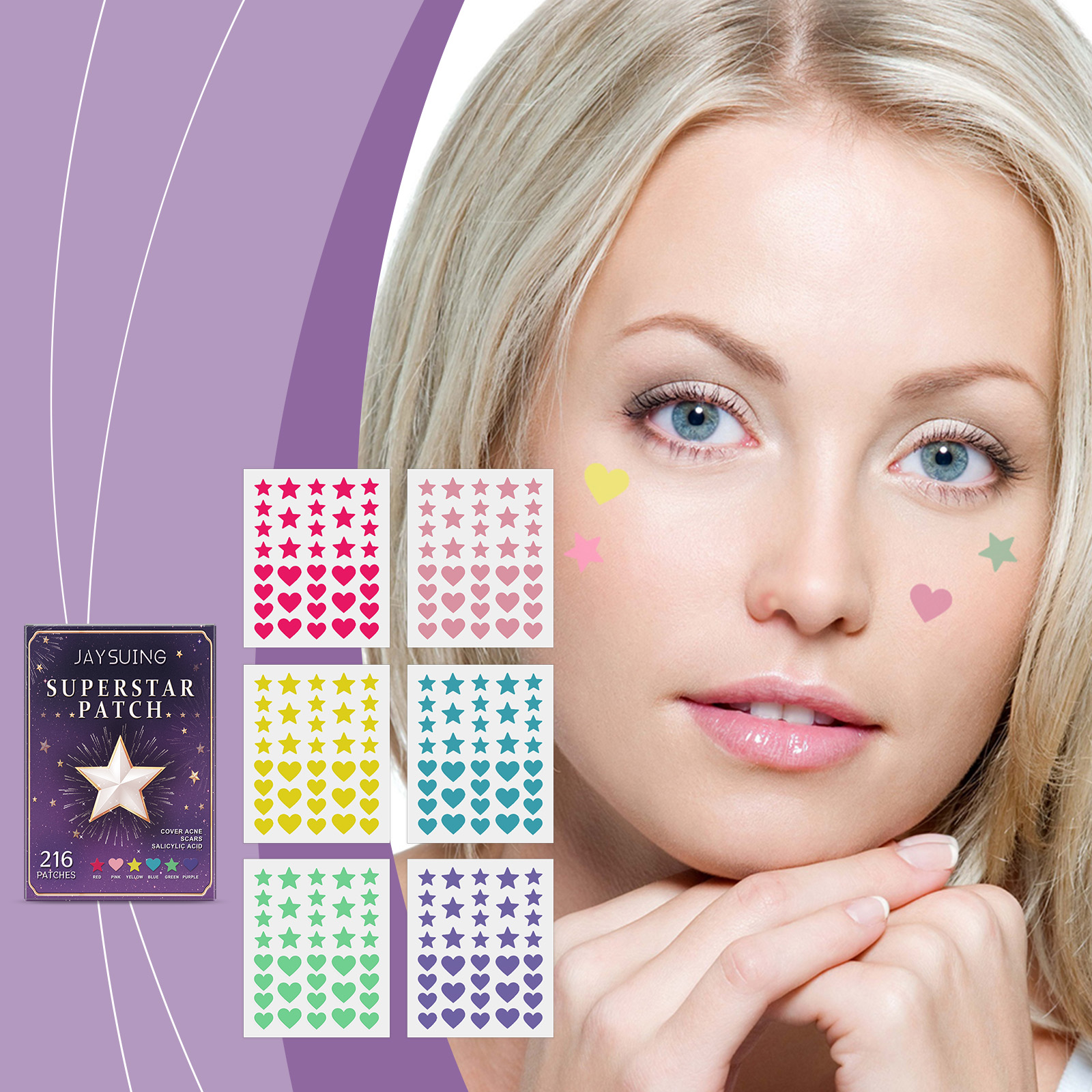 Our multi-colored invisible acne patch contains salicylic acid, scutellaria root extract and tea leaf oil. It can fit the skin, directly act on acne, accelerate acne maturation and reduce scar formation. Its application is simple: 1. Clean and dry the skin on the acne area; 2. Take a patch and apply it to the pimple; 3. Wait 6-8 hours before uncovering. Firmly fit, form a protective layer, soothe skin, continue to play the effect, keep skin comfortable.
