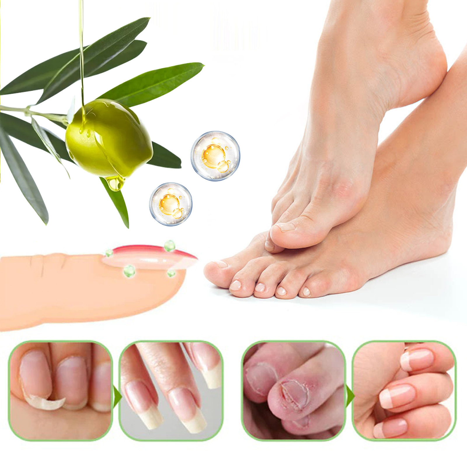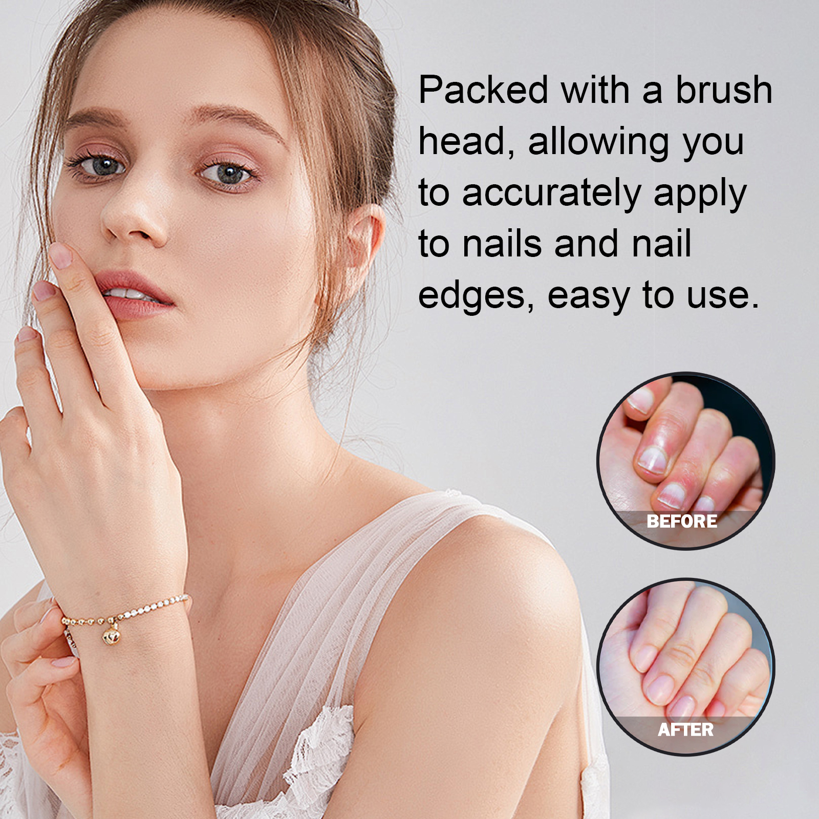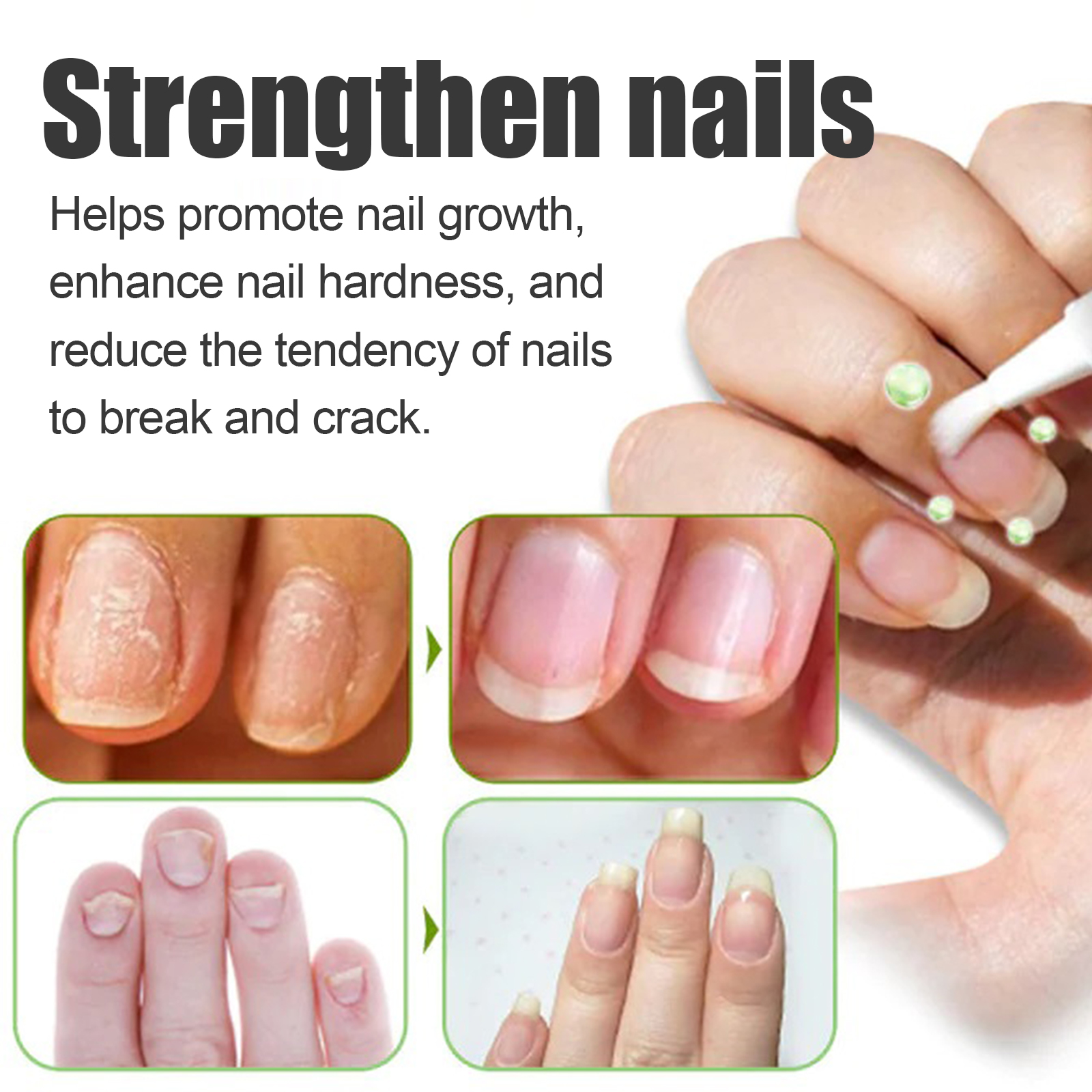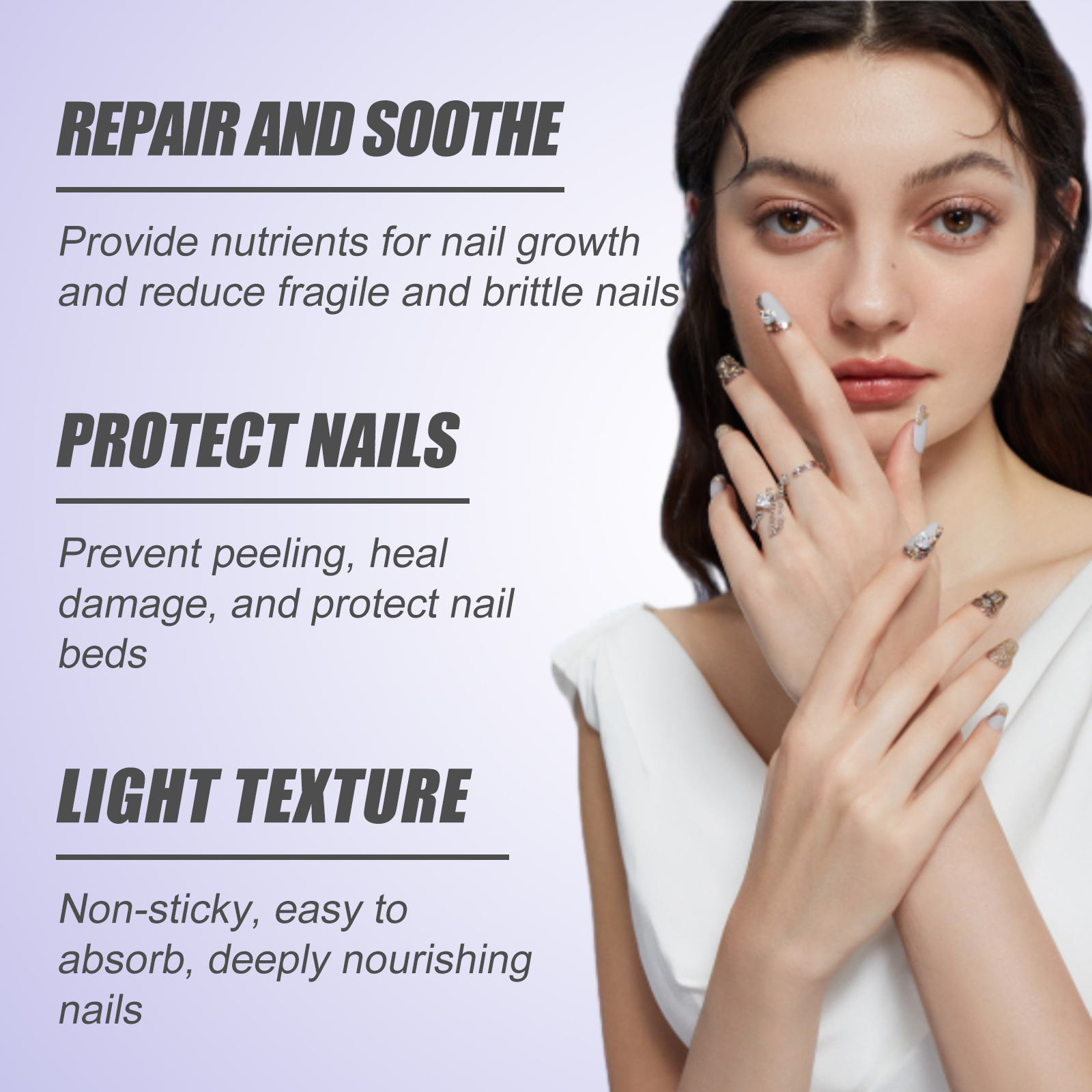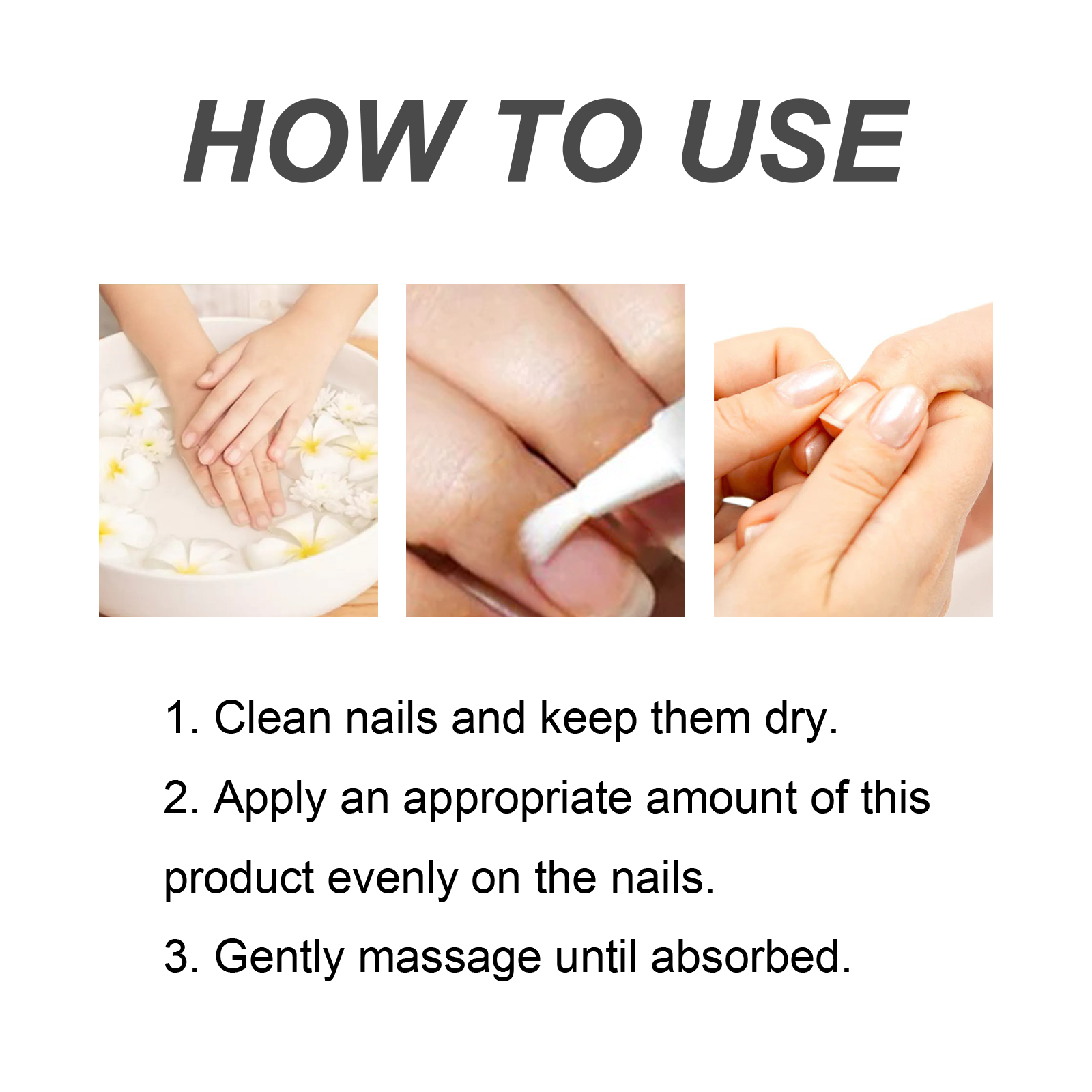 Our nail care serum contains Jojoba seed oil, orange peel oil. It can provide nutrients for nail growth and reduce fragile and brittle nails. The way to use it is simple: 1. Clean your nails and keep them dry. 2. Apply proper amount of the product to the nails. 3. Gently massage until absorbed. It also prevents peeling, heals damage, and protects nails.