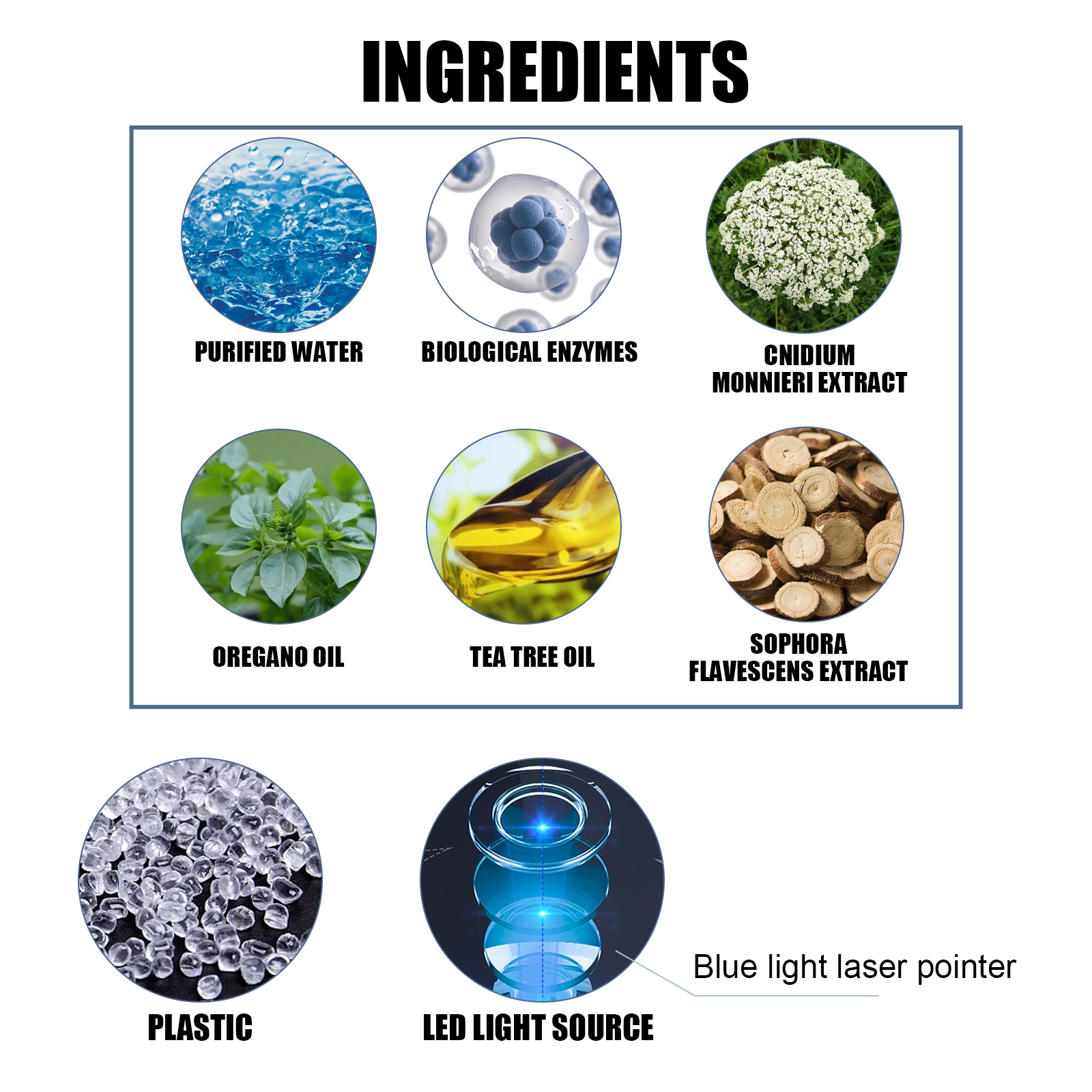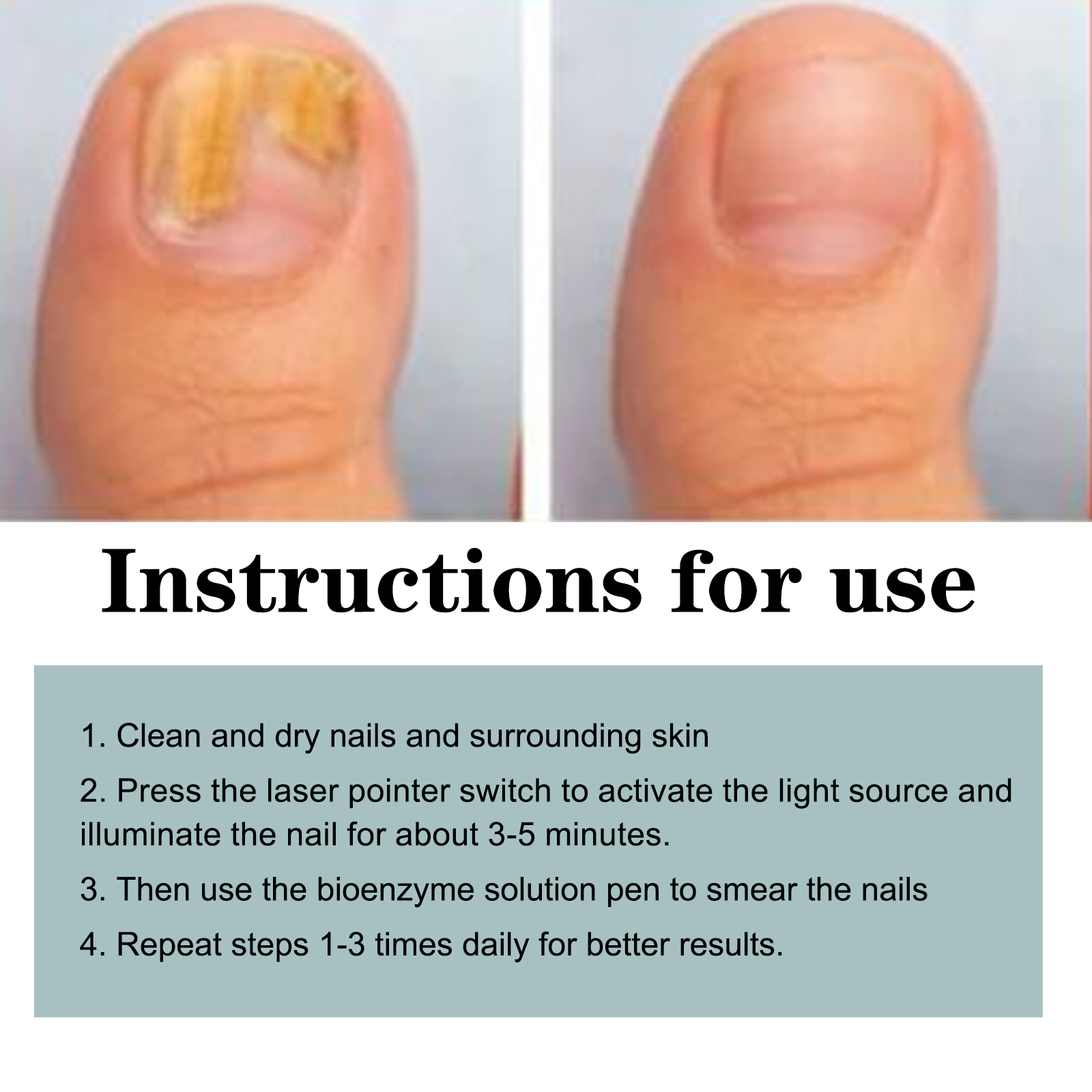 Our nail care kit includes blue laser Pointers: plastic, LED light source; Enzyme solution pen: Matrine extract, snake seed extract. It can soften buried toenails to eliminate pathogenic bacteria, hide cars and heal tissue, inhibit ingrown toenails to promote healthy nail renewal, and straighten nails. Its use method is very simple: 1. Clean and dry the nails and surrounding skin, 2. Press the laser pointer switch to activate the light source, irradiate the nails for about 3-5 minutes, 3. Then paint your nails with a bioenzyme solution pen. Repeat steps 1-3 times a day for better results. And it can relieve toenail pain.