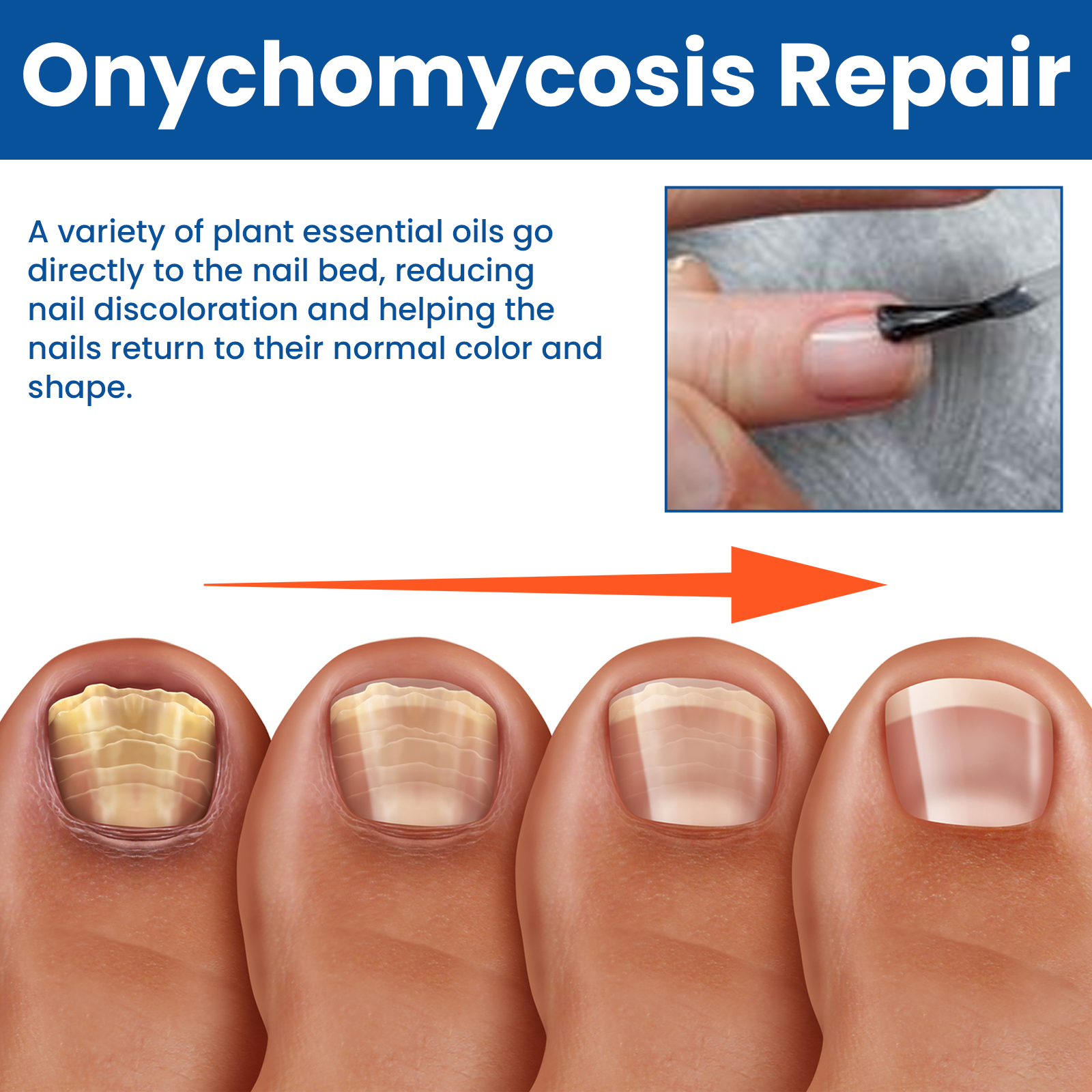 Our gray nail repair solution contains castor seed oil and sweet almond oil. It reduces the microbiome effect on the nail, deeply cleans the nail and the surrounding skin, especially the nail seam, and reduces odor and itching. Its use method is very simple: clean and dry nails and skin, with a nail file to remove excess cuticles and dirt, take an appropriate amount of essence evenly applied to the nails, gently massage with the hand in circles to absorb. A variety of plant essential oils directly remove nail beds. Reducing nail discoloration helps nails return to their normal color and shape.