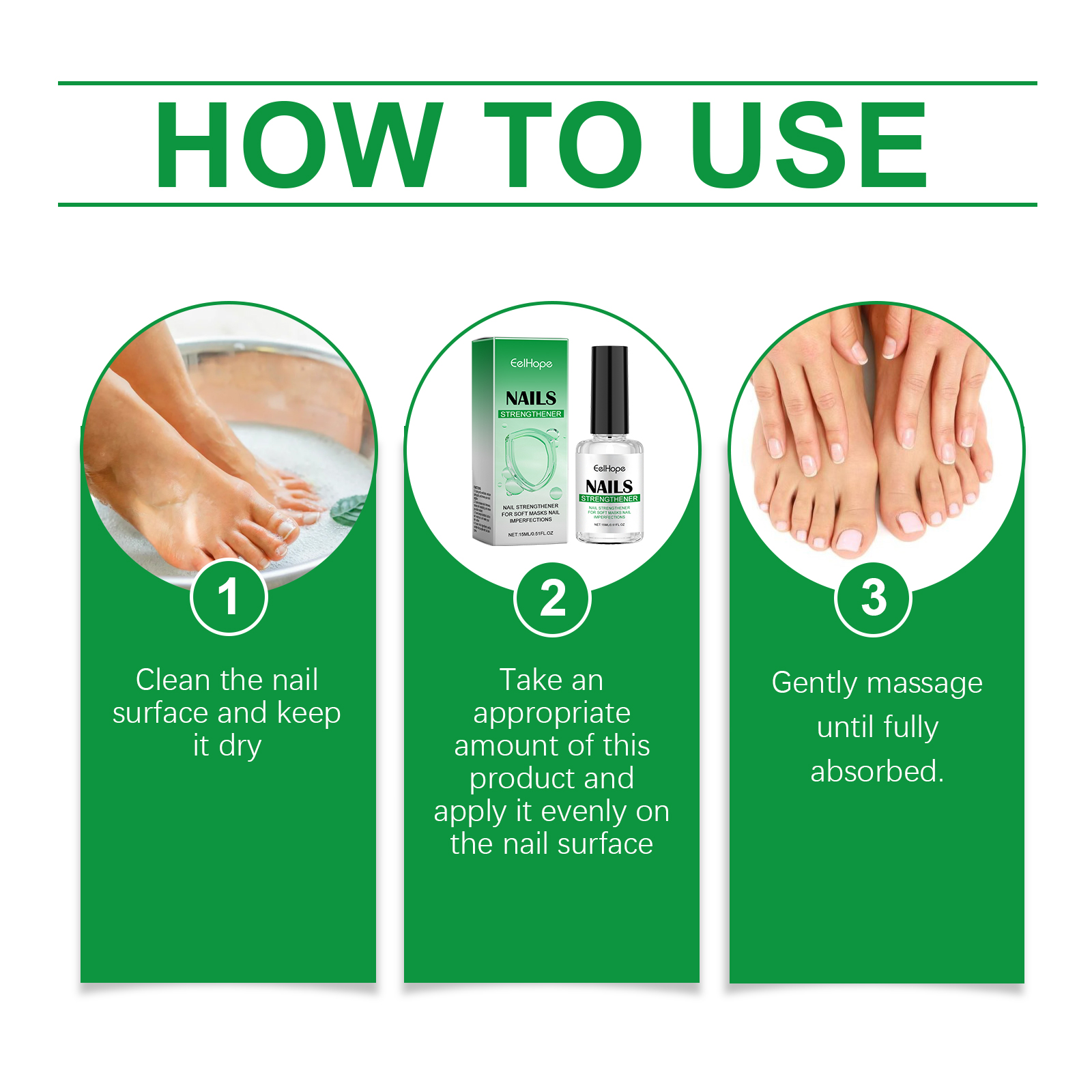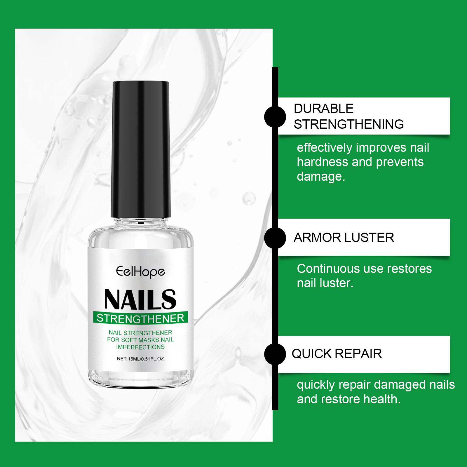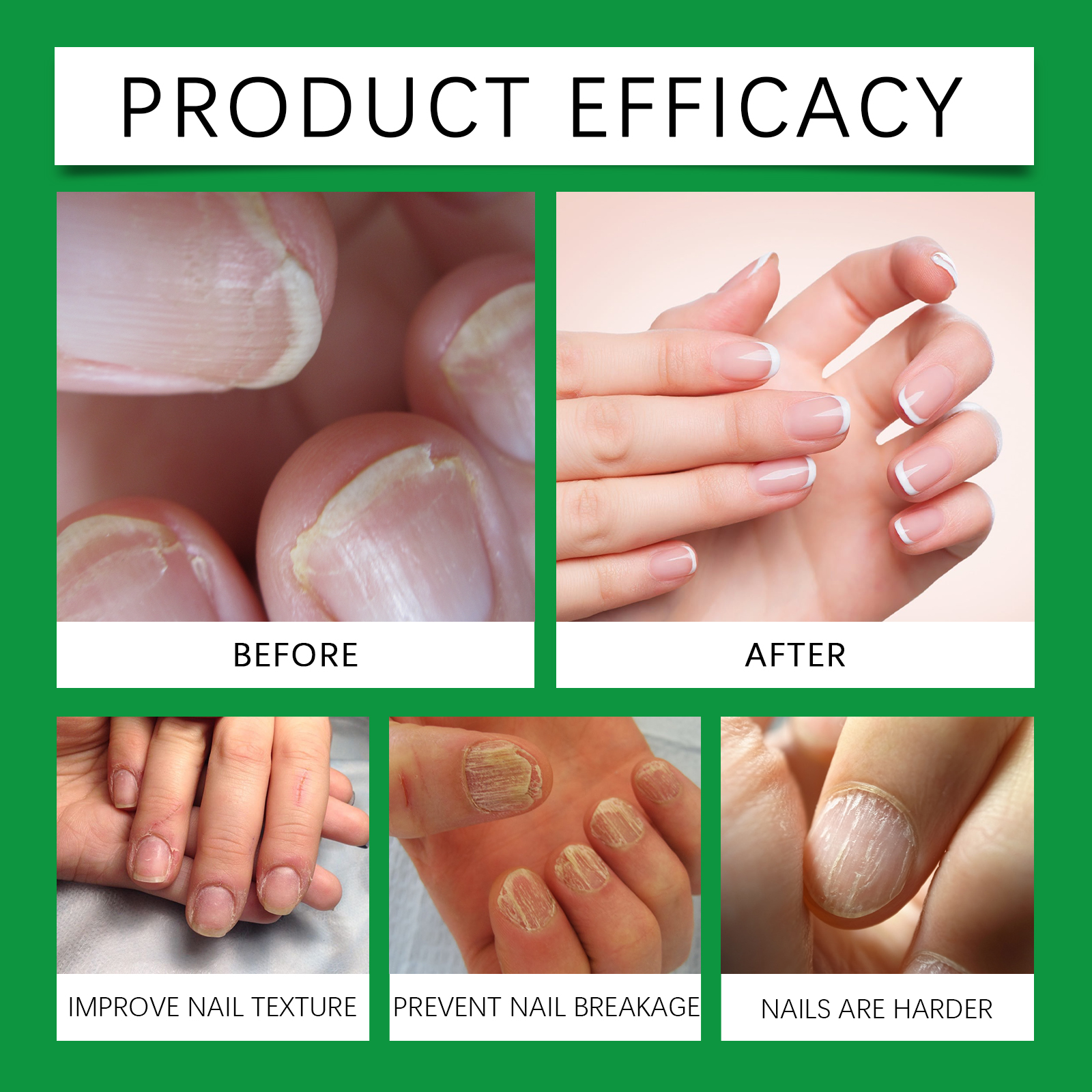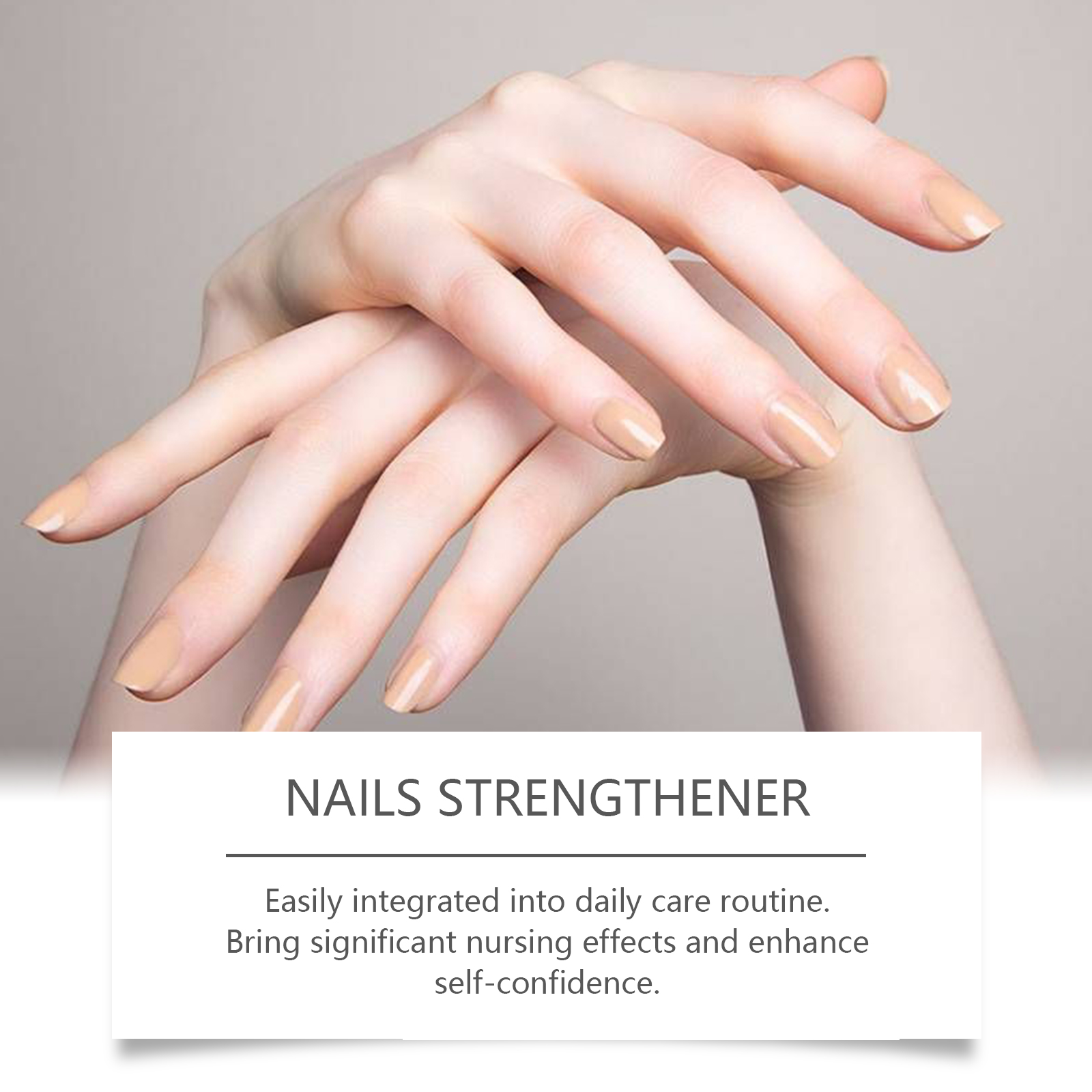 Our nail repair serum contains vitamin E, hydrolyzed wheat protein. It can improve nail texture and make nails stronger. Safe formula for all skin types. Its application method is very simple: clean the nail surface and keep it dry, take an appropriate amount of this product, evenly apply to the nail surface, gently massage until completely absorbed. It can also enhance shine and make nails look healthier.