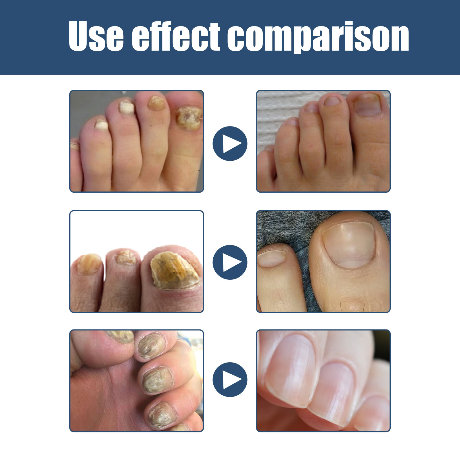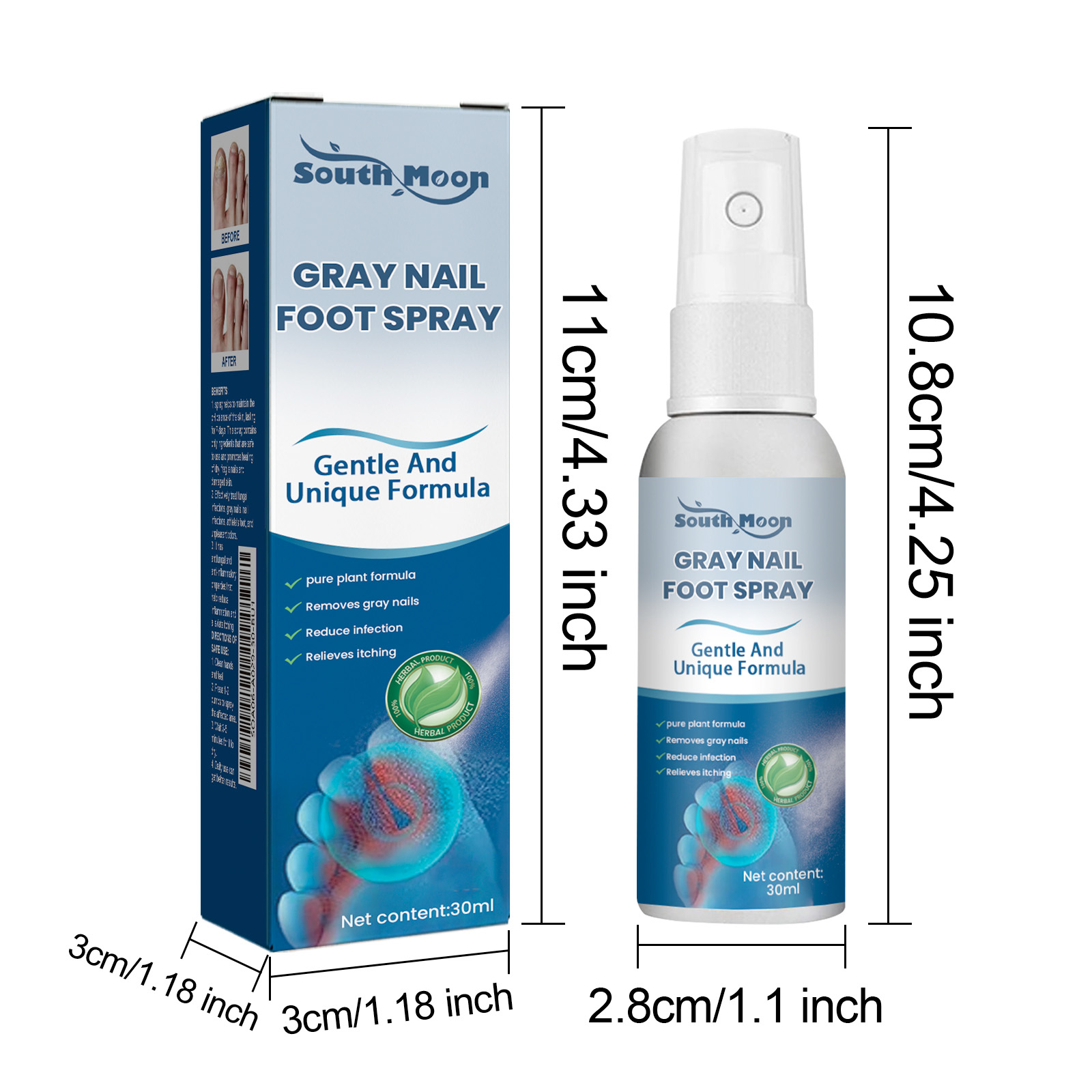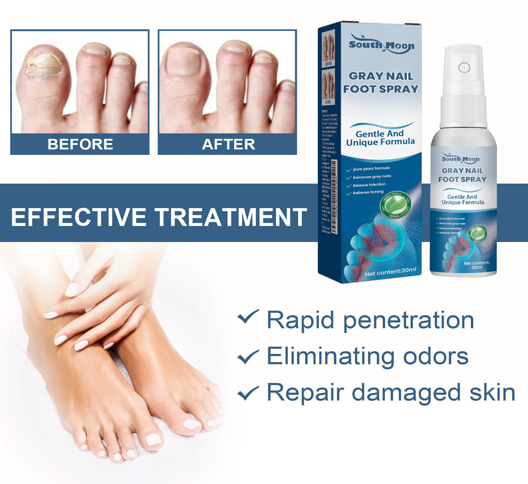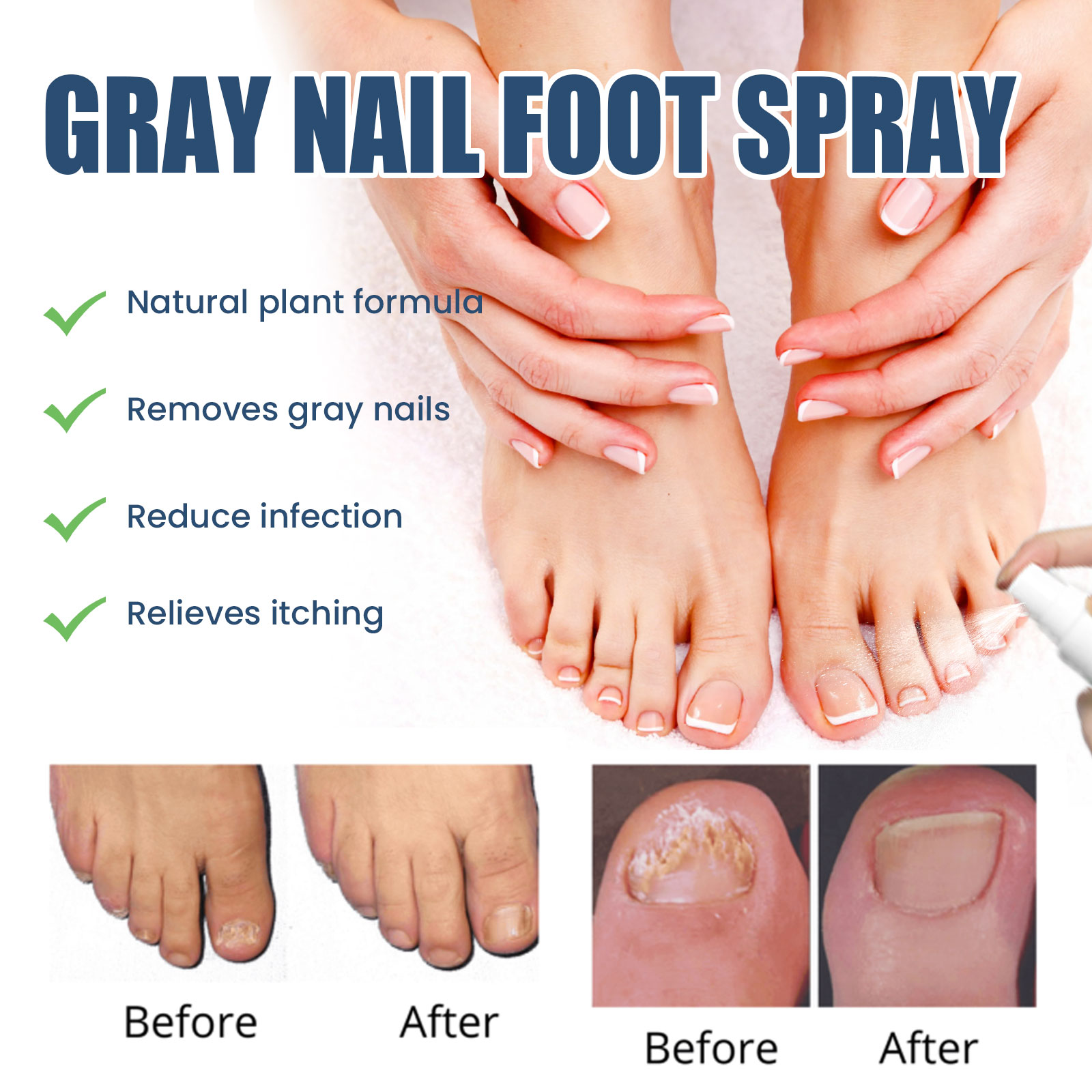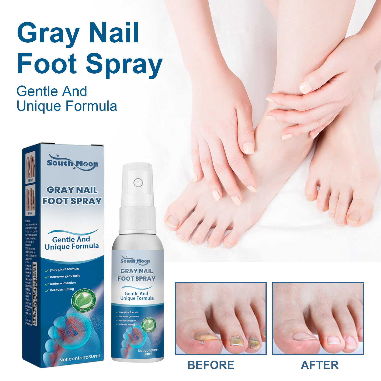 Our gray nail spray contains acetic acid, disodium EDTA, and Melaleuca alternata oil. It can promote the healing of dry, fragile nails, repair damaged skin, eliminate odor, its use method is very simple: after washing and drying hands and feet, press 1-2 pump spray on the affected area, wait 3-5 minutes to let it absorb, daily use can get better results. Remove gray nails, reduce bacterial infections and relieve itching.