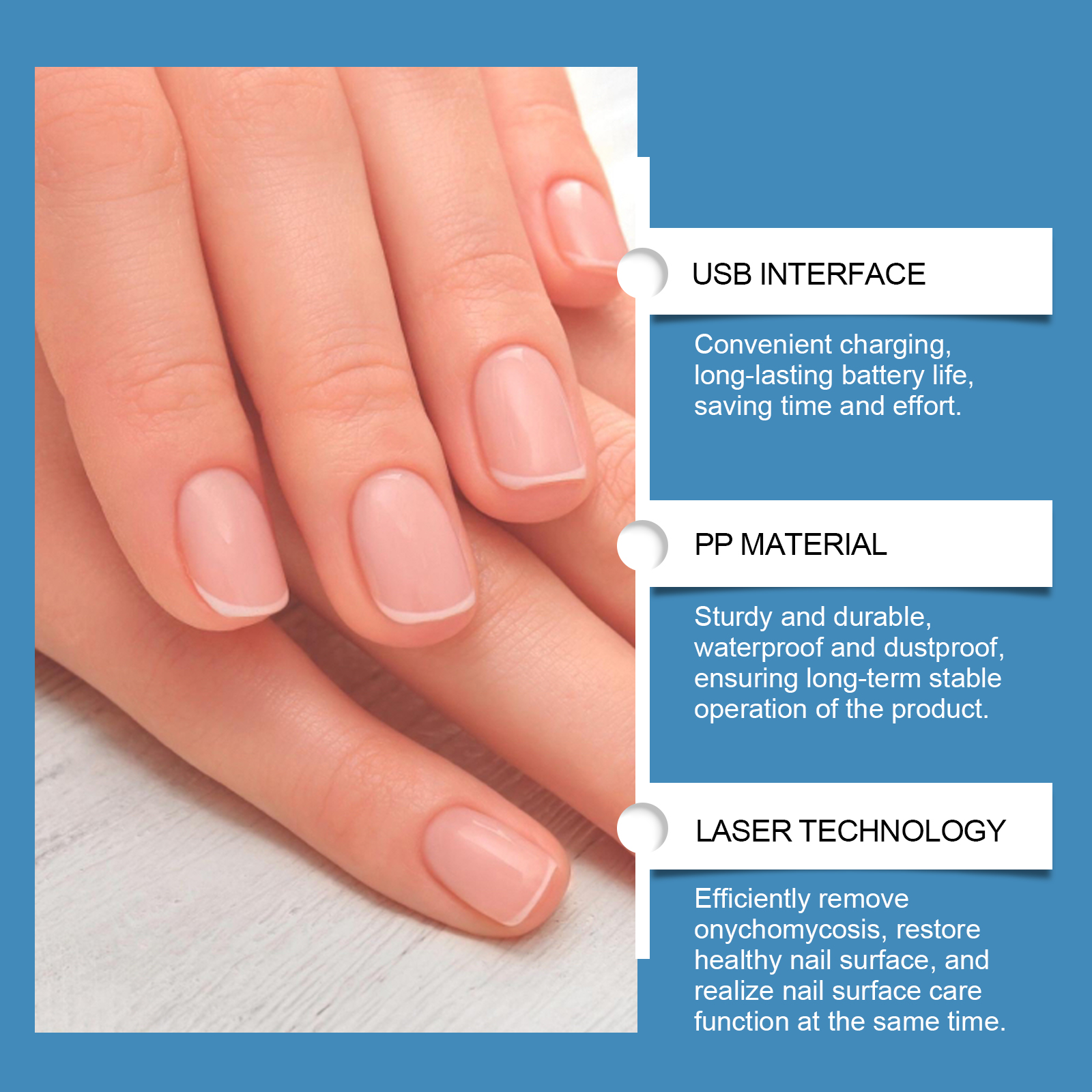 Our nail repair machines contain PP. It can gently promote nail growth and repair damaged nails. Reduce discomfort and swelling, and restore beautiful nail shape. Its use is simple: 1. Clean and dry the nails and surrounding skin; 2. Turn on the switch to activate the product; 3. Place your nails under a light for 10 minutes and use daily. Through laser precise penetration of the deck, effectively enhance the resistance of the nail, forming a protective layer on the surface of the nail, fundamentally protect the health of the nail.