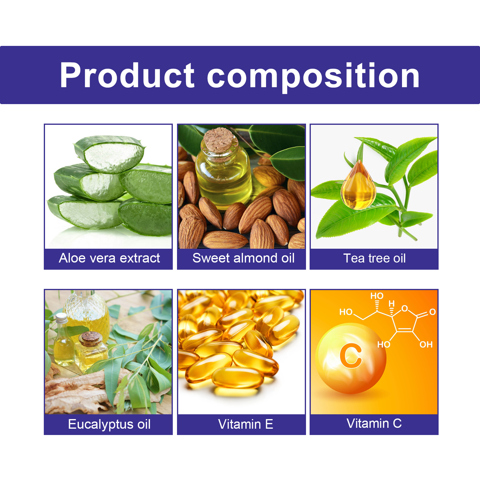Our nail lotion contains aloe vera extract, tea tree oil, eucalyptus oil. It can soften and repair dry nails, strengthen and nourish nails, help eliminate fungus that affects nails, and repair damaged or discolored nails. The way to use it is simple: First remove the lid and soak in hot water for 5 minutes, then thoroughly dry your feet or hands. Use nail clippers and files to remove as much of the damaged nail as possible. Apply it to the area in need of repair. Apply 1-2 times a day, depending on the condition of your nails. After use, it will help repair nail discoloration, repair keratin nail cells and the dermis under your toes and hands, and make your nails look clear and healthy again.