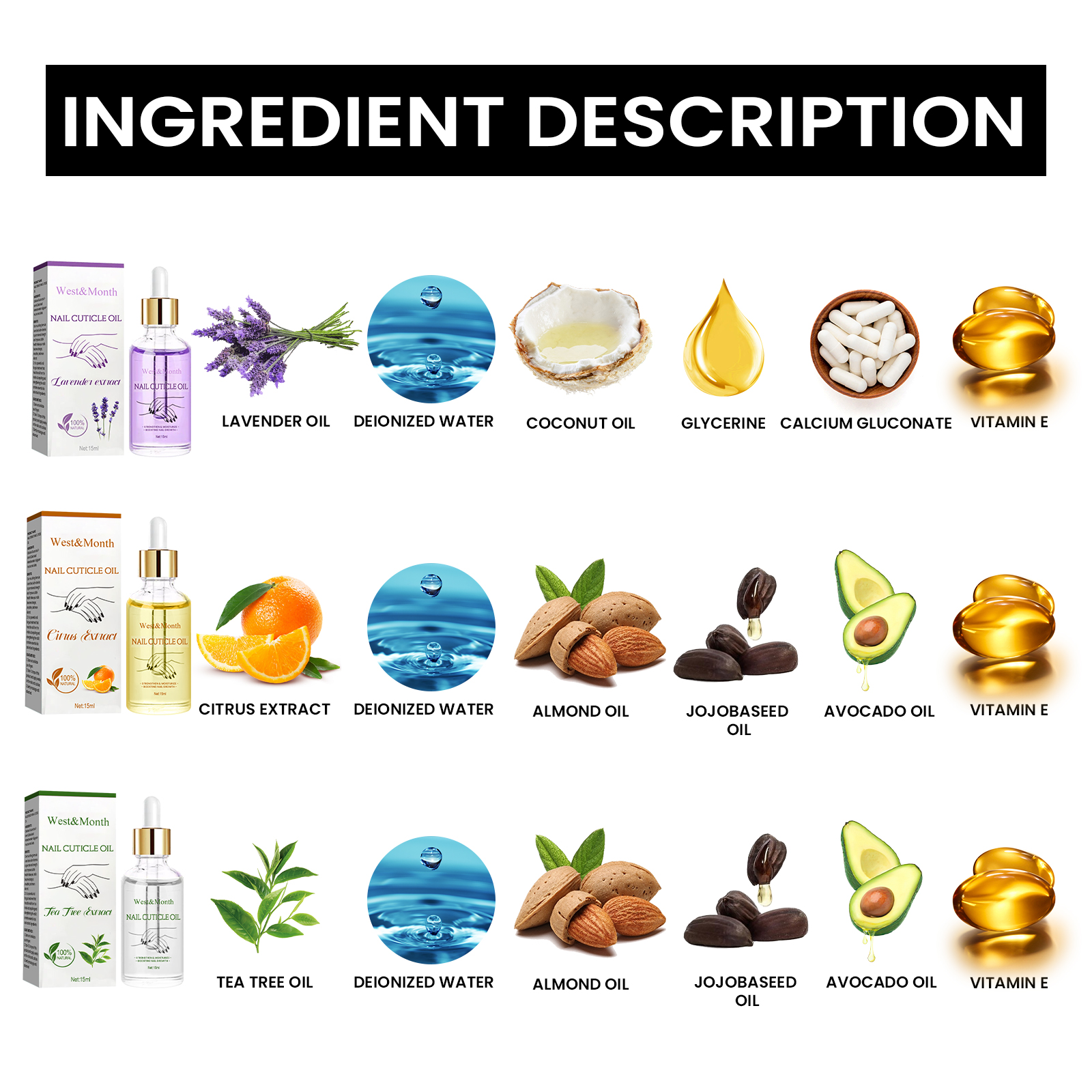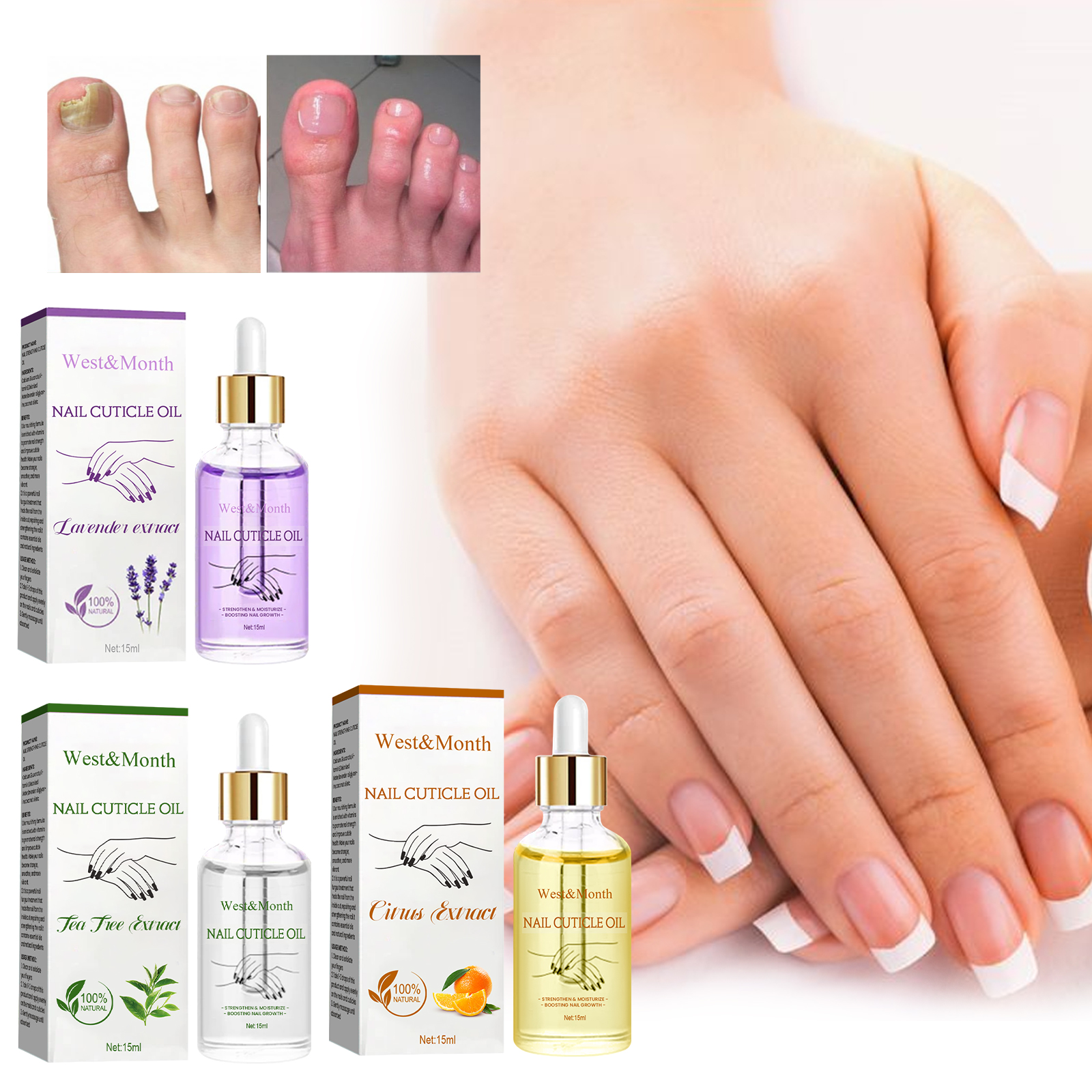 Our nail strengthening cuticle oil contains calcium gluconate, vitamin E, deionized water. It can protect nails from damage, promote rapid nail growth and avoid flaking, increase flexibility and improve appearance, deeply moisturize and nourish nails. Its application method is very simple: clean the nail surface, take 1-2 drops of this product evenly apply to the nail and skin, gently massage until absorbed. Inhibit fungal growth, prevent the spread of bacteria, make the nail thickness normal, promote nail regeneration.