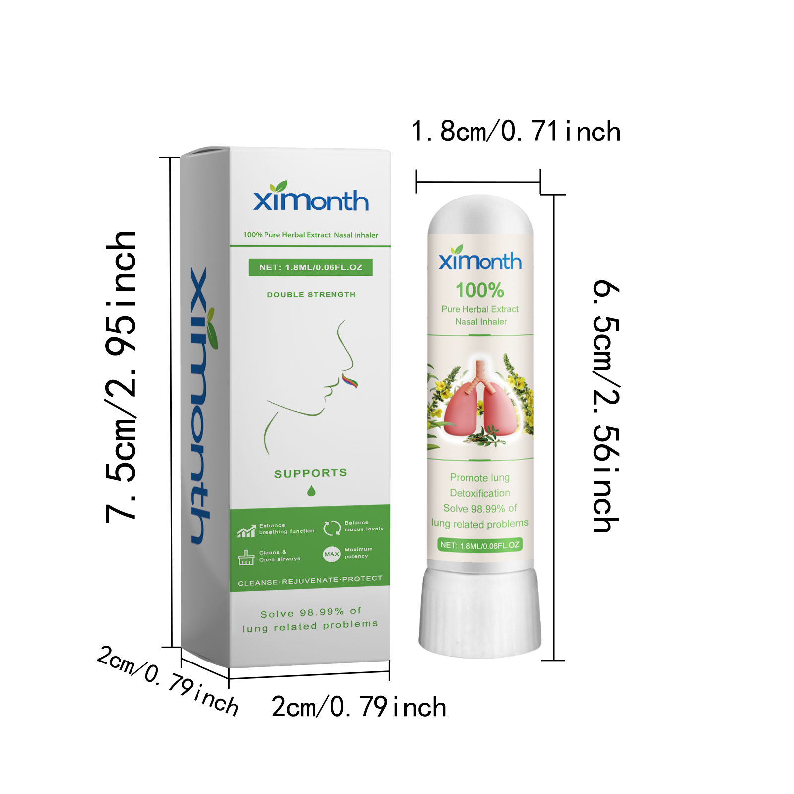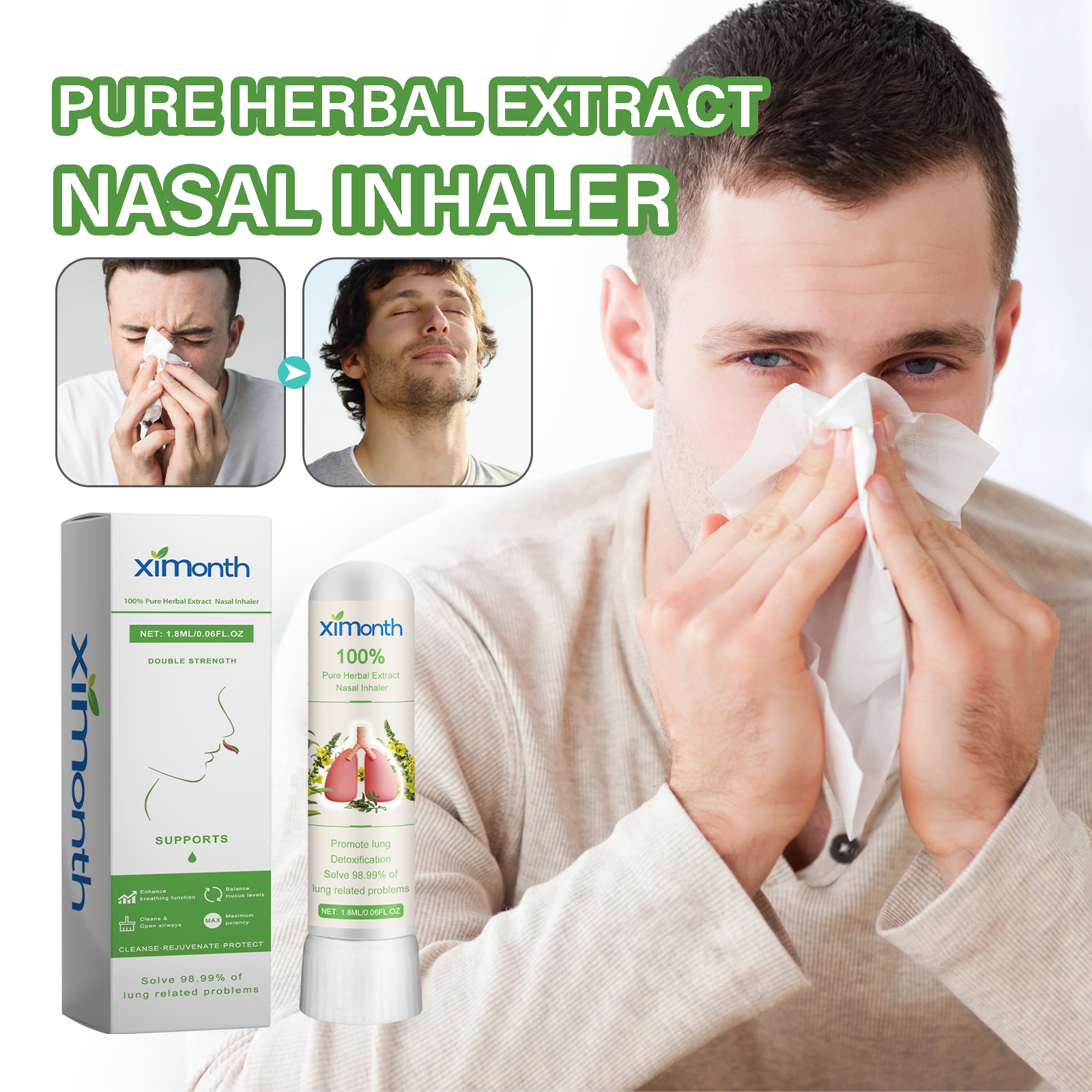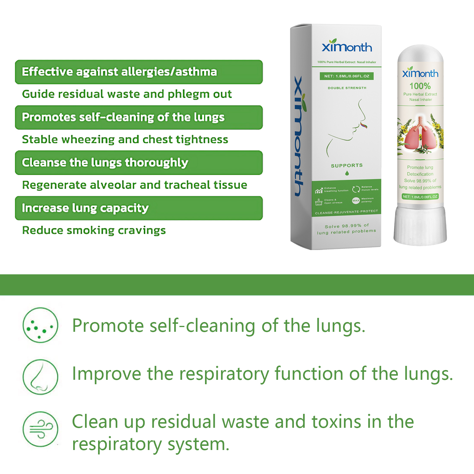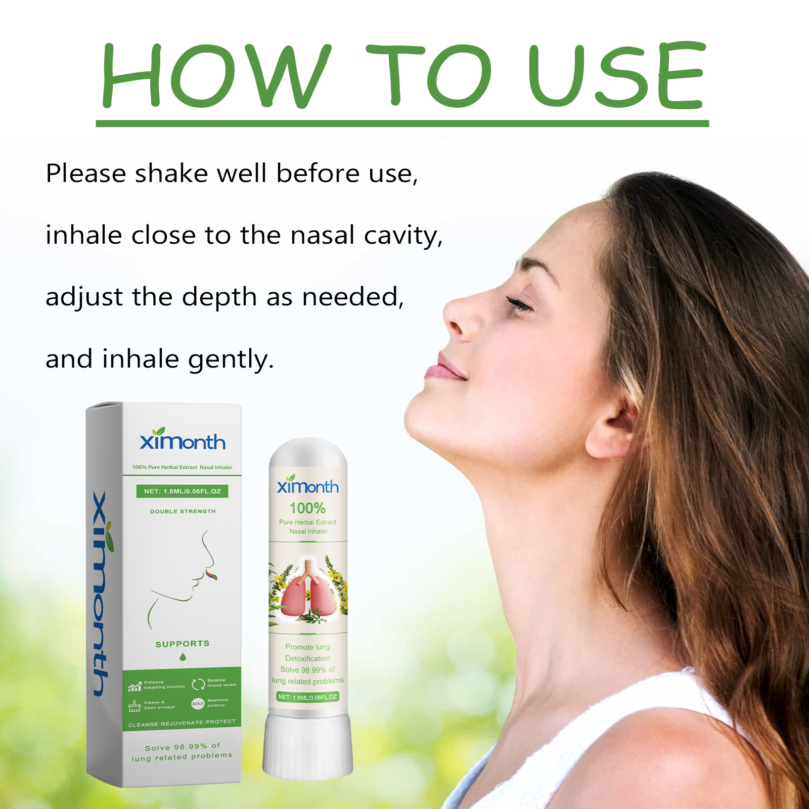 Our Pure Herbal Extract Nasal Inhaler contain Verbascum Thapsus Extract, Dend-Robium Nobile Extract, Collagen. It can help expel bacteria and viruses from the respiratory tract, support respiratory health, help strengthen the immune system, and restore youthful vitality. The way to use it is very simple: shake well before use, inhale close to the nasal cavity, adjust the depth as needed, and inhale gently. It can effectively combat allergies/asthma, guide residual waste and sputum discharge, promote self-cleaning of the lungs, and thoroughly clean the lungs.
