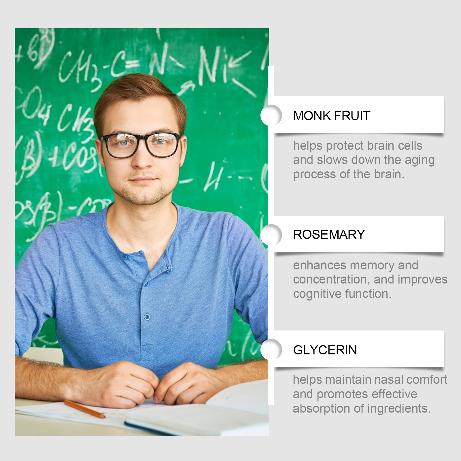 Our inhaler contains monk fruit, rosemary and lavender oil. It can stimulate the nervous system through snorting, helping to enhance brain function and improve mental agility. Consistent use helps reduce the risk of Alzheimer's disease and maintains a sharp memory. Its use is simple: Open the product, place it under your nostrils, inhale slowly for five seconds, and exhale slowly. And it can stimulate the nervous system and improve brain activity and response.