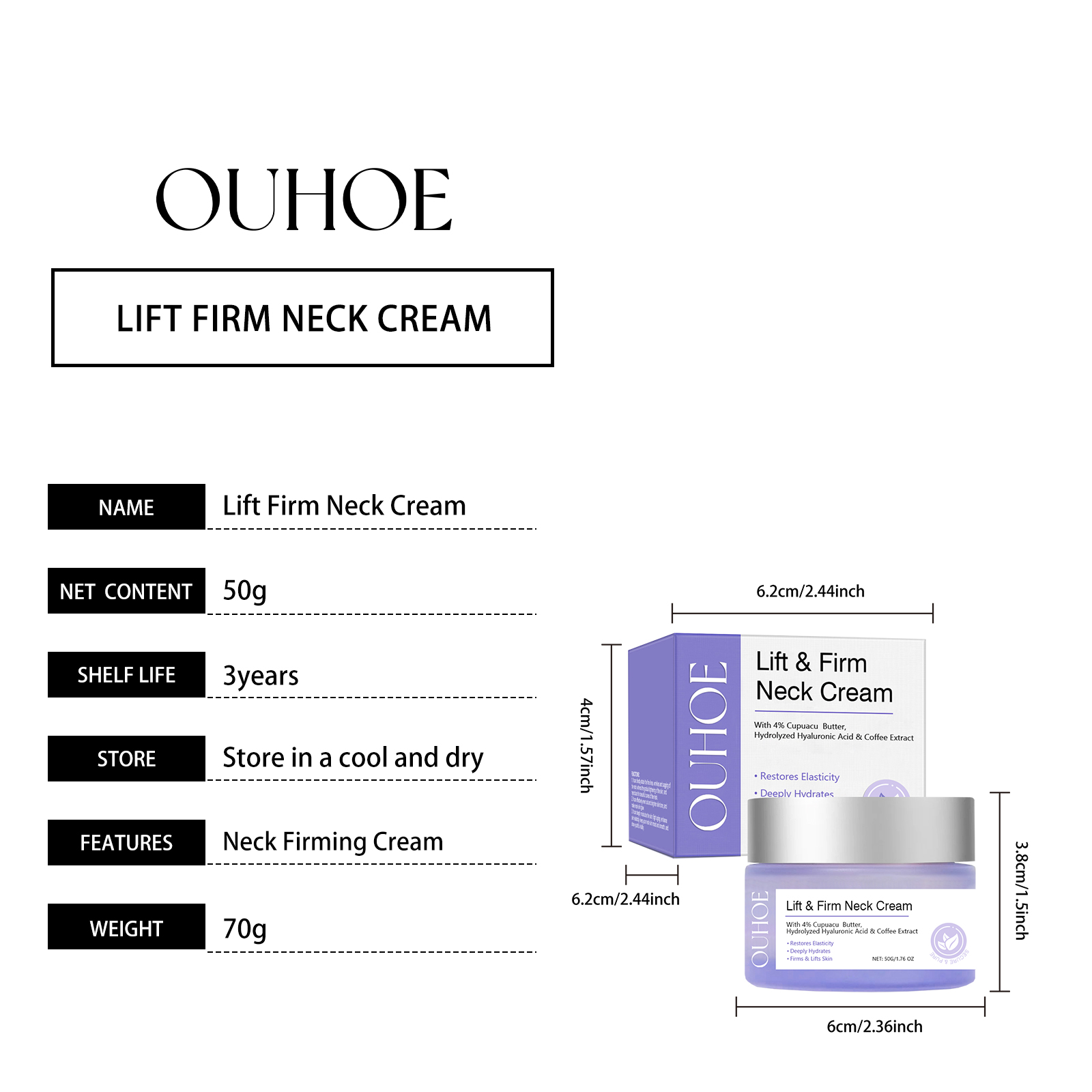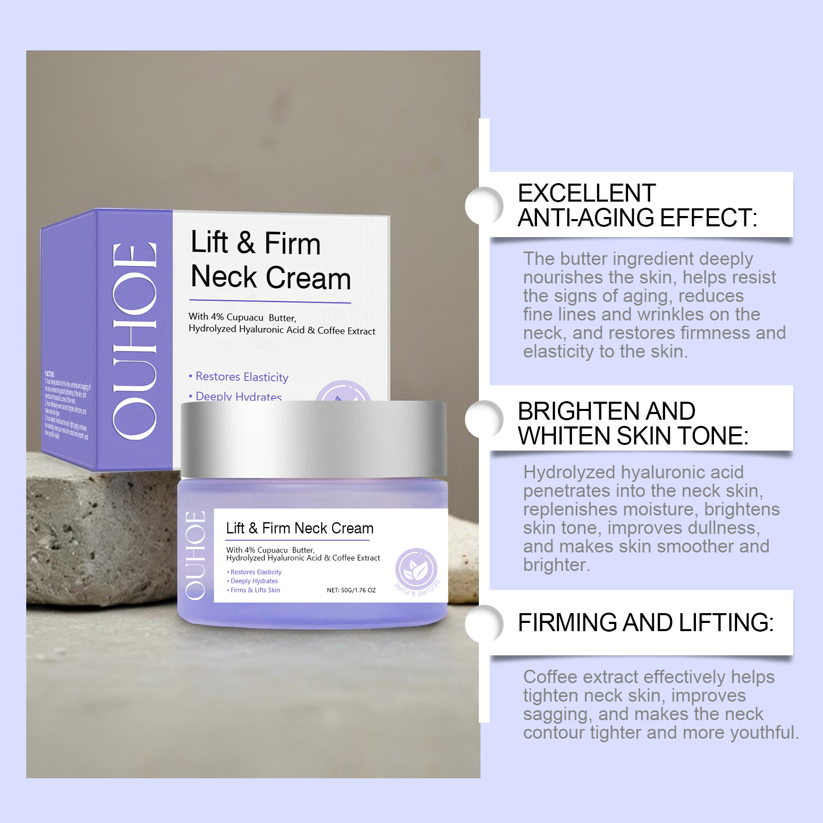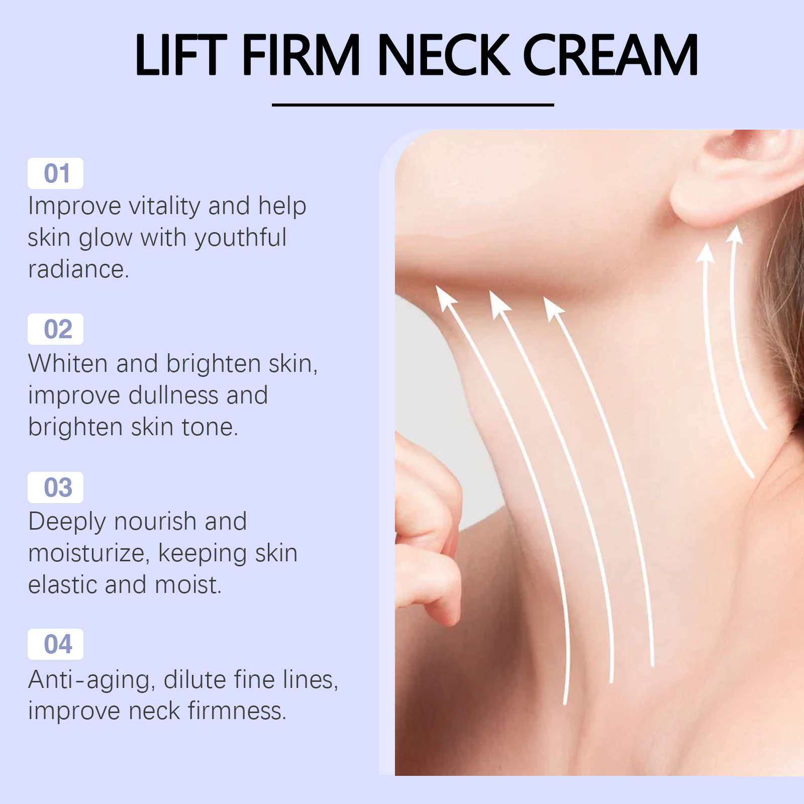 Our neck cream contains triethanolamine, coffee extract, hydrolyzed hyaluronic acid. It can retain moisture for a long time, suitable for daily care, keep the skin moisturized for a long time. Its application method is simple: clean the skin, keep the skin dry, evenly apply the product to the neck skin, gently massage until absorbed. And can make the neck skin will be more firm, full, fine lines will be significantly reduced.