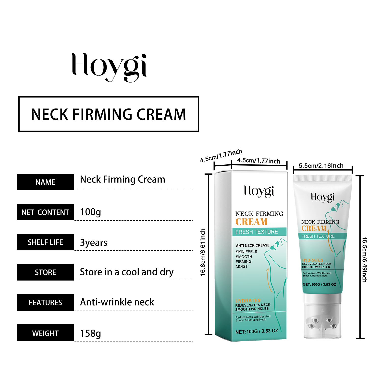 Our Neck Firming Cream contains Glycerin, Hydrolyzed Collagen, Hydroxypropyl Methylcellulose. It lightens wrinkles, tightens the skin, gives you a beautiful neck, and provides the skin with enough moisture and nutrients to moisturize, whiten, and rejuvenate. Its application method is very simple: clean and dry skin, apply appropriate amount of this product evenly on the face, neck or other parts of the body, massage the skin with the metal roller that comes with the firming cream to help the firming cream better absorb. Containing mild ingredients that do not irritate the skin, the metal roller is convenient and quick to use, easy to push on the skin, and helps the skin to better absorb.