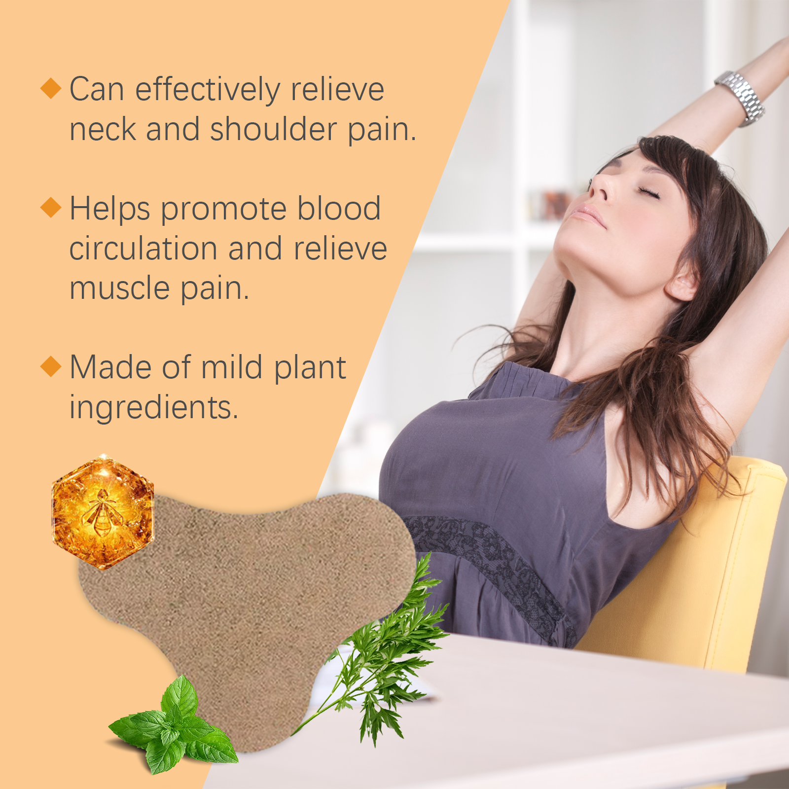 Our cervical pain relief patch contains Angelica root oil and osmanthus flower oil. It can penetrate quickly and relieve cervical and shoulder pain. Improves blood circulation, reduces inflammation and swelling, and promotes healing. Its application is simple: first thoroughly clean and dry the skin area. Place the patch on your neck, making sure it's tight to your skin. Wait 8-12 hours and then remove the patch. 'And can effectively relax tense muscles to reduce fatigue and discomfort.