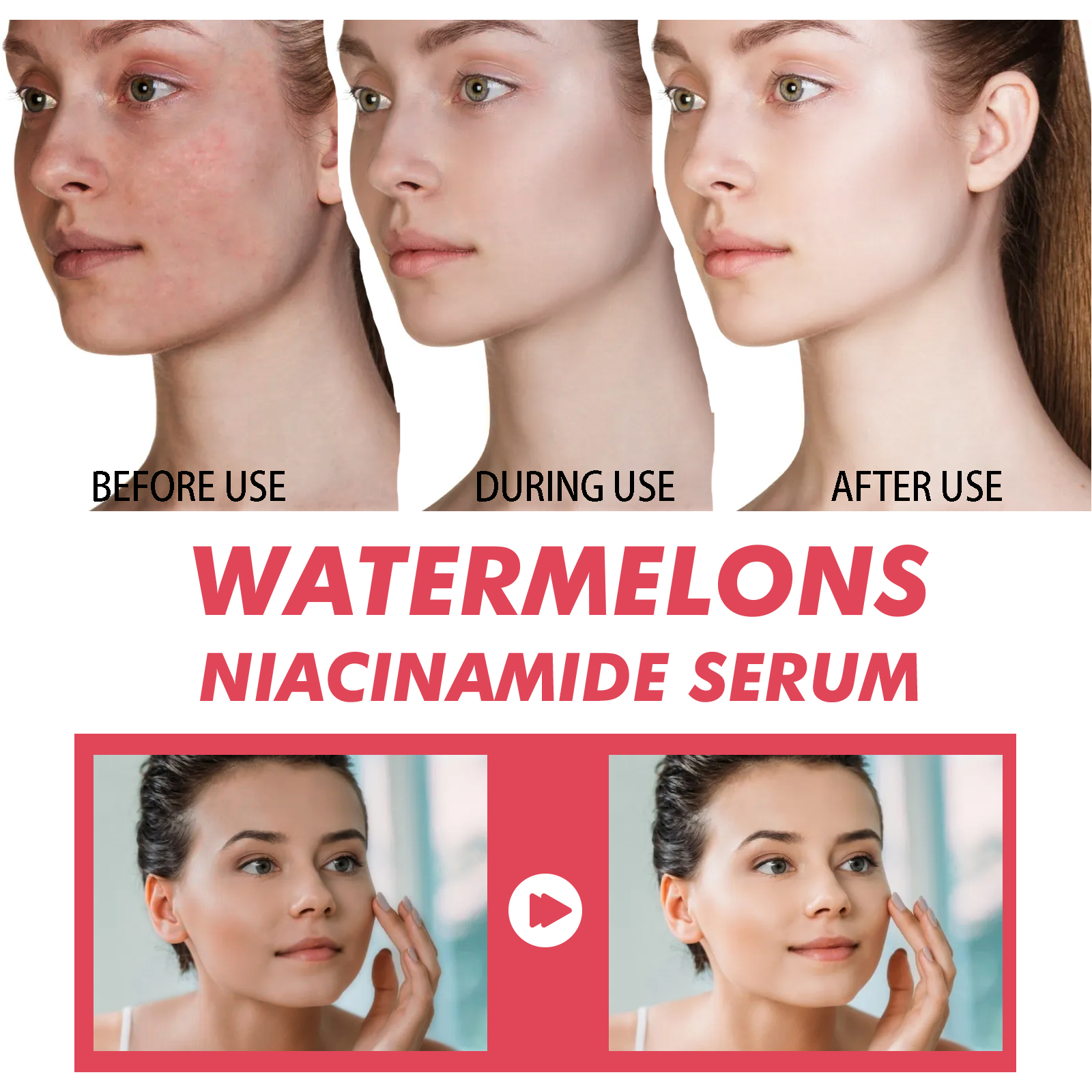 Our Watermelons Niacinamide Serum contains nicotinamide, sodium hyaluronate, nitrite. It can help to even skin tone, reduce enlarged pores, lighten skin tone, moisturize face, reduce dark spots and dull, help skin timely replenish and lock water, increase skin water content, and make skin glow. Its use method is very simple: after cleansing and toning, take 1-2 pumps of essence evenly apply on the face skin and gently massage in circles with your hand until absorbed, or mix the essence with daily skin care product foundation and use once in the morning and once in the evening for better effect. Helps balance skin tone, reduces the appearance of pores, and locks in moisture.