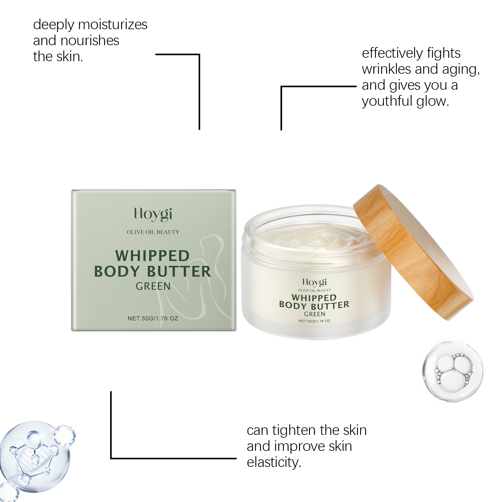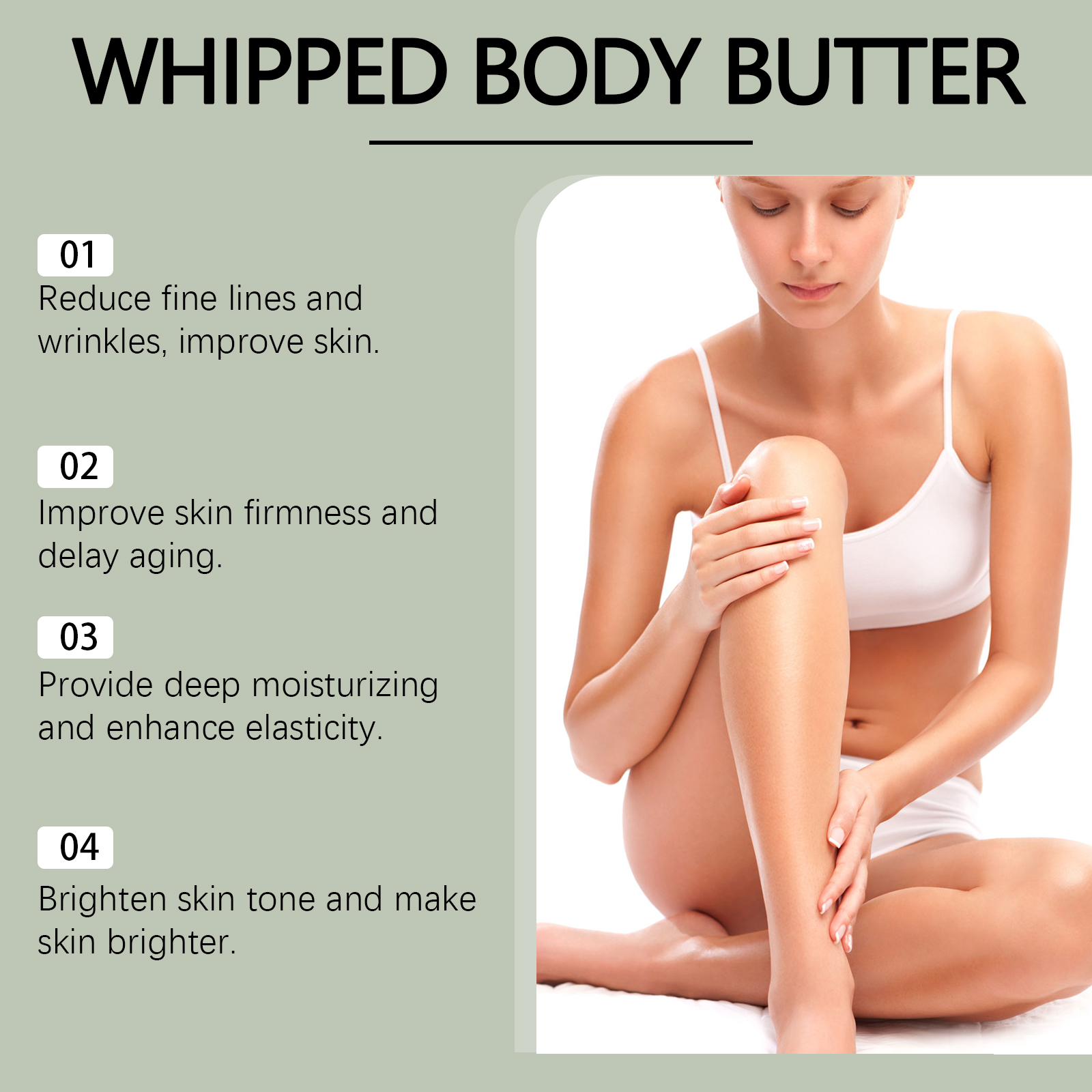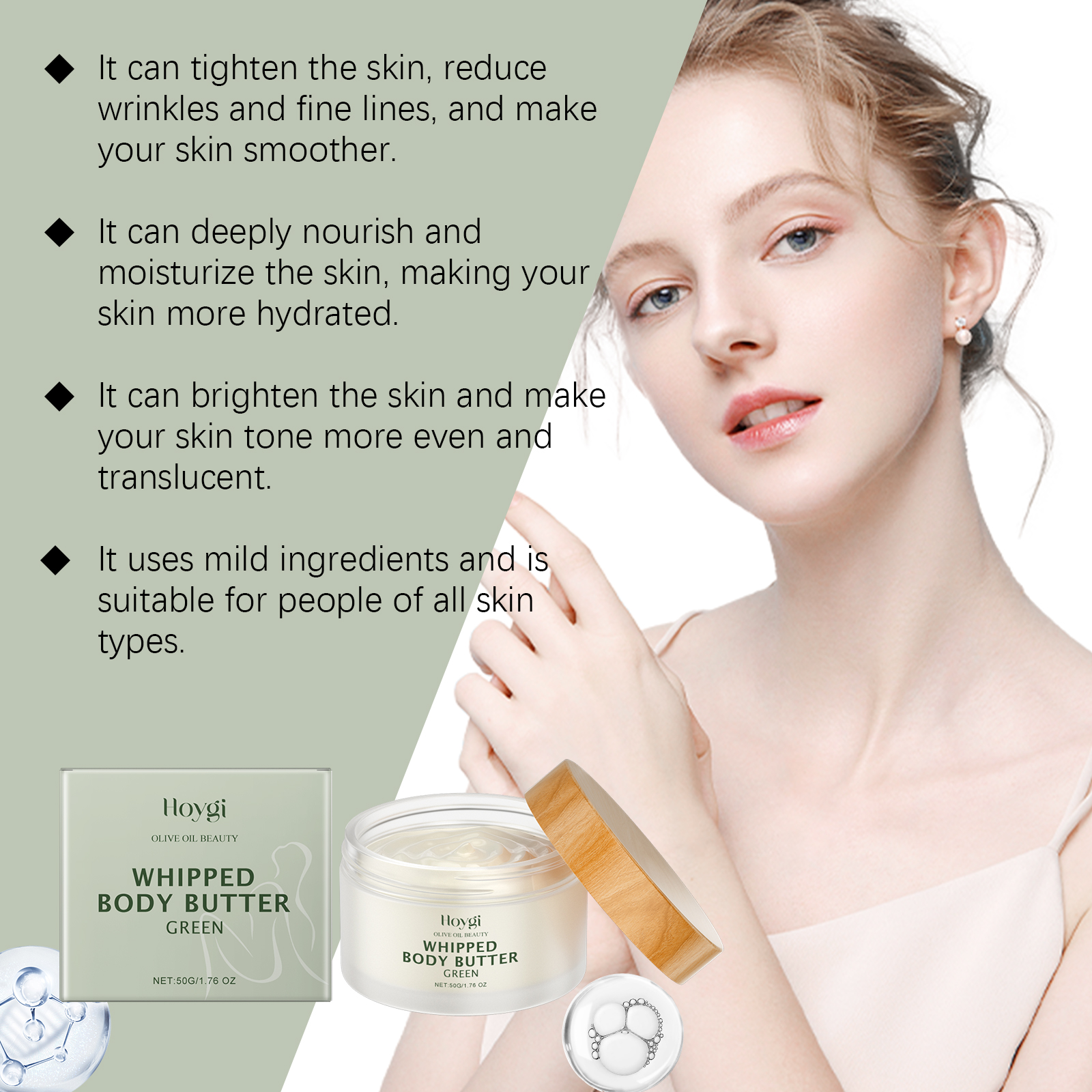 Our nourishing and firming moisturizer contains rosehip oil, collagen, acetyl tripeptide-1. It protects the skin from environmental damage. Its application method is simple: thoroughly clean and dry your skin, apply appropriate amount of this product evenly to the hands, legs and other parts of the body, gently massage to promote complete absorption. It can also improve the texture and smoothness of your skin, making you look younger.