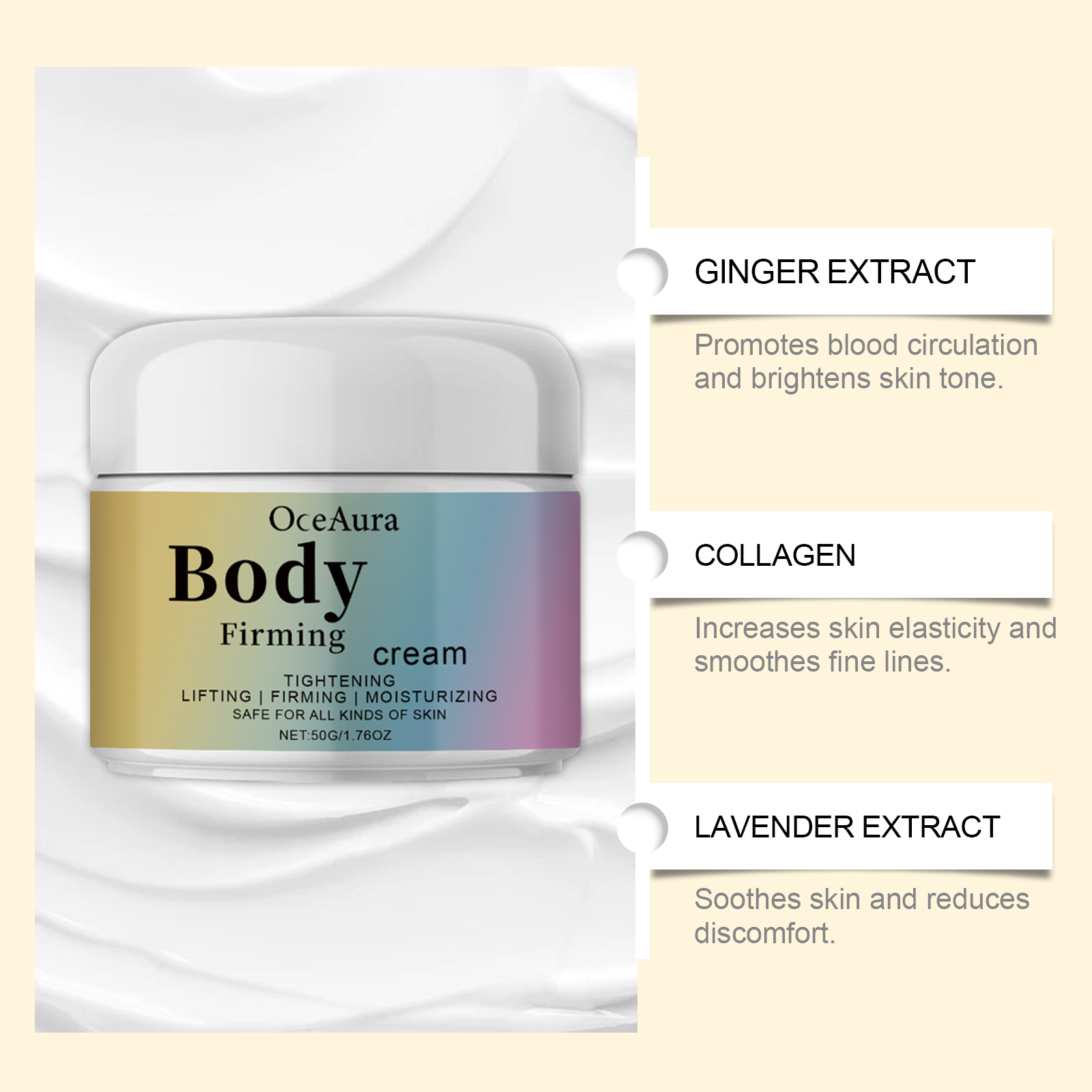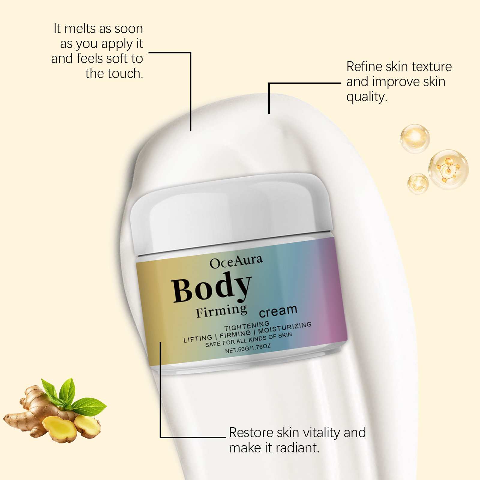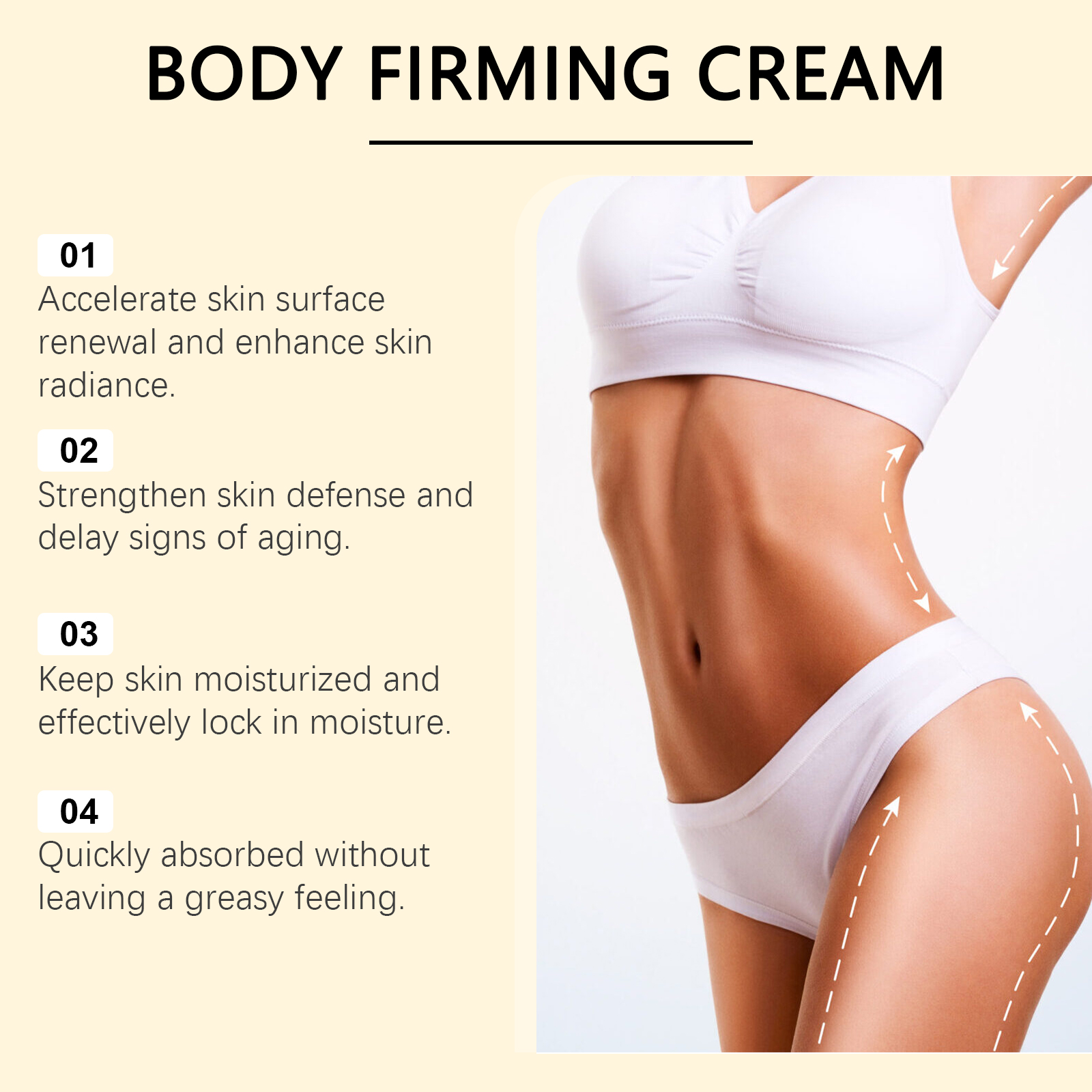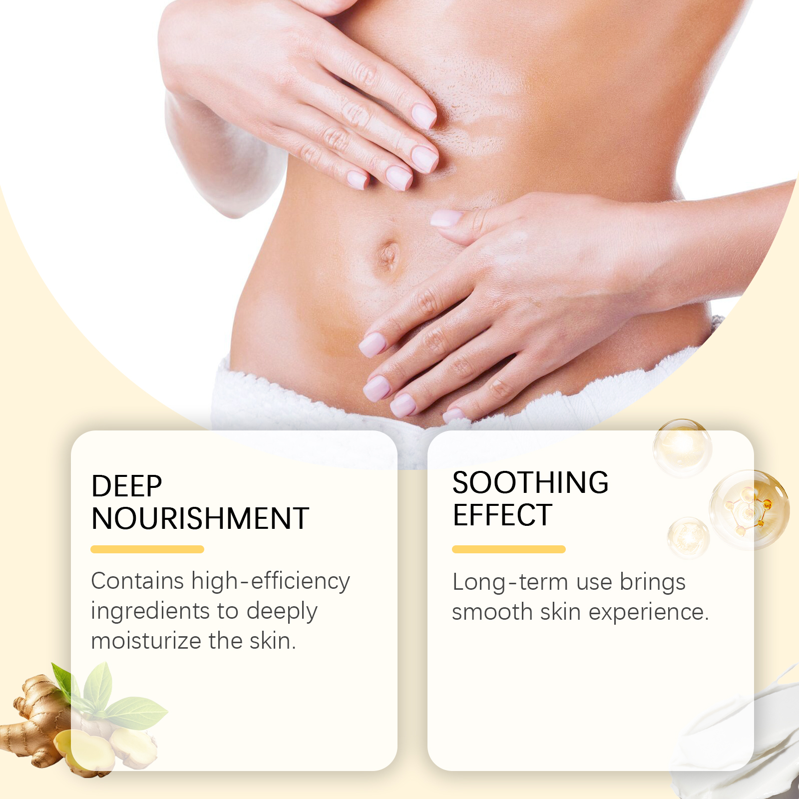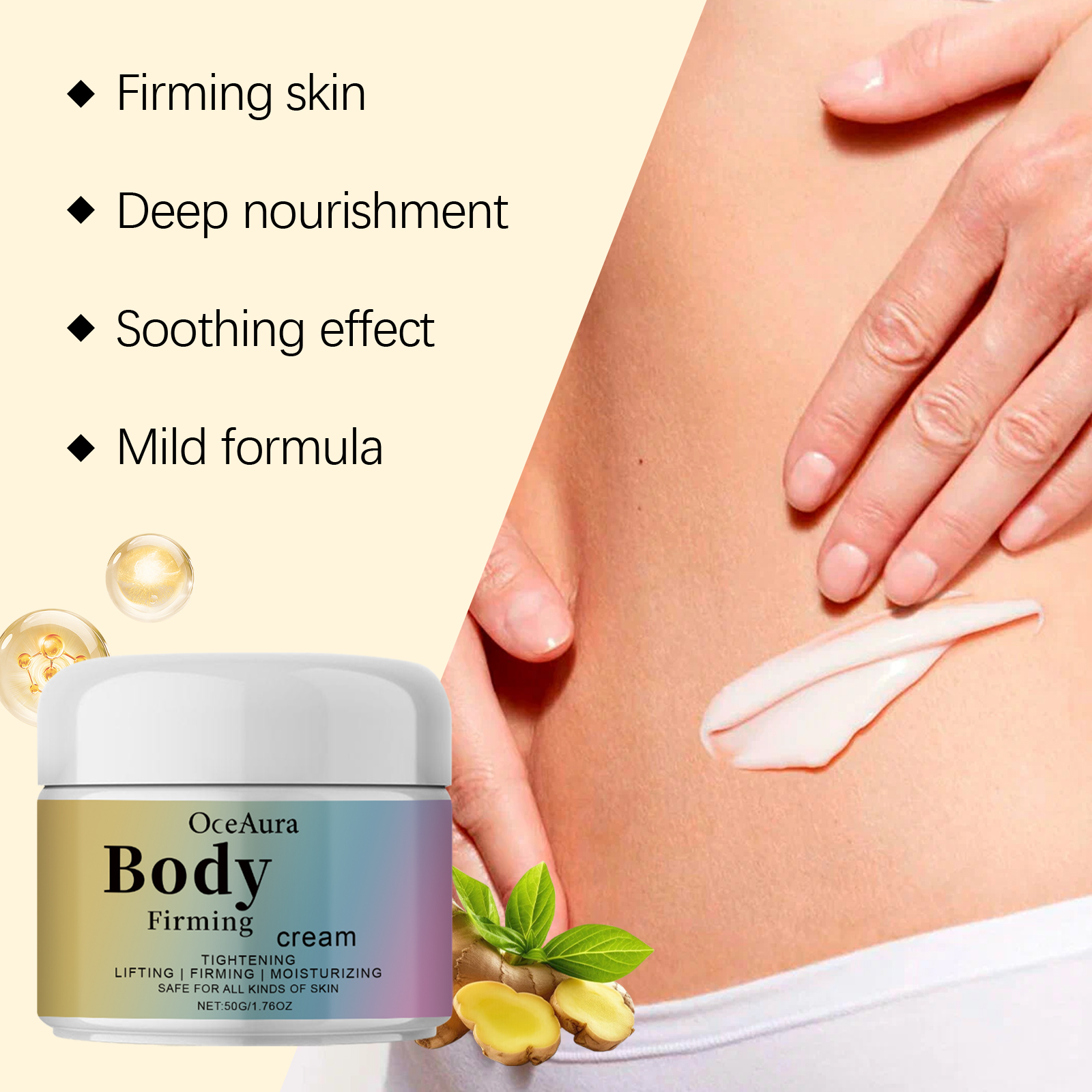 Our nourishing and firming moisturizer contains glycerin, mineral oil. It can contain highly effective ingredients and deeply moisturize the skin. Long-term use brings smooth skin experience. Its use method is very simple: clean the body skin and keep dry, take an appropriate amount of this product, evenly apply to the abdomen, thighs, arms and other skin, gently massage until completely absorbed. And can significantly improve skin elasticity and firmness. Keeps skin healthy and reduces dryness.