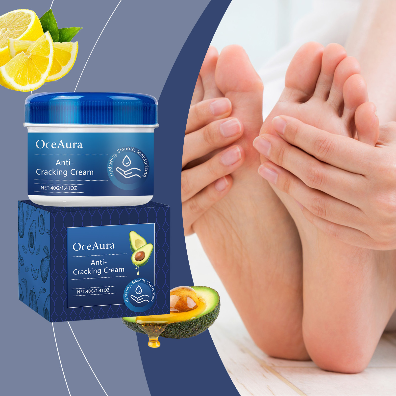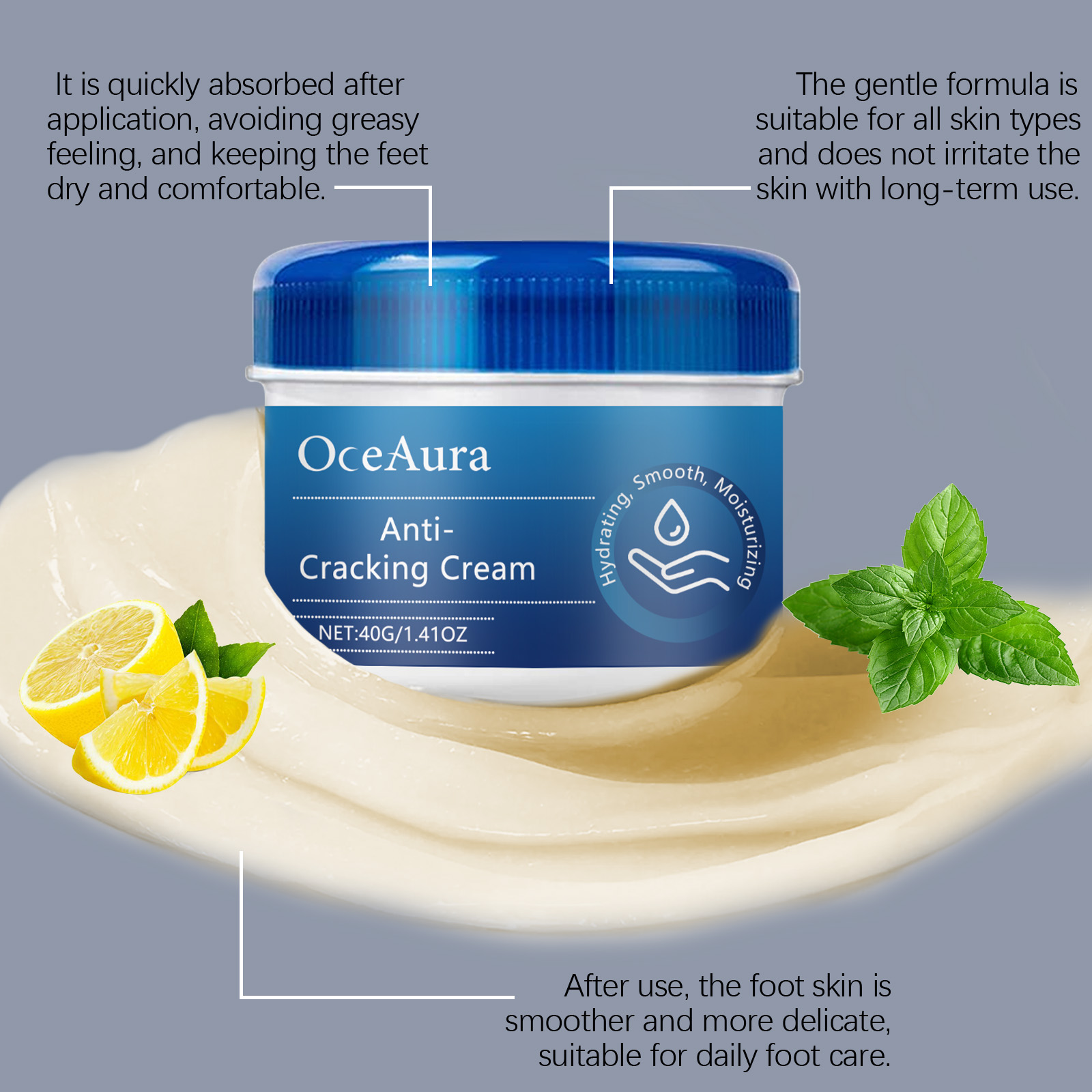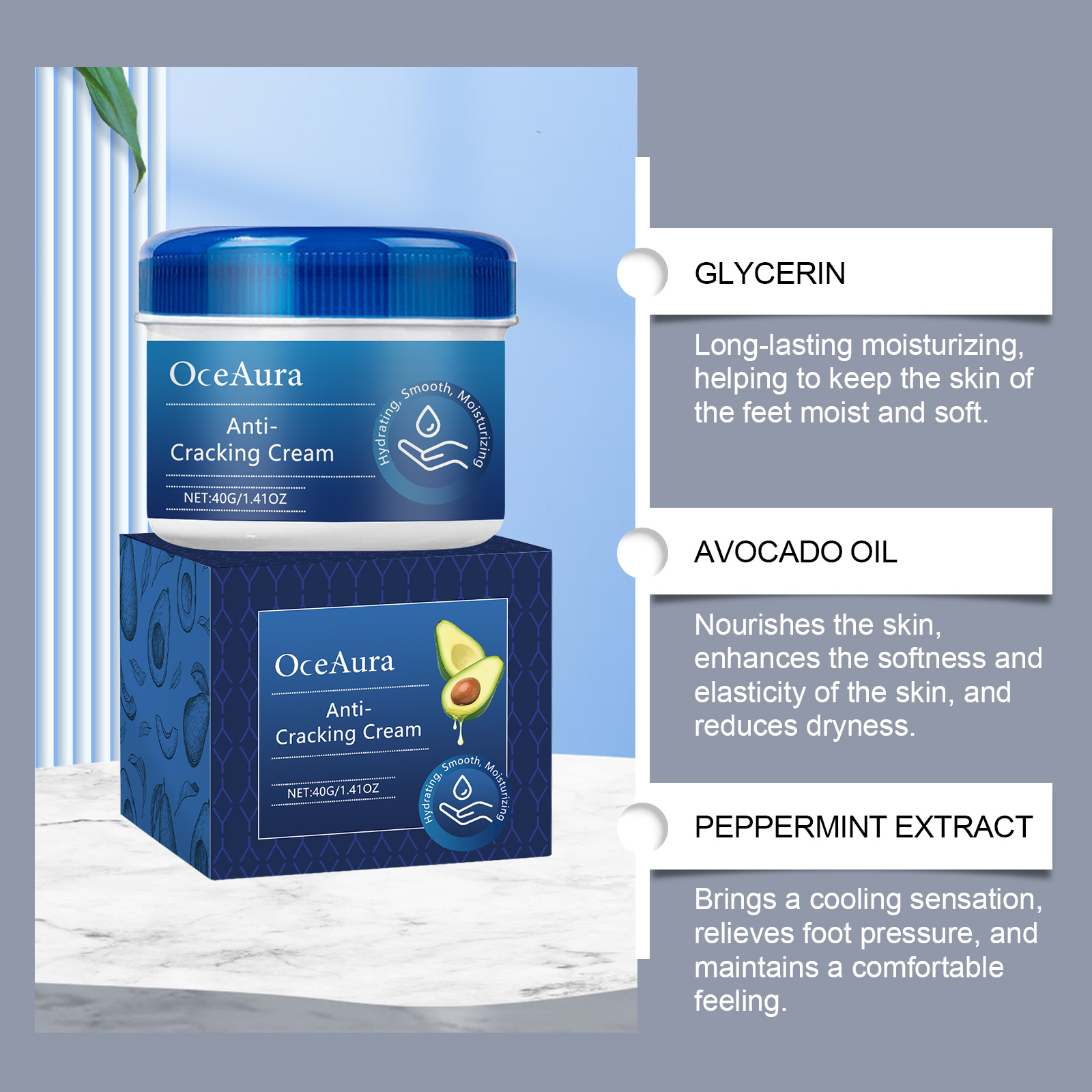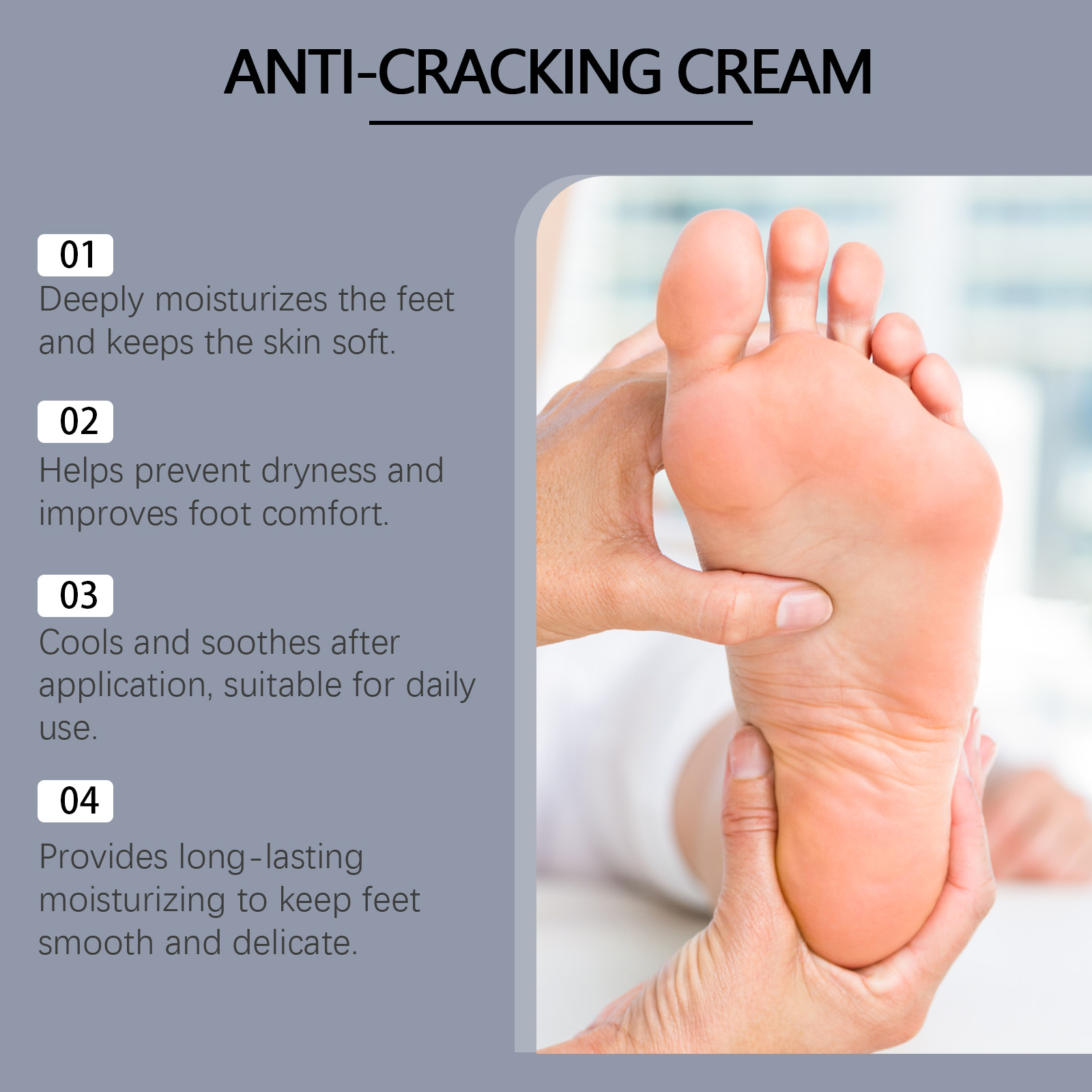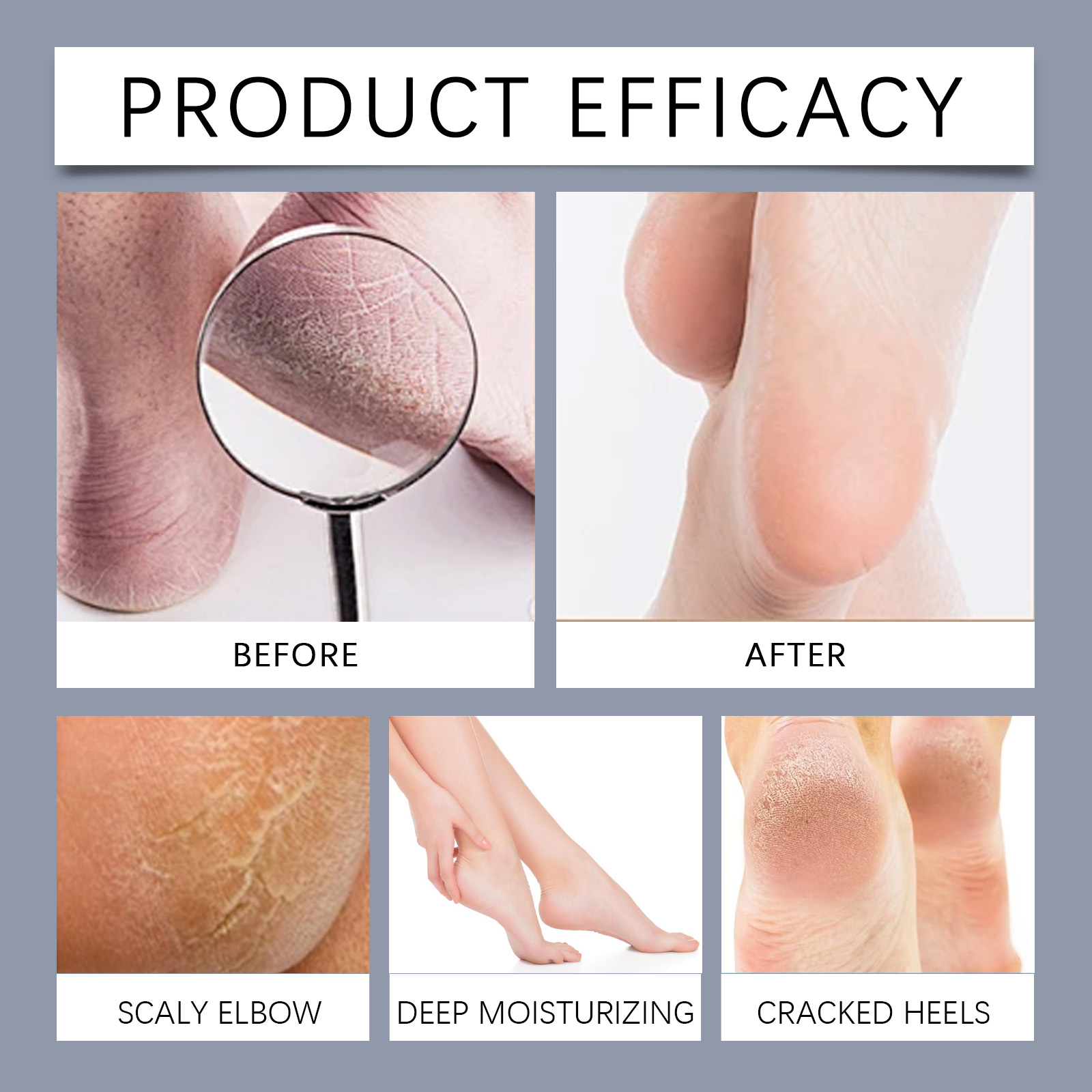 Our nourishing foot cream contains glycerin, avocado oil, peppermint extract. It can effectively relieve foot fatigue and discomfort and keep the feet comfortable. Its use method is very simple: 1. Wash your feet and keep them dry. 2. Take appropriate amount of this product and evenly apply to the feet. 3. Gently massage until absorbed. Constant use helps prevent chapped foot skin and keeps feet soft and smooth.