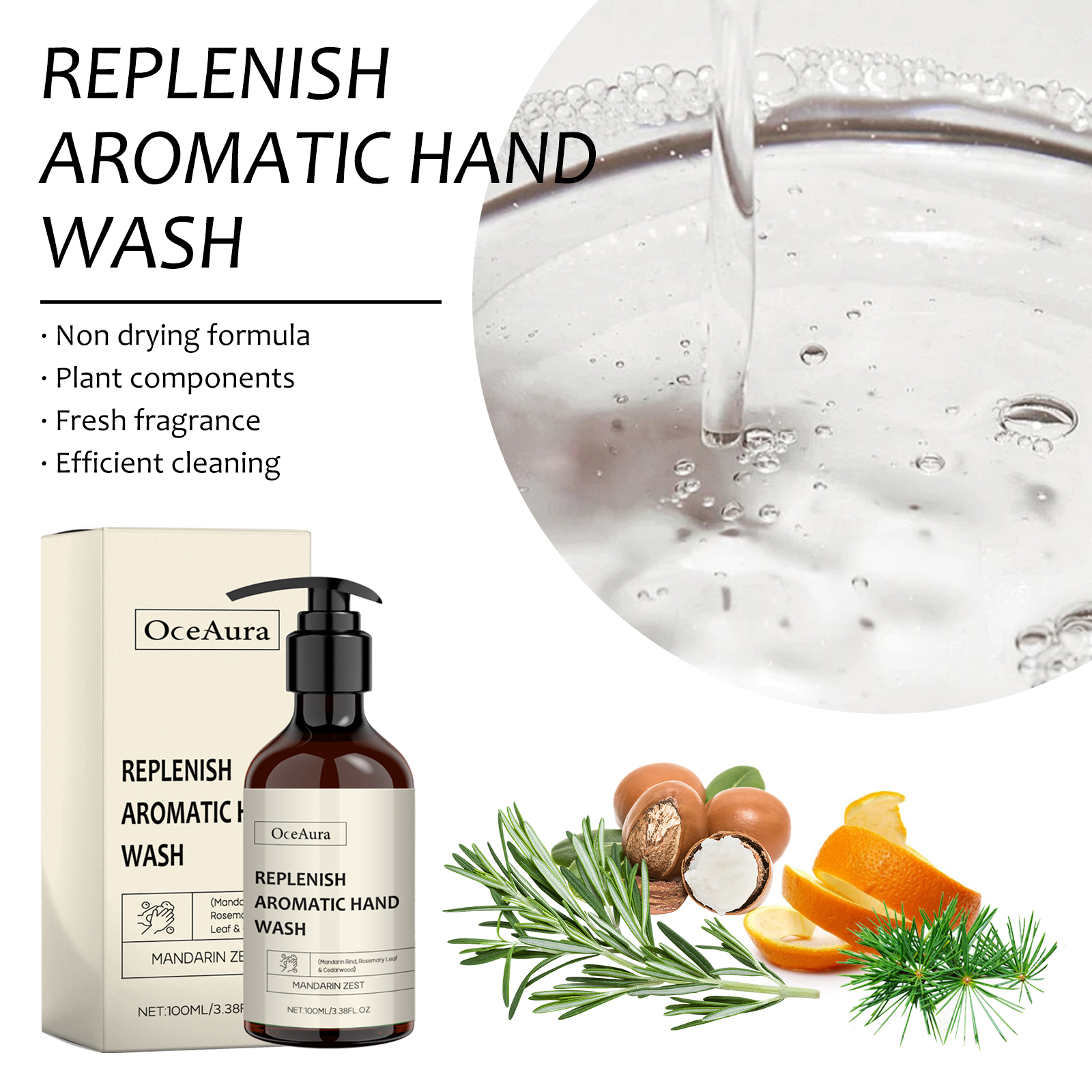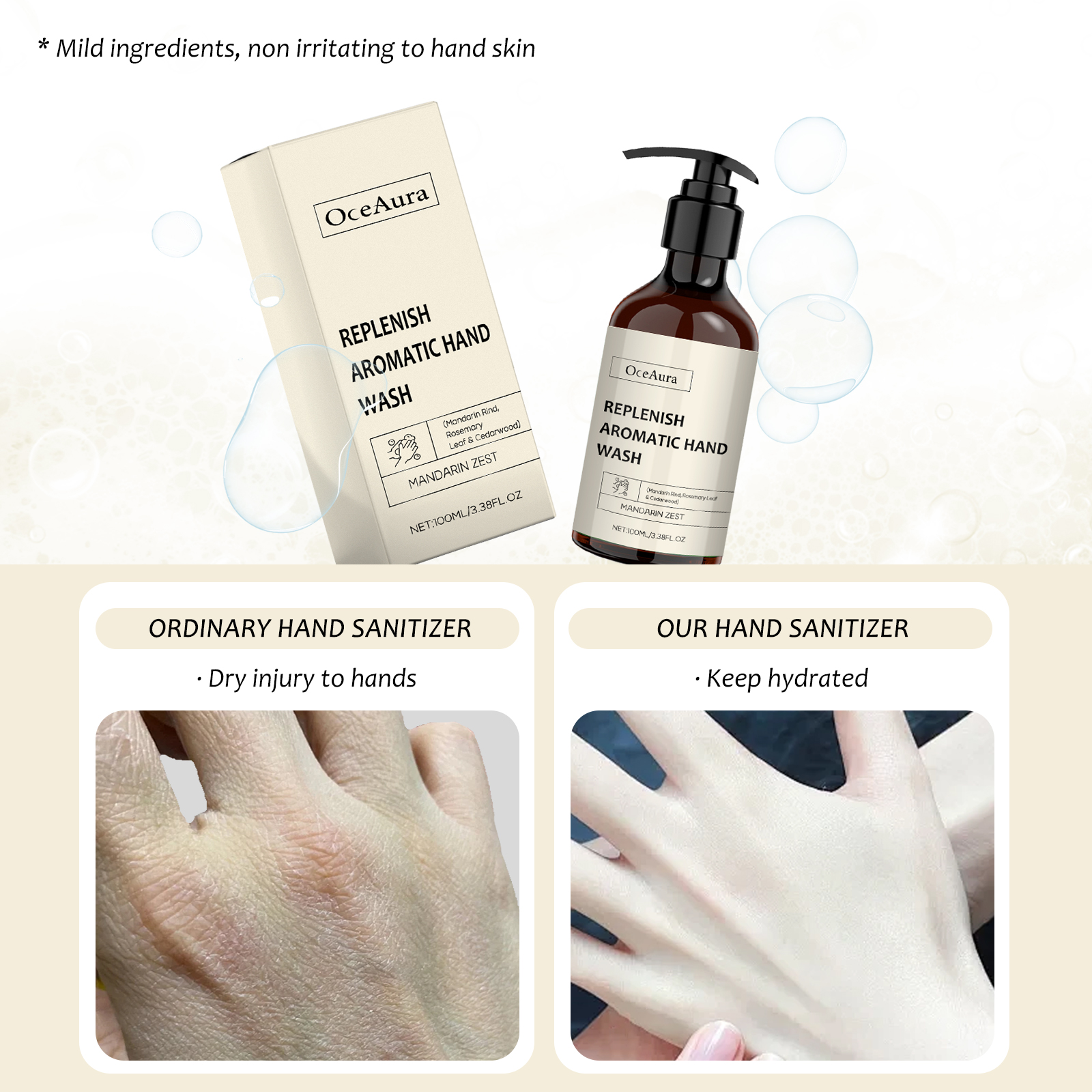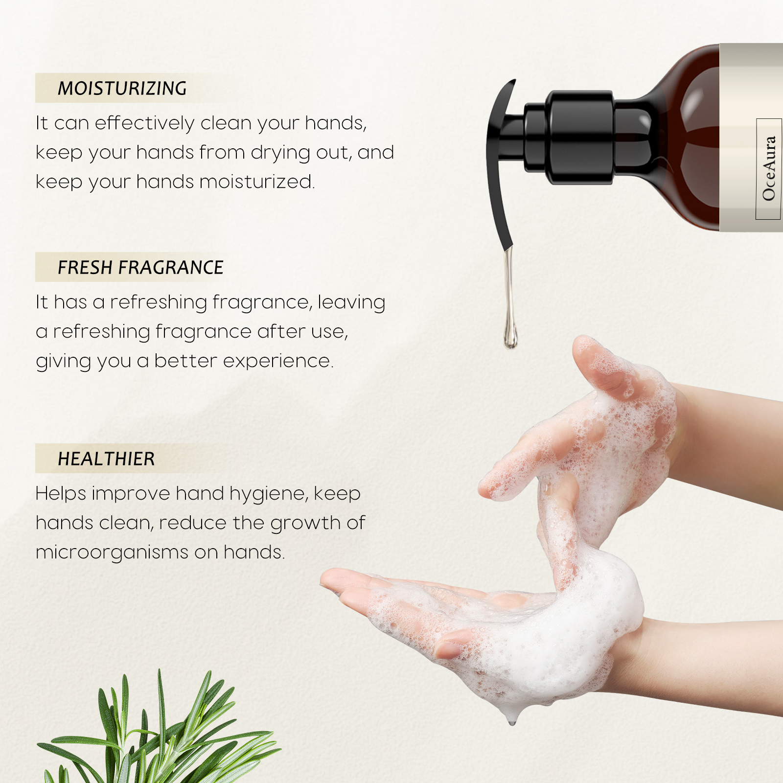 Our nourishing hand sanitizer contains sweet orange citrus (orange) peel extract, rosemary (rosemary) leaf extract. It can effectively clean your hands, prevent them from drying out, and keep them moist. The way to use it is simple: to pour hand sanitizer on wet hands, wash and rinse them with water. And you can clean your hands.