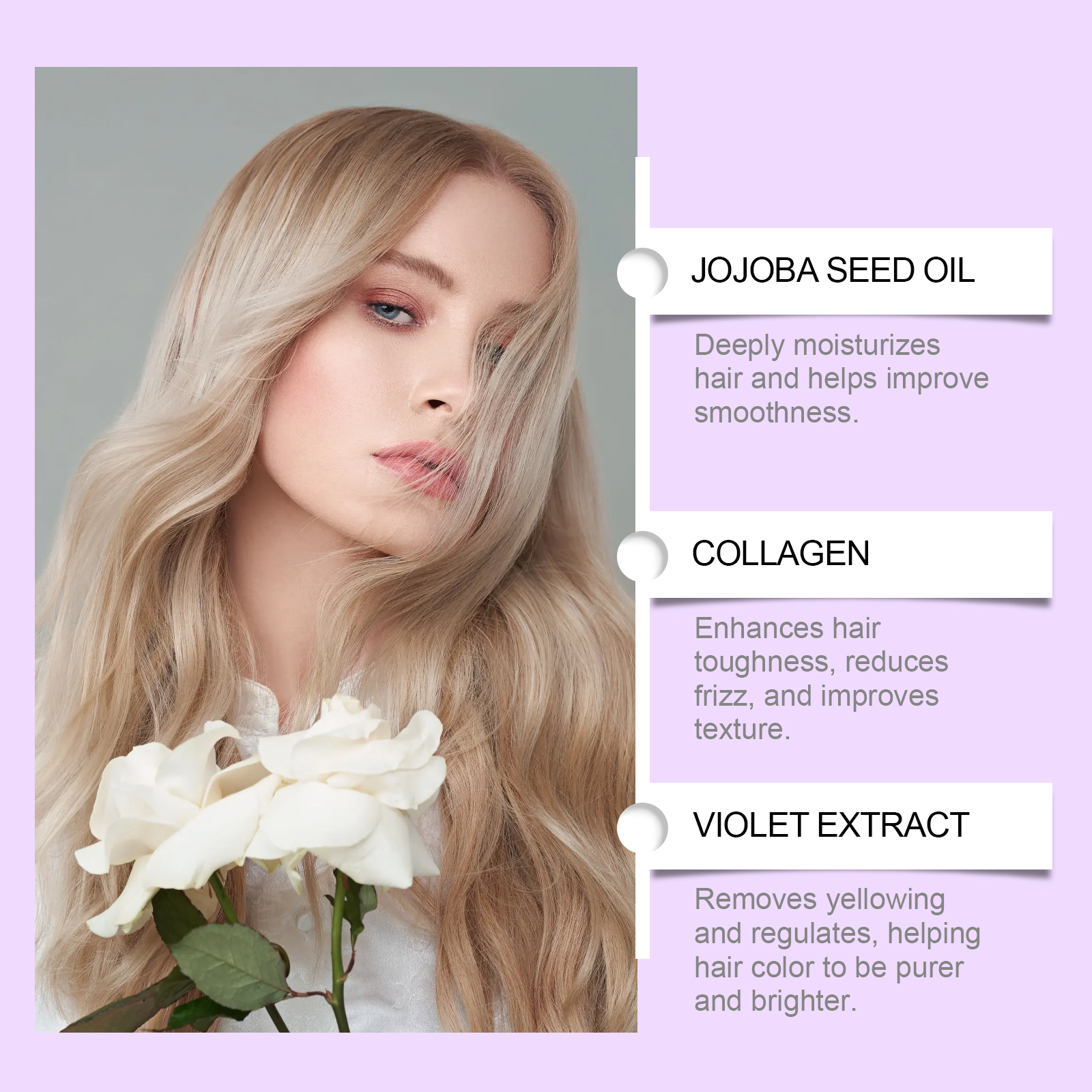 Our Nourishing purple conditioner contains violet extract, thyme extract. It can effectively adjust the hair color, keep the cool tone bright and lasting, the texture is fresh and non-sticky, easy to apply and rinse. The way to use it is very simple: moisturize your hair, evenly apply an appropriate amount to your hair, gently massage and absorb, and rinse with clean water. And can help keep hair soft and smooth, daily use can keep hair silky and reduce dryness.