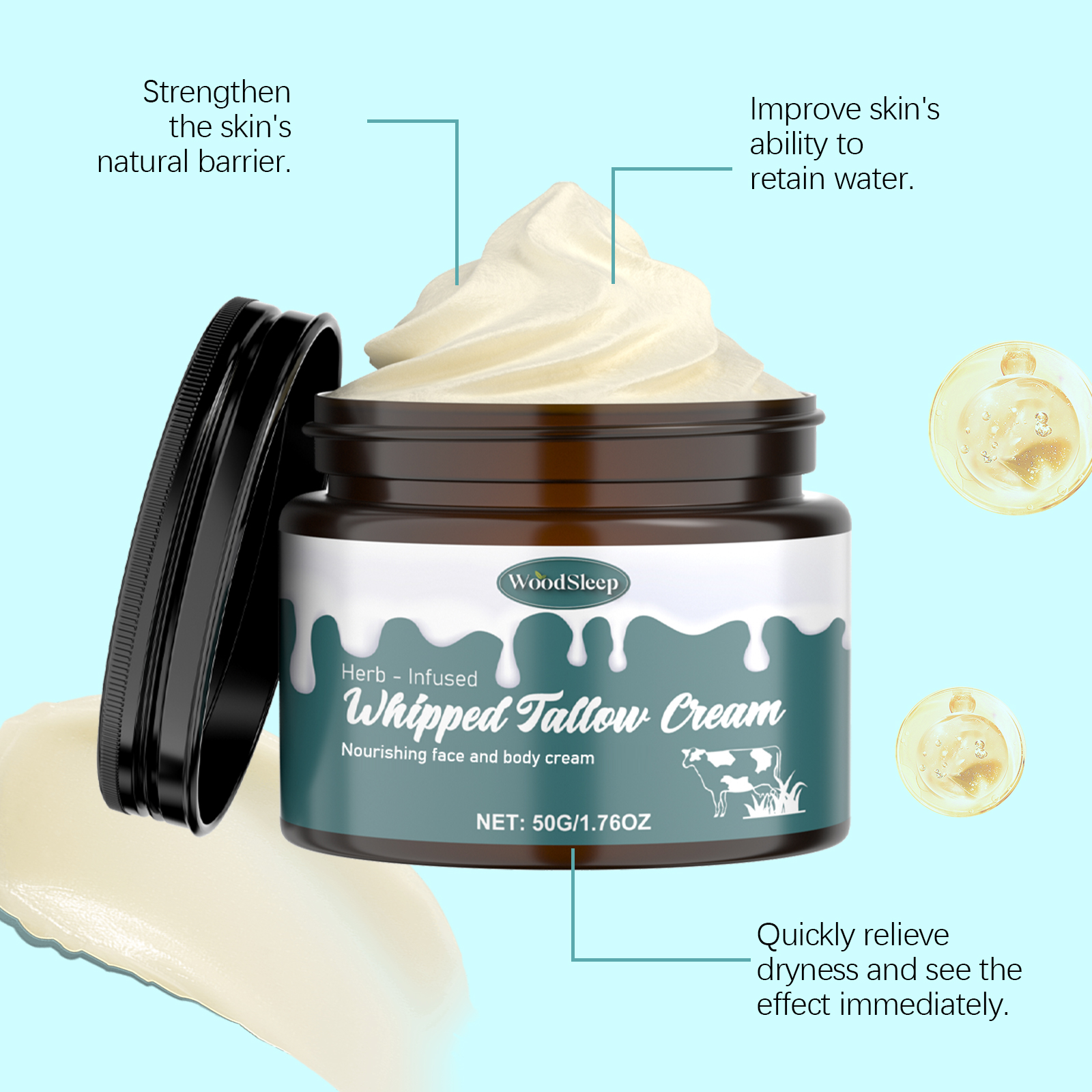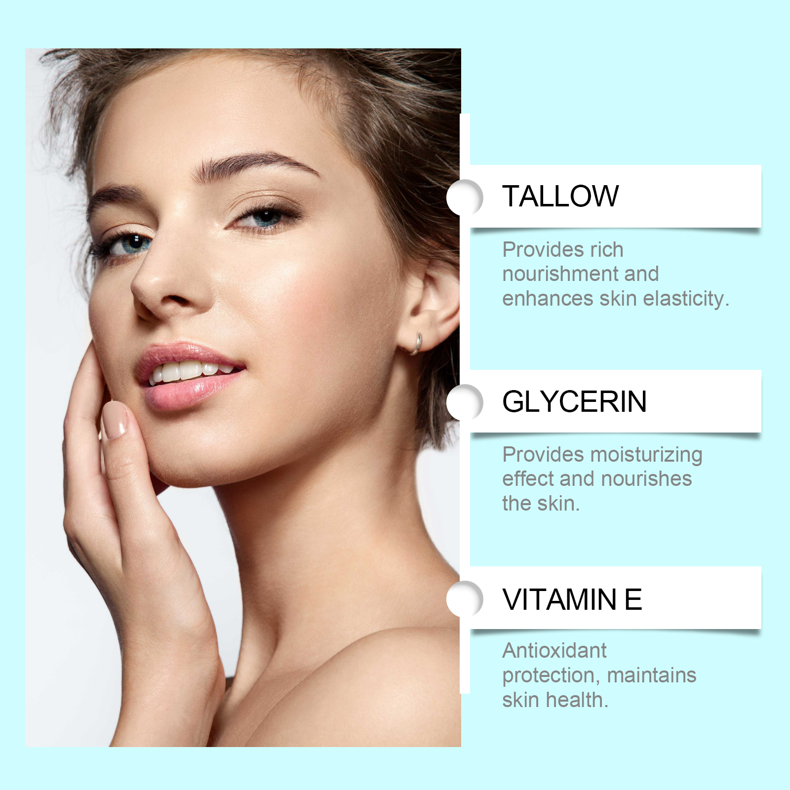 Our nourishing skin soothing cream contains tallow, vitamin E(tocopherol). It keeps moisturizing and leaves skin smooth and delicate. Suitable for use in different climatic conditions. Mild ingredients enhance the use experience. Safe ingredients, safe to use. Its application method is very simple: clean the body and face skin and keep dry, take appropriate amount of this product, evenly apply to the face and body skin. Massage gently until fully absorbed. It is the ideal skin care option to provide essential nutrients, protect the skin and meet daily needs.