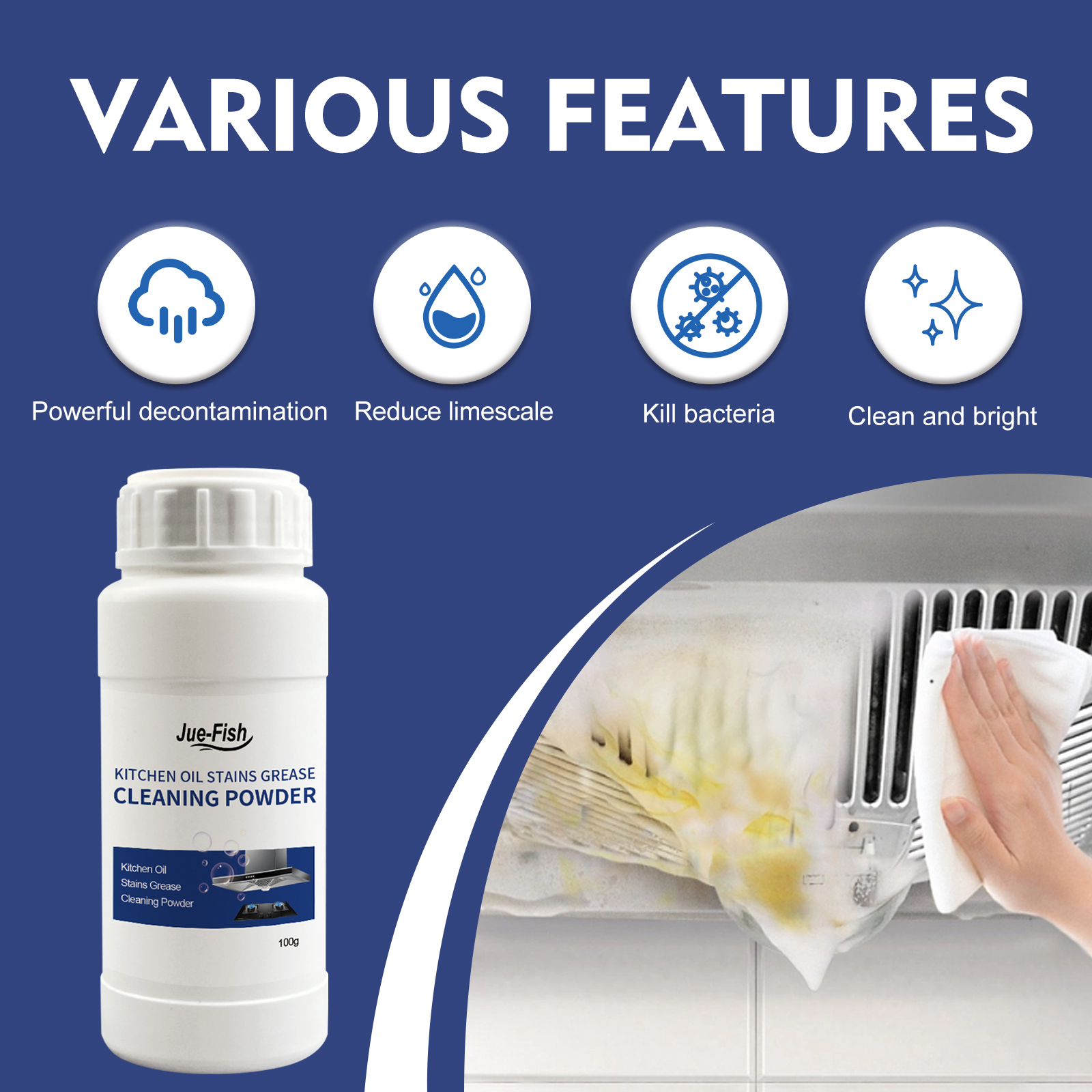 Our oil cleaning powder contains kaolin, baking soda, and biological enzymes. It's a powerful way to remove stubborn stains, eliminate bacteria, get rid of odors, and give your kitchen a new look. Its use method is very simple: first take an appropriate amount of cleaning powder, mixed with hot water, then dip a clean towel or sponge into the mixture, gently scrub the greasy kitchen surface, and then scrub with water. After the use of kitchen stains and odor are completely eliminated, the whole kitchen becomes very new, so that you have a sense of peace of mind after seeing.