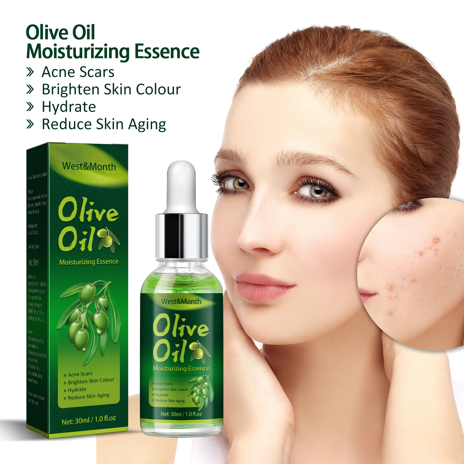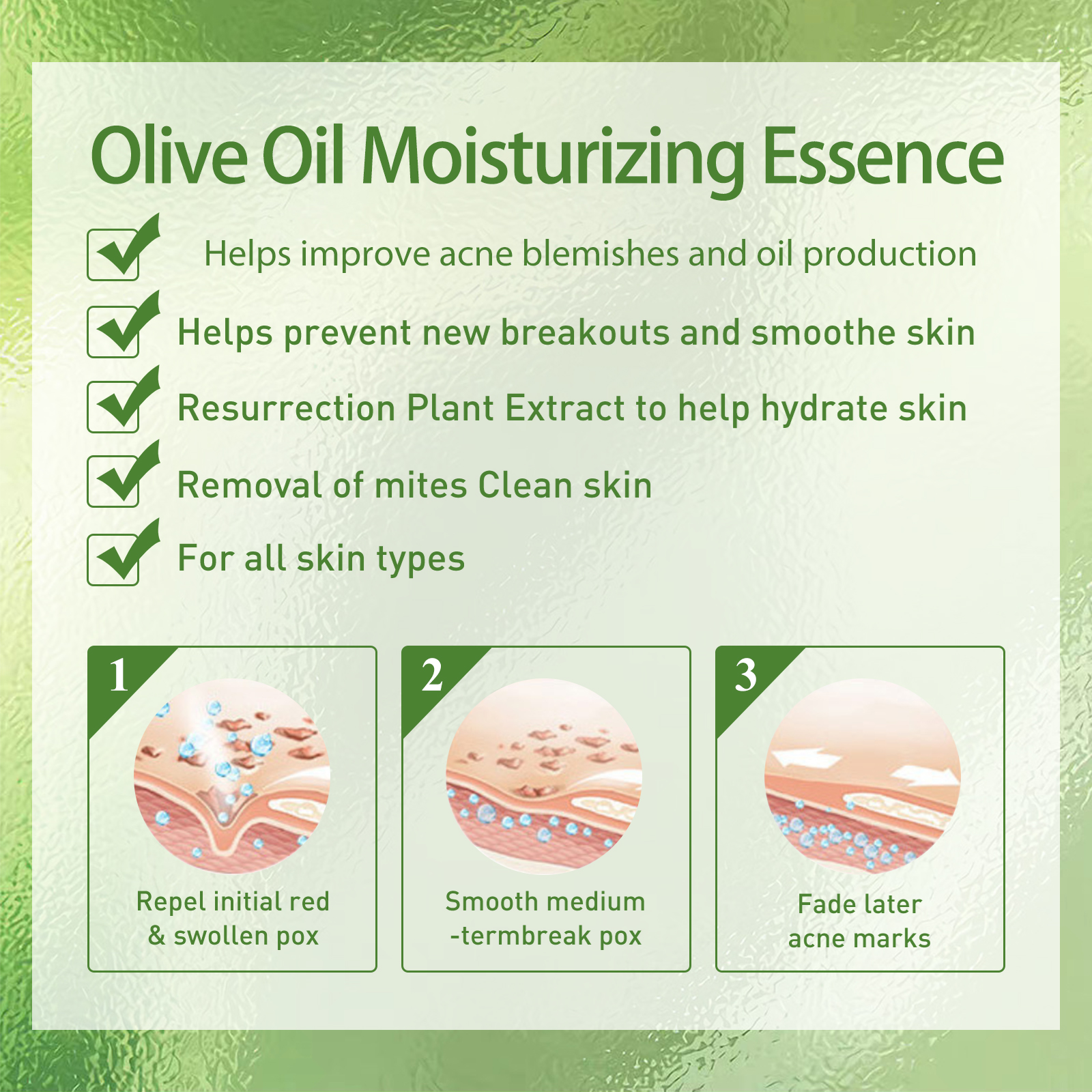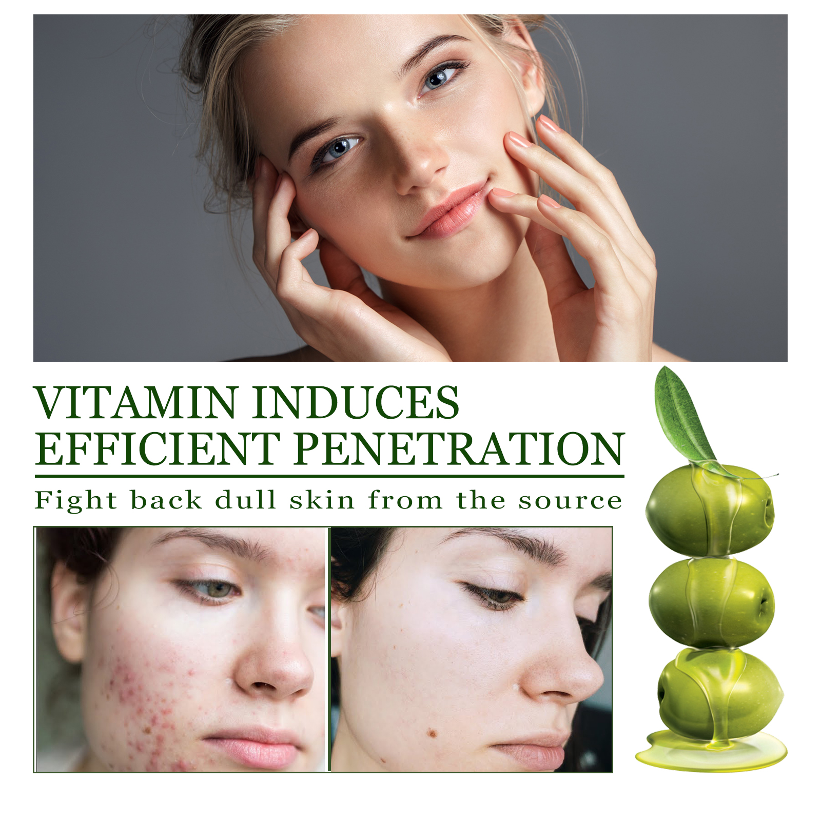 Our Olive Acne serum contains olive oil extract. It can help improve acne blemishes and oils, moisturize the skin and cleanse the skin. Its use method is very simple: take 3-5 drops of essence, evenly apply to the face, massage until absorbed. If the skin has serious problems, you can add a drop of continuous massage to assist absorption. It can also help replenish water and reduce skin aging.