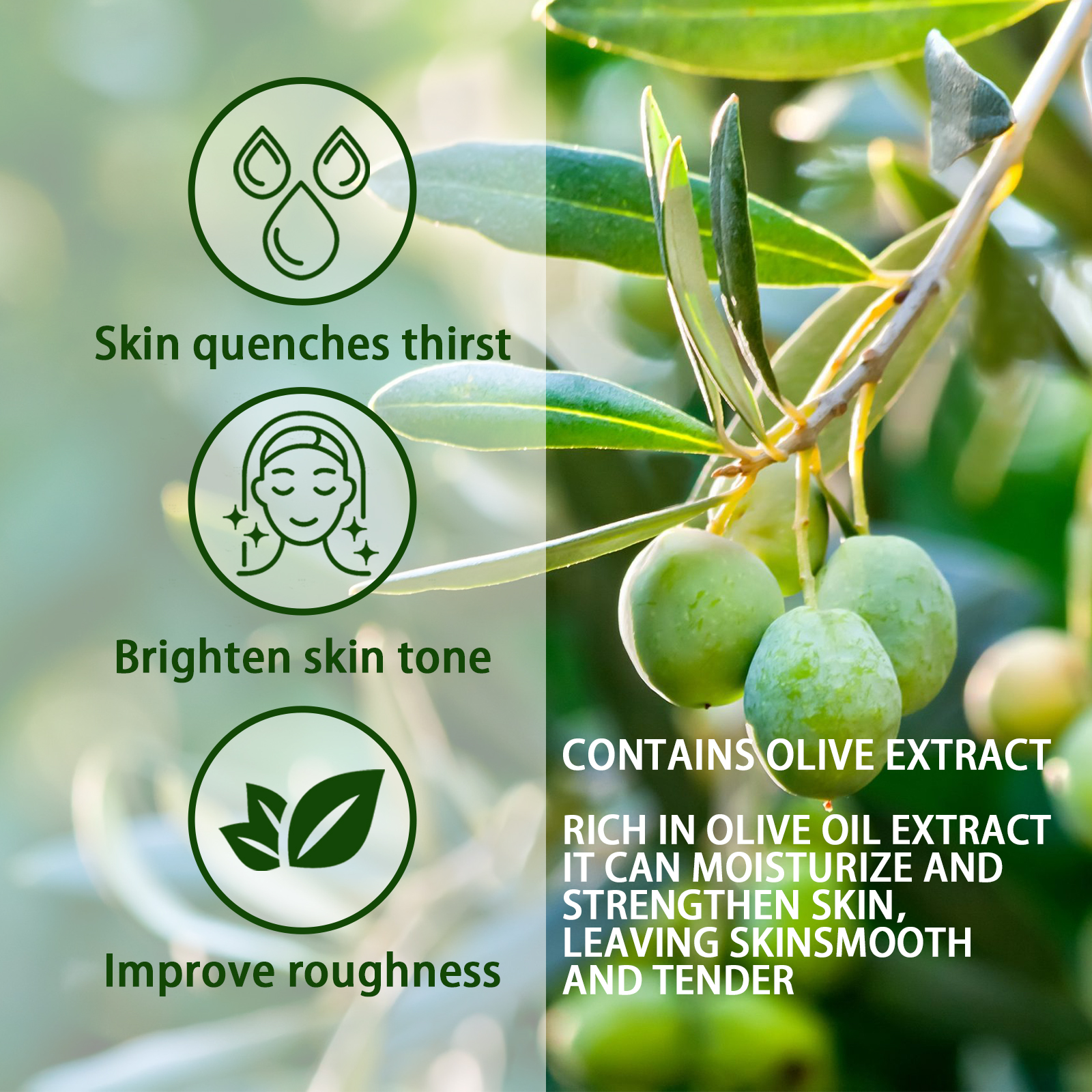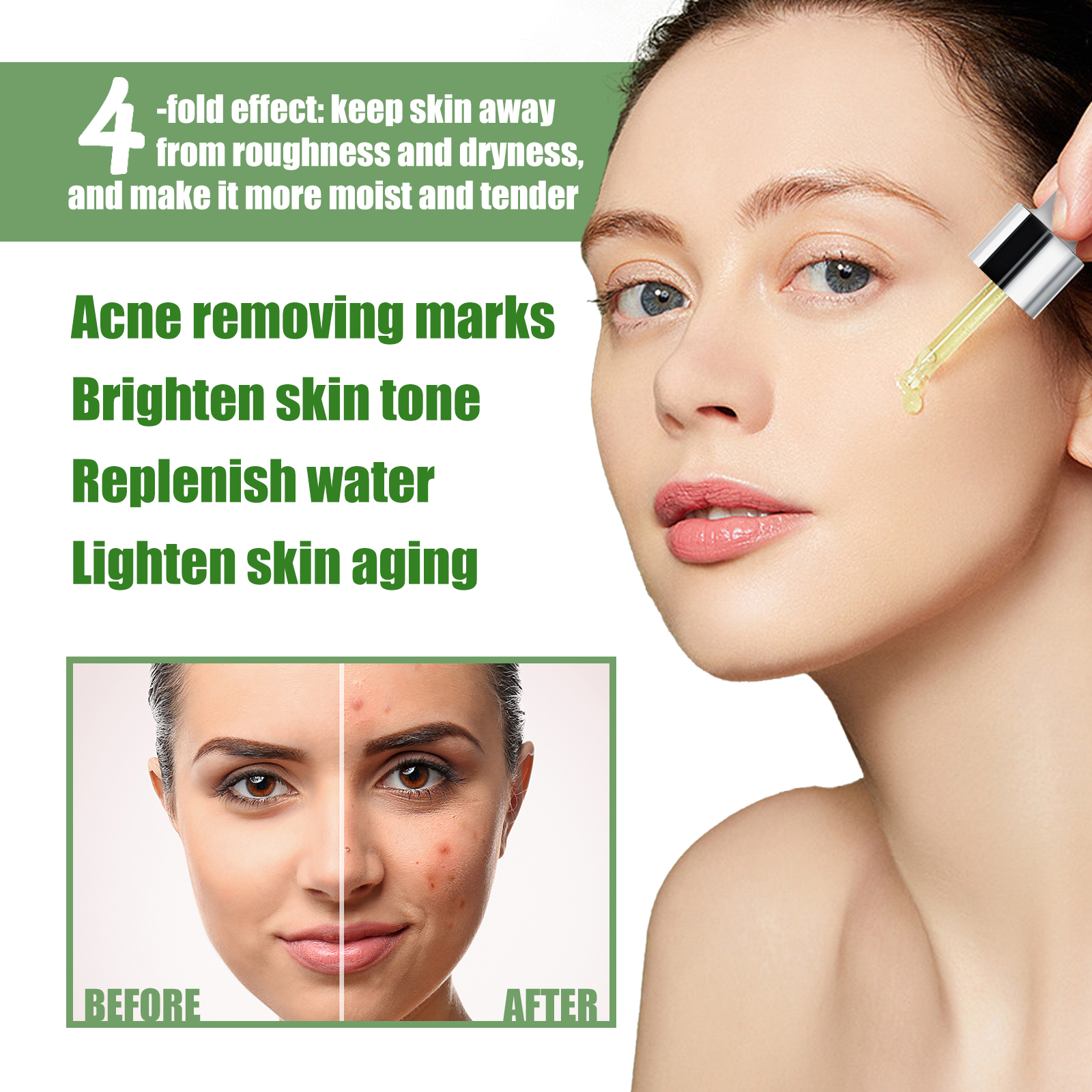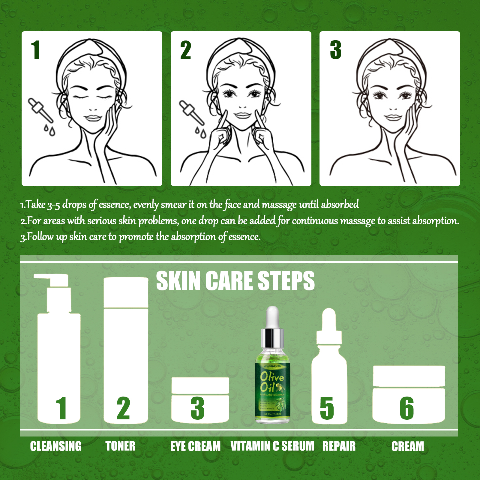 Our Olive Acne serum contains olive oil extract. It can help improve acne blemishes and oils, moisturize the skin and cleanse the skin. Its use method is very simple: take 3-5 drops of essence, evenly apply to the face, massage until absorbed. If the skin has serious problems, you can add a drop of continuous massage to assist absorption. It can also help replenish water and reduce skin aging.