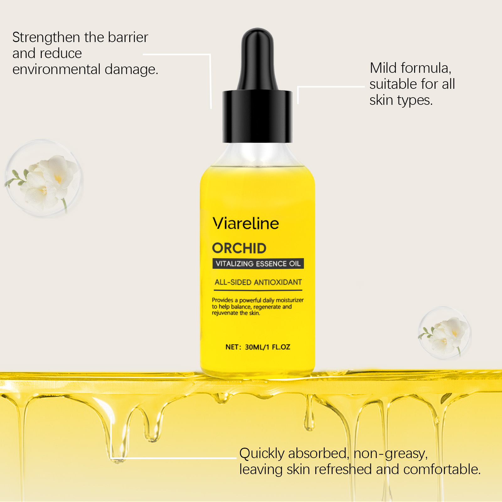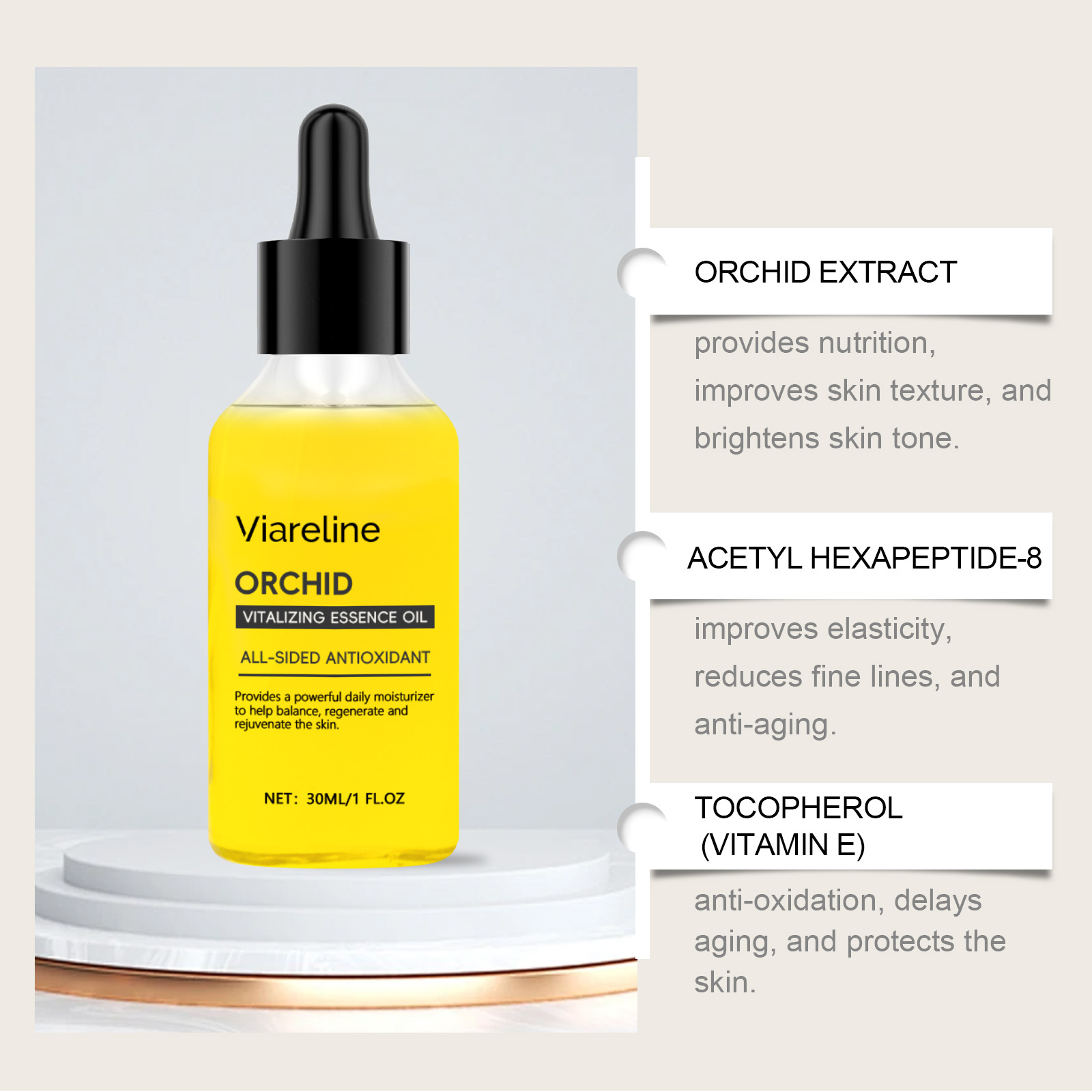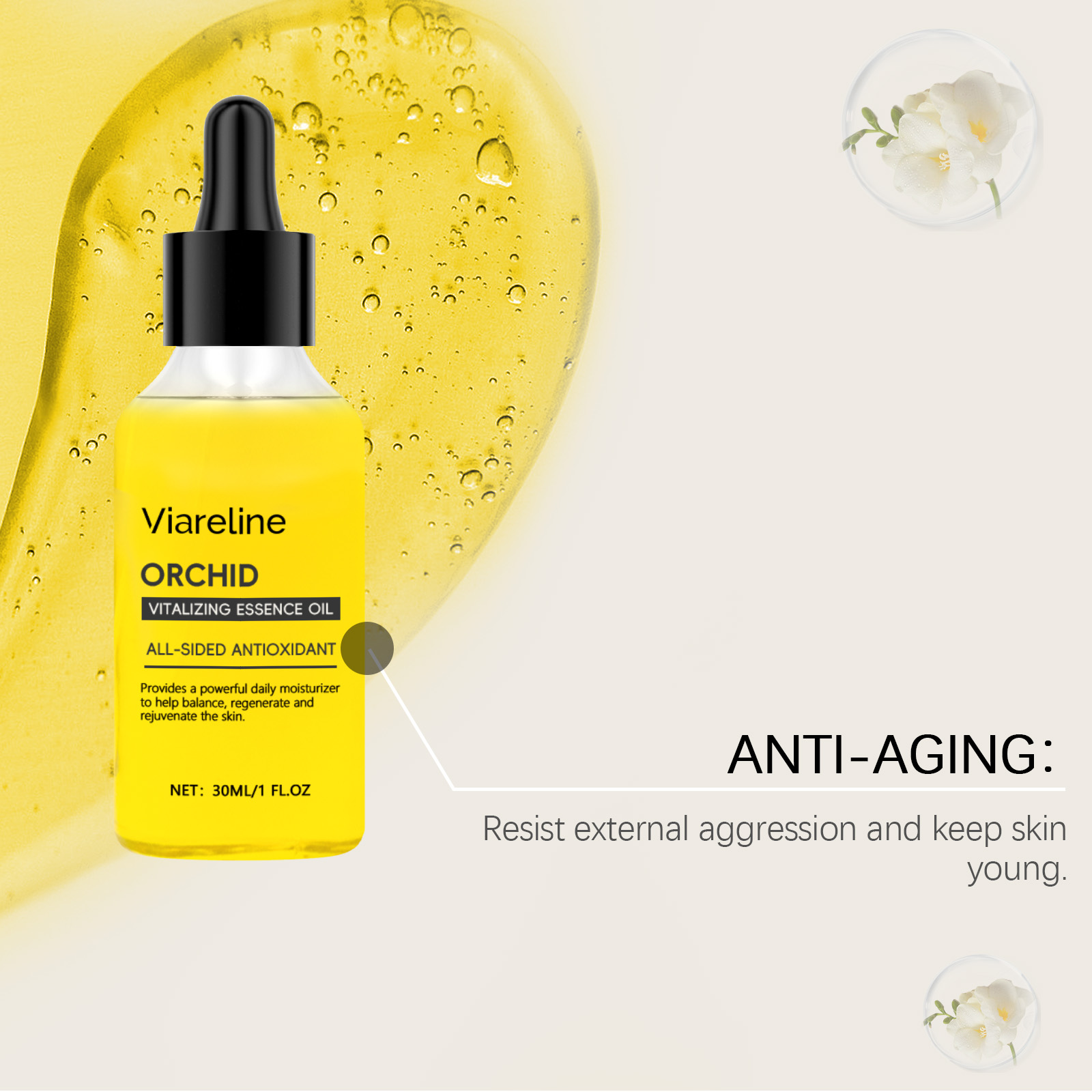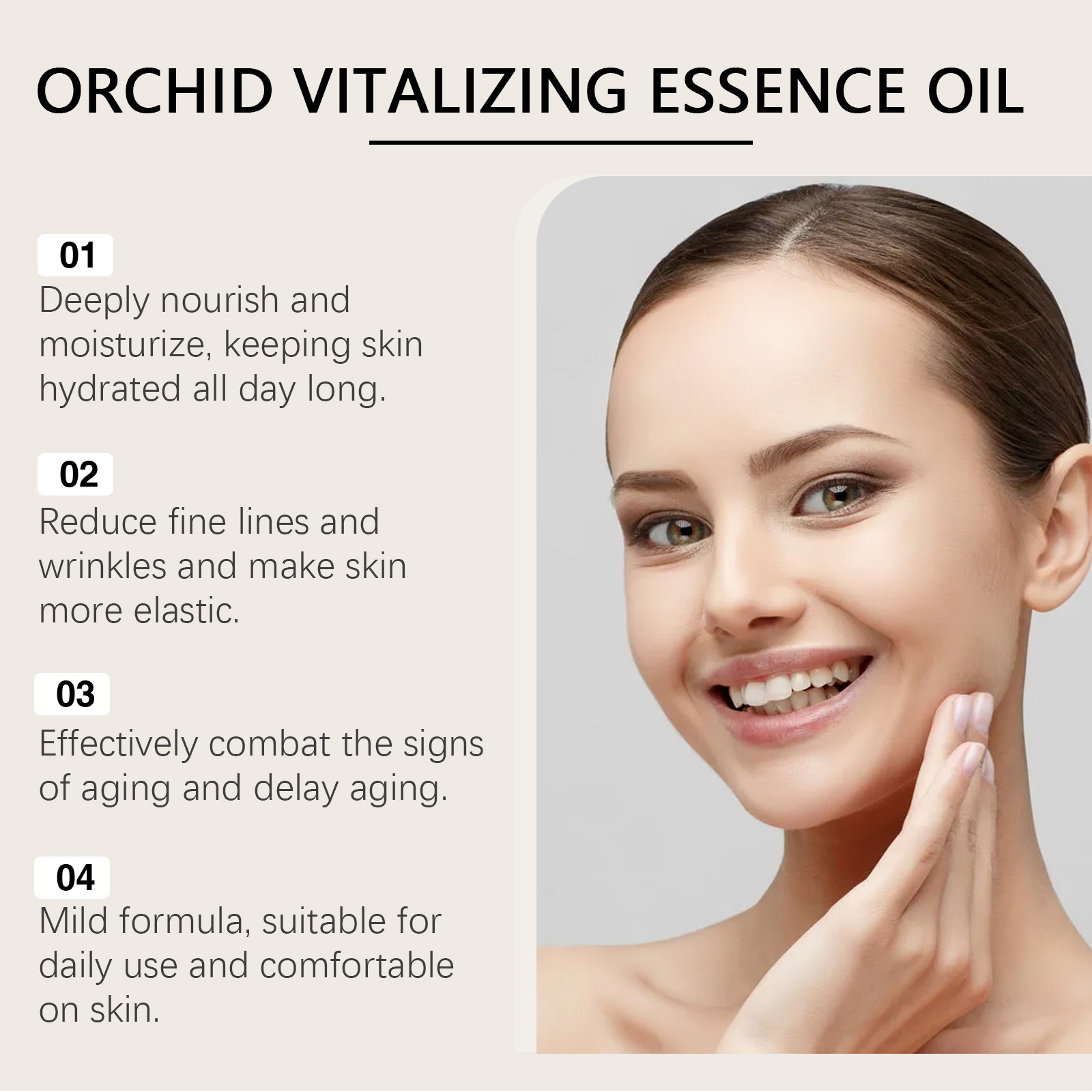 Our Orchid brightening oil contains glycerin and orchid extract. It locks in moisture for a long time and nourishes every inch of the skin. Reduces fine lines and wrinkles, leaving skin smoother. The way to use it is simple: clean and dry facial skin. Apply a good amount of oil to your face. Massage gently until absorbed and can boost metabolism and improve skin firmness.