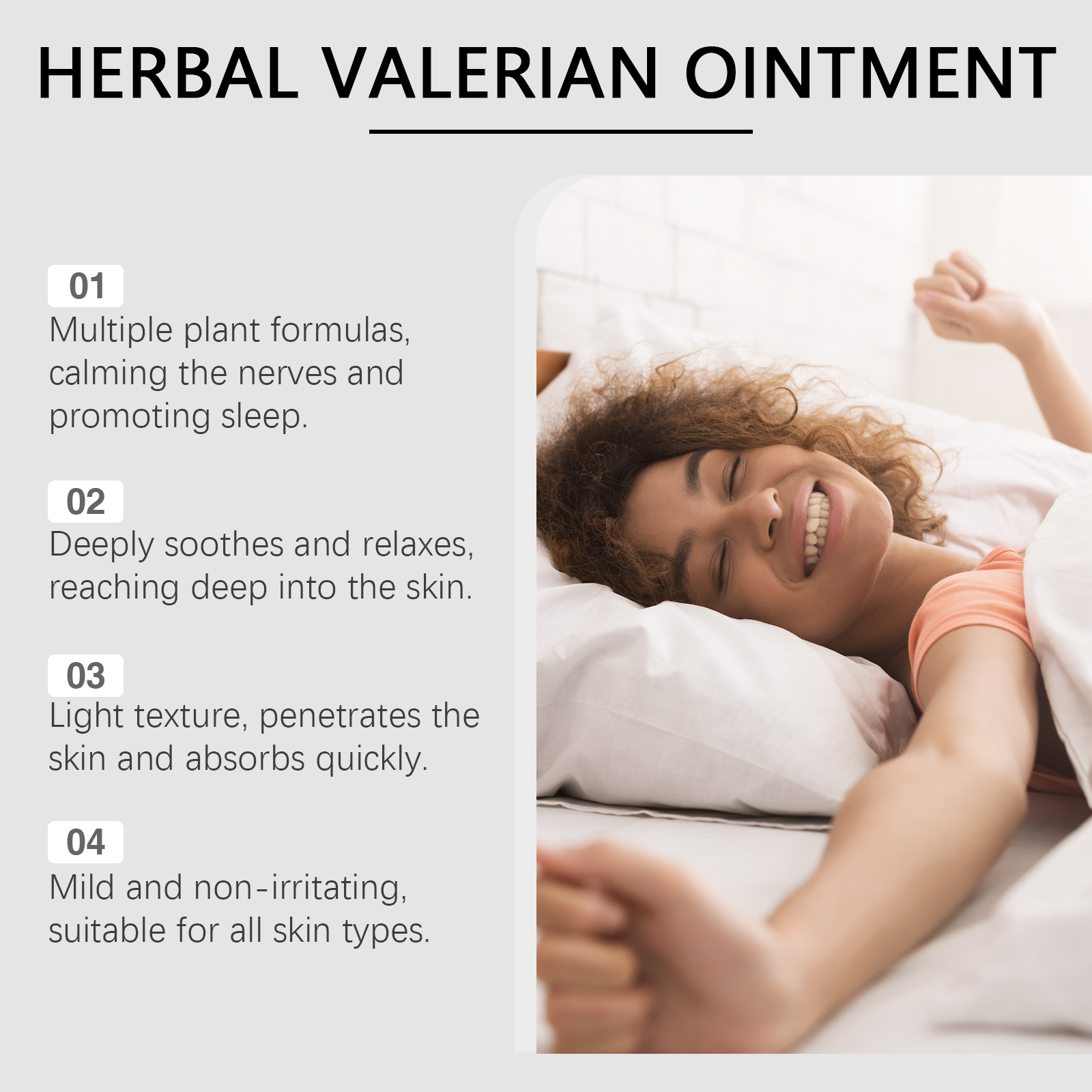 Our organic valerian ointment contains valerian root extract, hop extract, asparagus root extract. It nourishes the skin for a new glow. Strengthen skin barrier, improve skin self-repair ability. Its use is simple: 1. Clean and dry the skin. 2. Apply appropriate amount of this product evenly on wrist and whole body skin. 3. Gently massage until absorbed. Regulate sleep and improve rest quality. Apply before going to bed to relieve stress and have a good dream; The aroma is fresh and soothing. The pleasant aroma brings peace and tranquility.