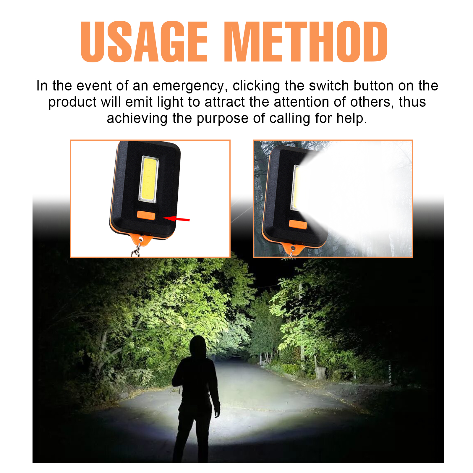 Our lighting contains APS plastic, COB lamps. It can be compact, portable, and easy to use, and it integrates seamlessly into your lifestyle, ensuring you're always ready to defend. Emit a light to attract others' attention, thus achieving the purpose of asking for help. Its use method is very simple: in an emergency, click the switch button on the product, it will emit a light, attract the attention of others, so as to achieve the purpose of calling for help. Lights can keep you safe outdoors and can also be used if you get lost; With a variety of lighting modes, suitable for indoor and outdoor use.