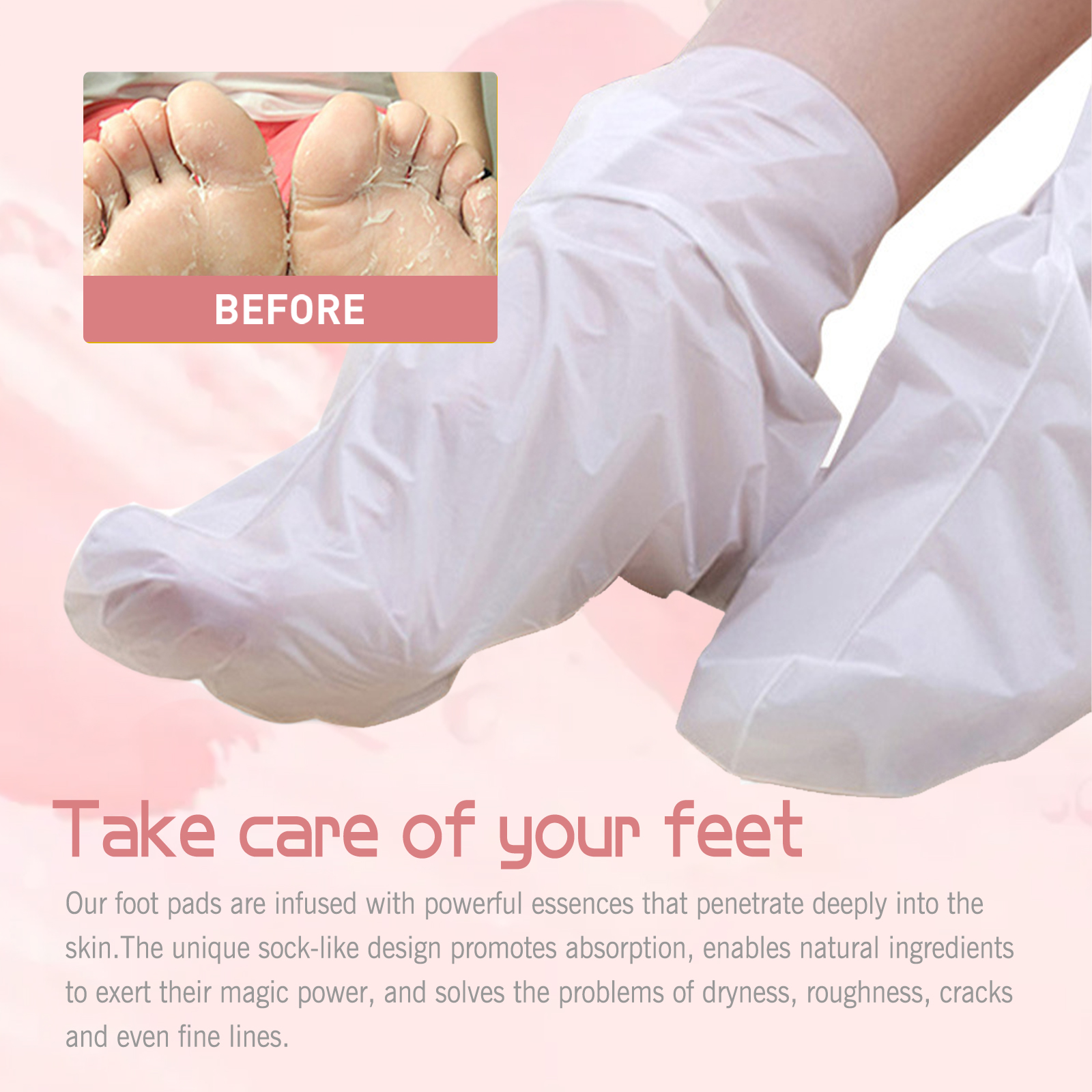 Our peach foot mask contains glycerin, mandelic acid, peach fruit extract. It can be applied to all skin types, enhance the water retention of the foot skin, relieve dryness and roughness, and make the foot more beautiful. Its use method is very simple: 1. Clean and dry feet; 2. Open the foot mask and put it on the foot; 3. Wait 60-90 minutes, then take off; 4. Wash your feet with warm water. The peach foot mask is infused with a powerful essence that penetrates deep into the skin. The unique hosiery design promotes absorption and allows natural ingredients to work their magic to solve dry, rough, cracked and even fine lines.