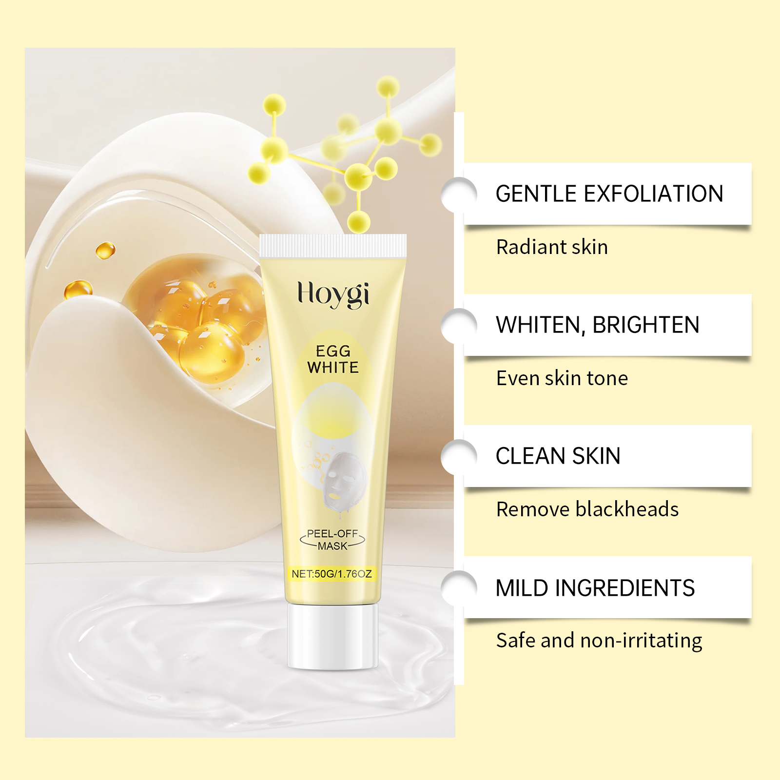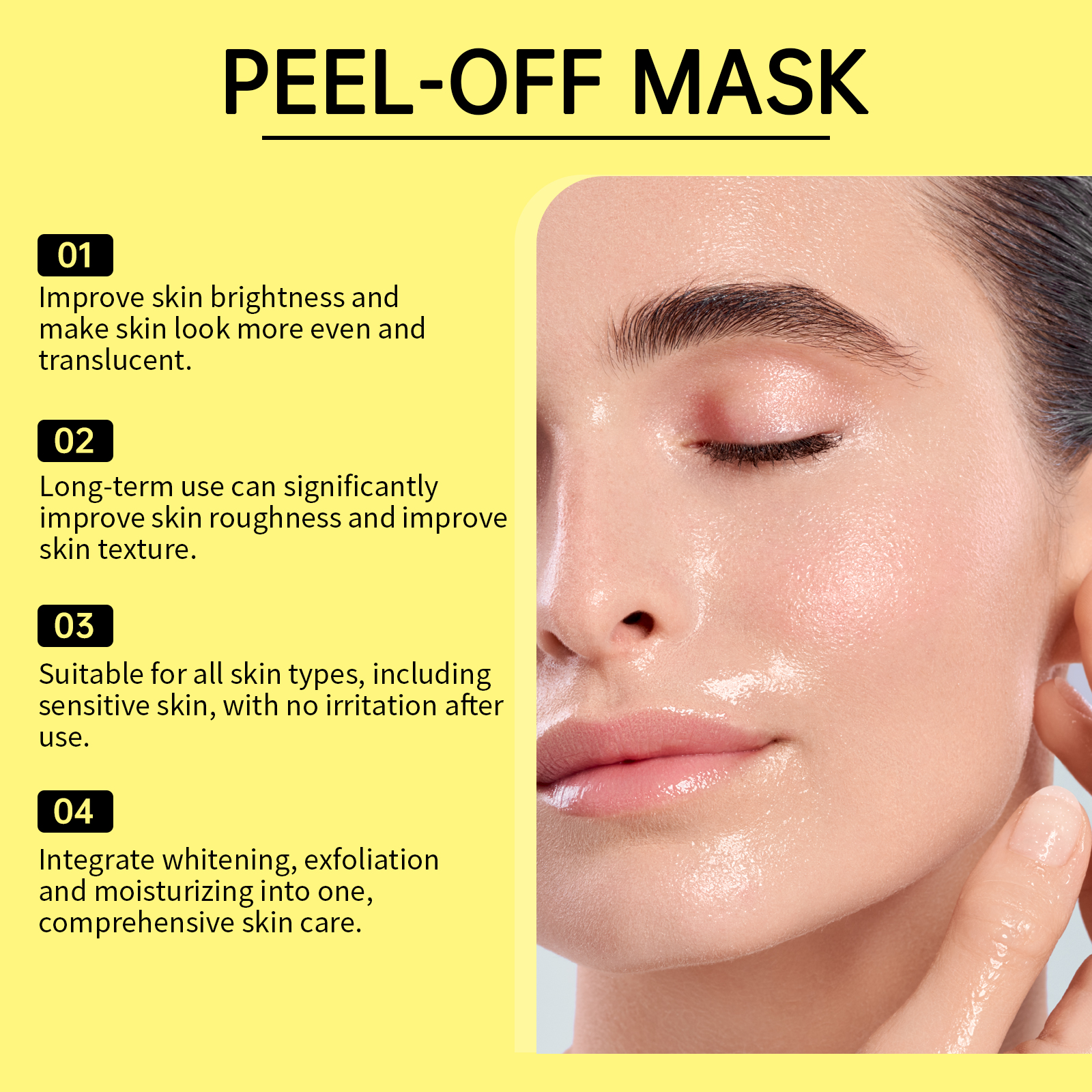 Our peel mask contains collagen, elastin and lemon fruit extract. It can improve the dull complexion and make the skin glow naturally. Fine scrub particles gently remove aging dead skin cells, leaving skin smooth and delicate. Its application method is simple: 1. Thoroughly clean and dry the skin; 2. Apply appropriate amount of the product evenly on the face, leave for 15-20 minutes to dry, then remove the mask; 3. Finally, clean your face with water. Deep clean pores and dirt, prevent blackheads and pimples, and keep skin clean.