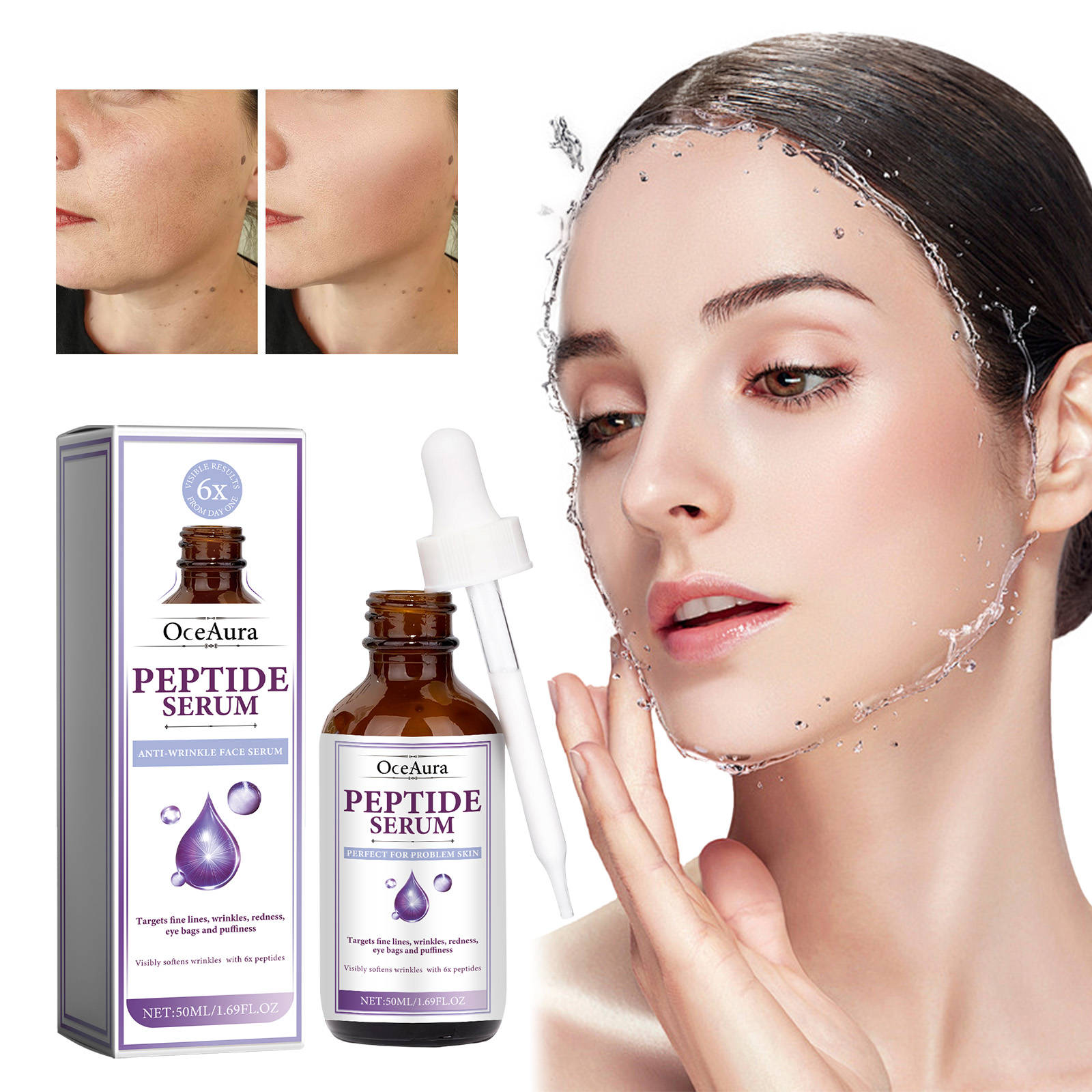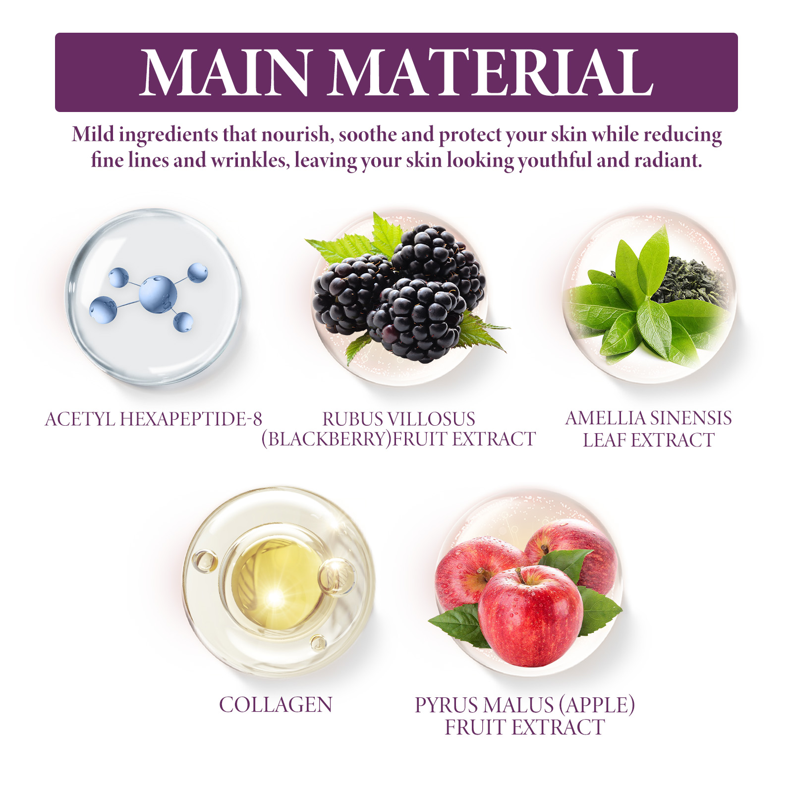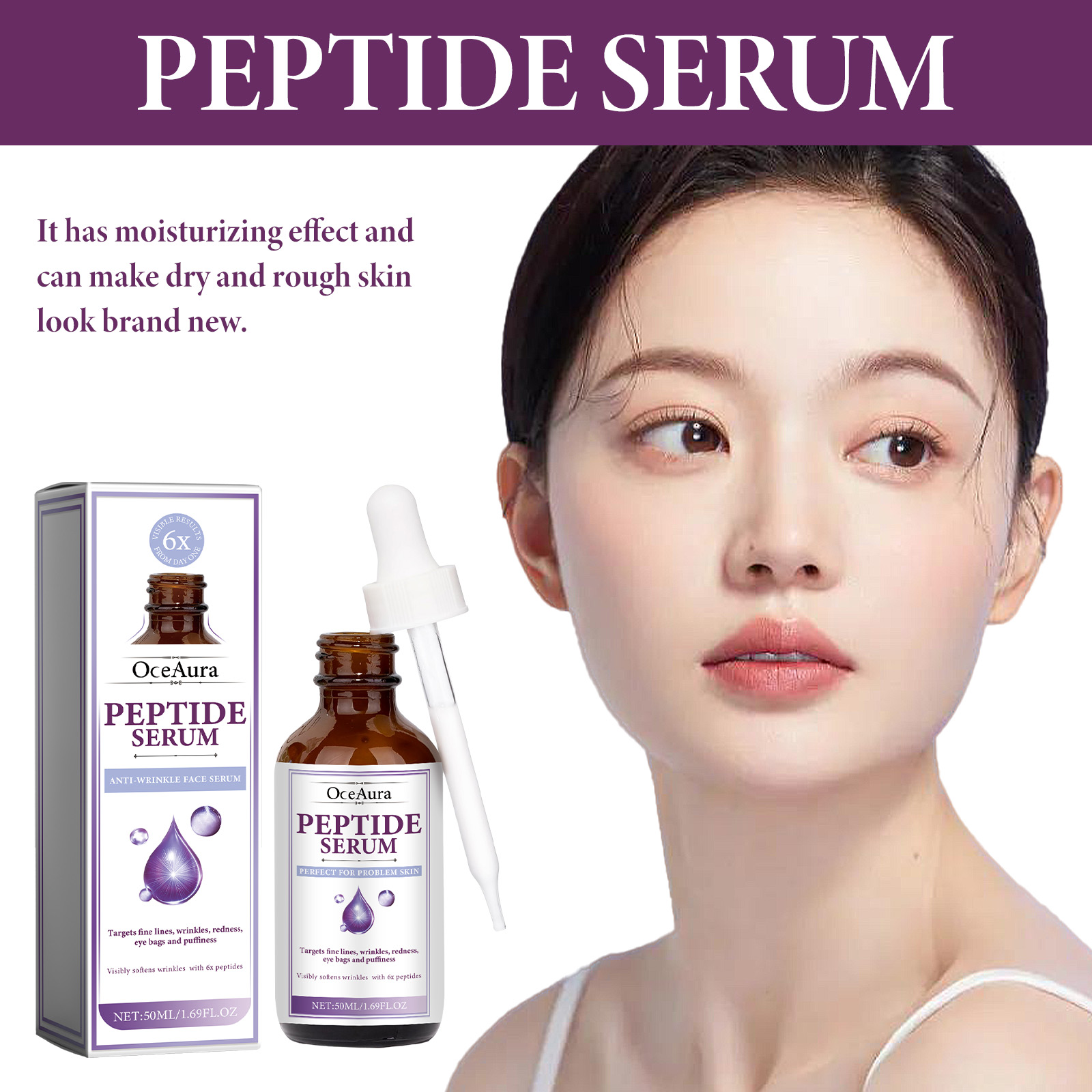 Our Peptide Serum contains Acetyl Hexapeptide-8, Collagen, Rubus Villous (Blackberry) Fruit Extract. It can reduce the appearance of premature aging, improve skin elasticity, restore collagen in the skin, significantly smooth the appearance of rough skin, plump the overall complexion, and restore areas prone to sagging, dark spots and wrinkles. Its use method is very simple: after cleansing and toning, take appropriate amount of essence evenly apply to the face skin, gently massage with the hand to absorb. It can deeply moisturize the skin, reduce dryness and roughness, and keep the skin hydrated.