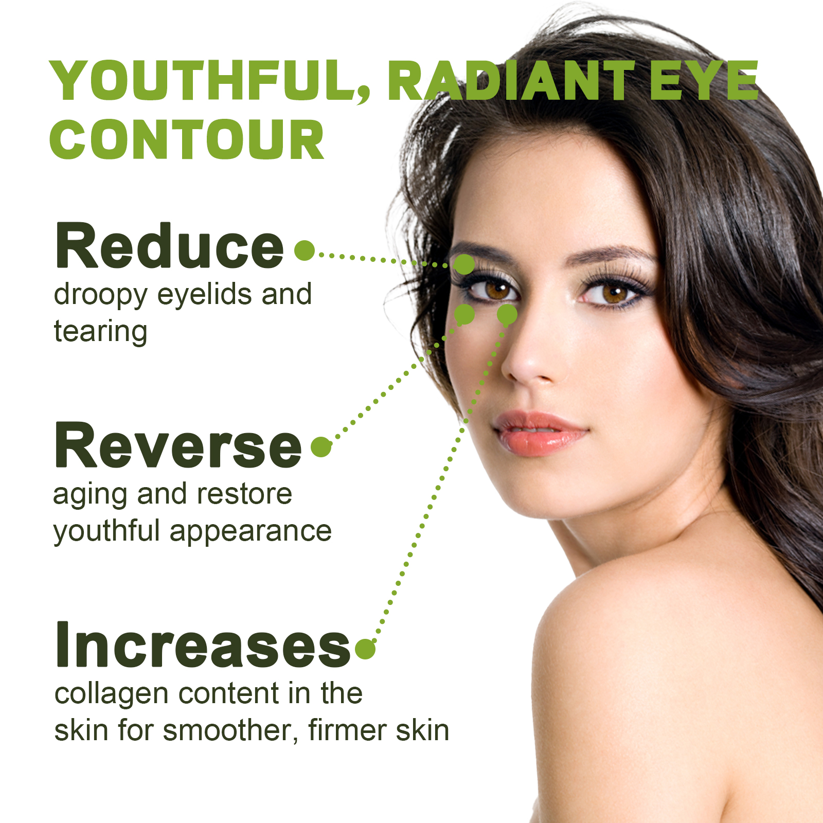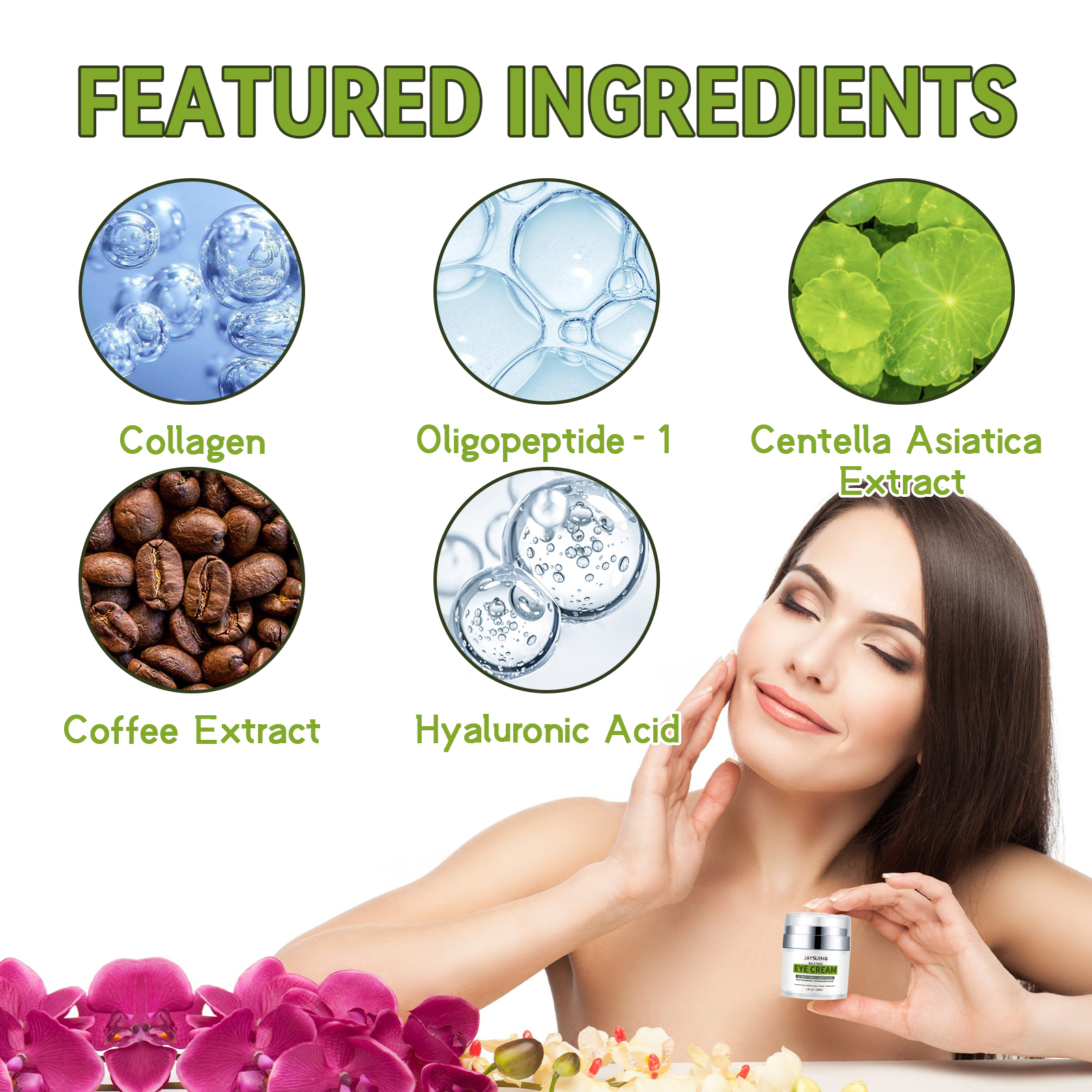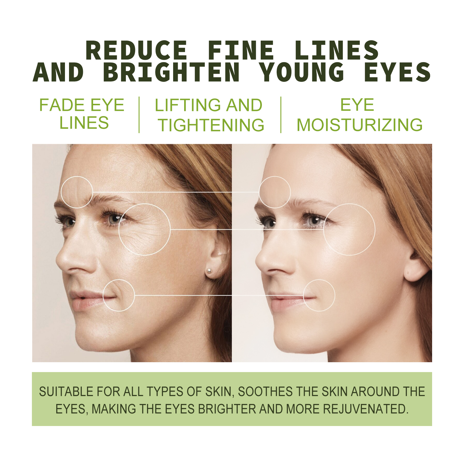 Our Peptide Repair eye cream contains collagen, oligopeptide-1, and Centella asiaticum extract. It can reduce wrinkles and fine lines around the eyes, enhance the fullness of the skin, and make the eyes smooth and firm. Increase skin moisture, restore full skin, improve skin elasticity, fade dark circles. The way to use it is very simple: after cleansing and toning, take a pea-sized amount of eye cream and apply it to the fingertips, apply it around the eyes, and massage it gently with the fingertips until it is absorbed. Use twice a day for better results. Suitable for all skin types, it soothes the skin around the eyes and makes the eyes brighter and more energetic. Fade fine lines, lighten young eyes, fade eye lines, moisturize eye skin.