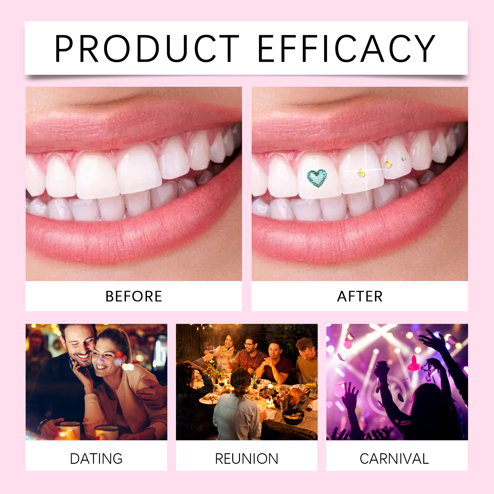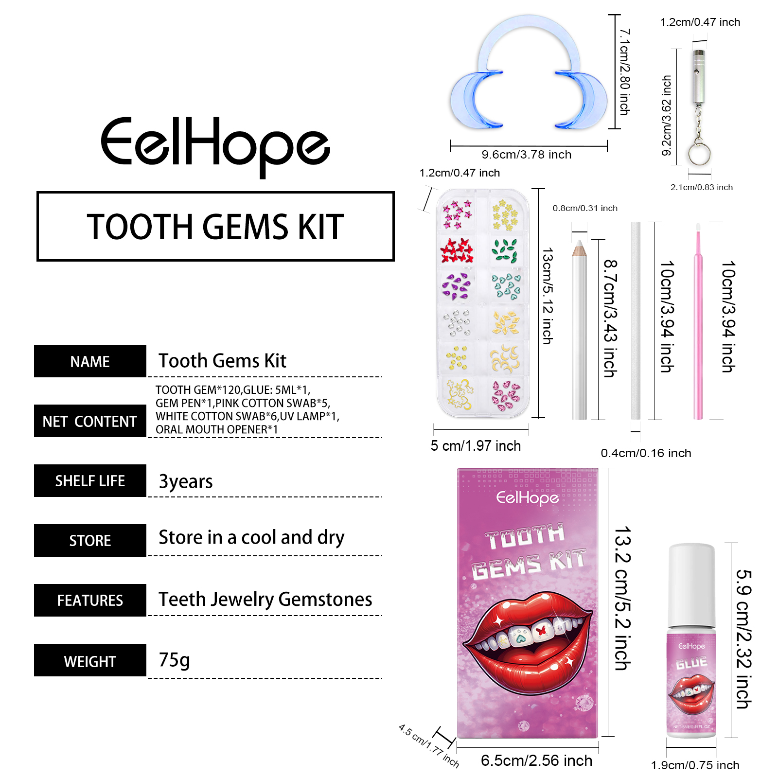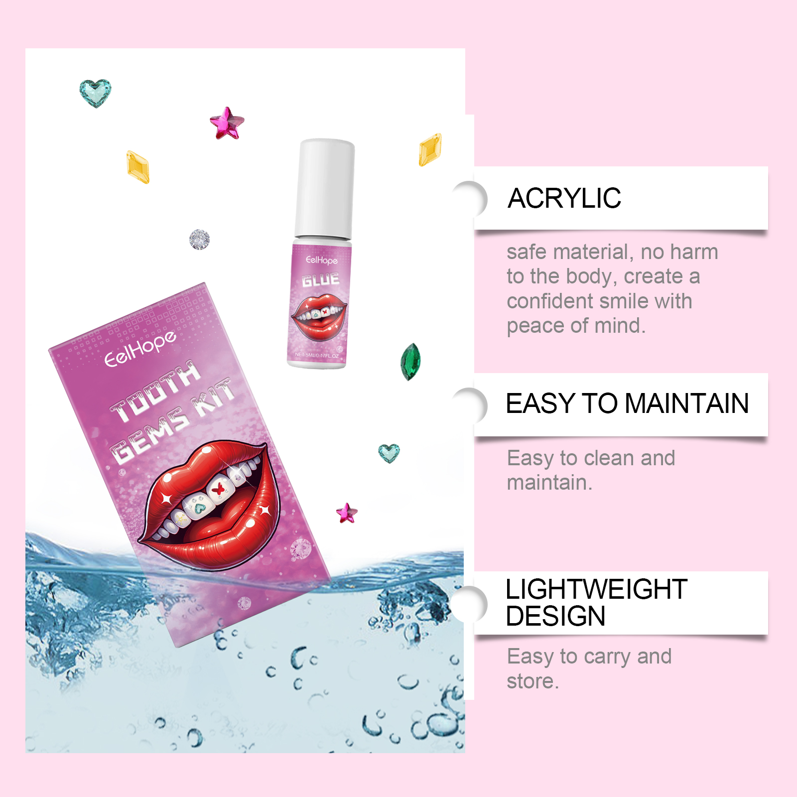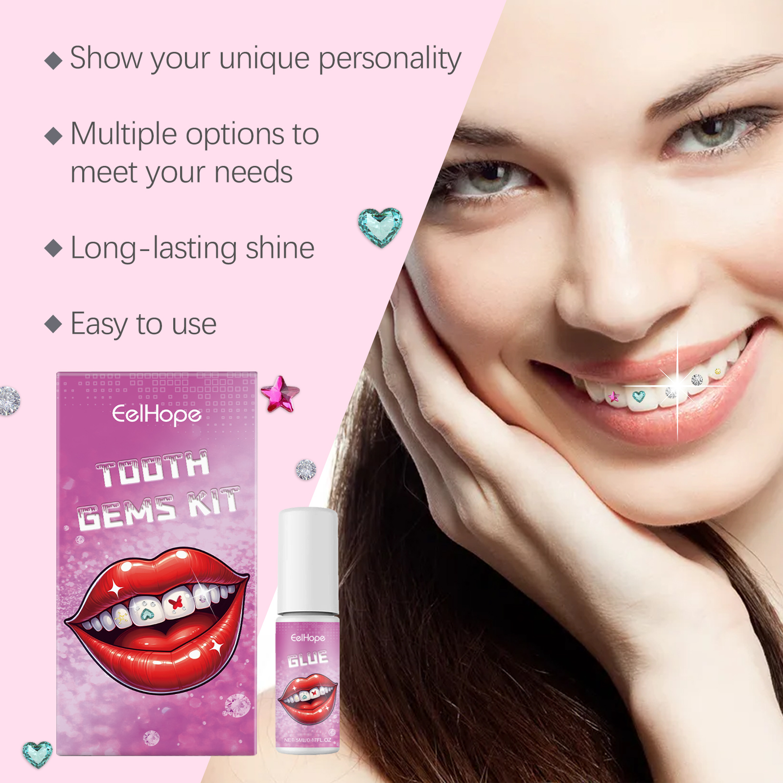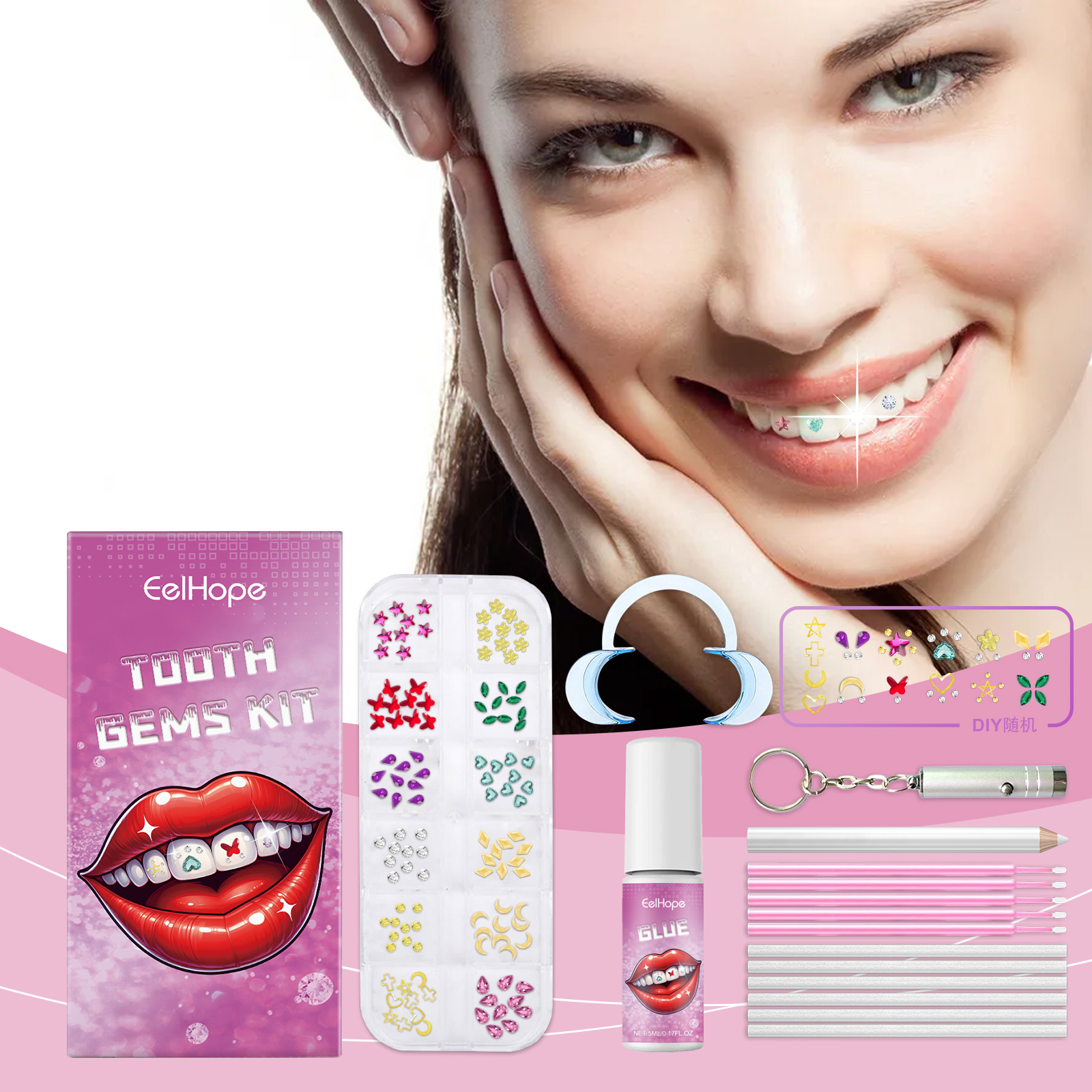 Our dental beauty kits contain acrylic, acrylic and methacrylate. It can cure glue quickly. Diverse selection of gemstones, personalized tooth decoration. The glue is durable and stable, and the decorative effect is lasting. Its use method is very simple: 1. Use the mouth opener to open and fix the mouth, put the white cotton swab into the mouth; 2. Clean teeth with a pink cotton swab, open the glue, take out the tooth gem with an eraser and dip it in the glue; 3. Stick gems on your teeth; 4. Dry the glue with ultraviolet light. Material safety, no harm to the bdy, with a peaceful mind to create a confident smile. Easy to clean and maintain
