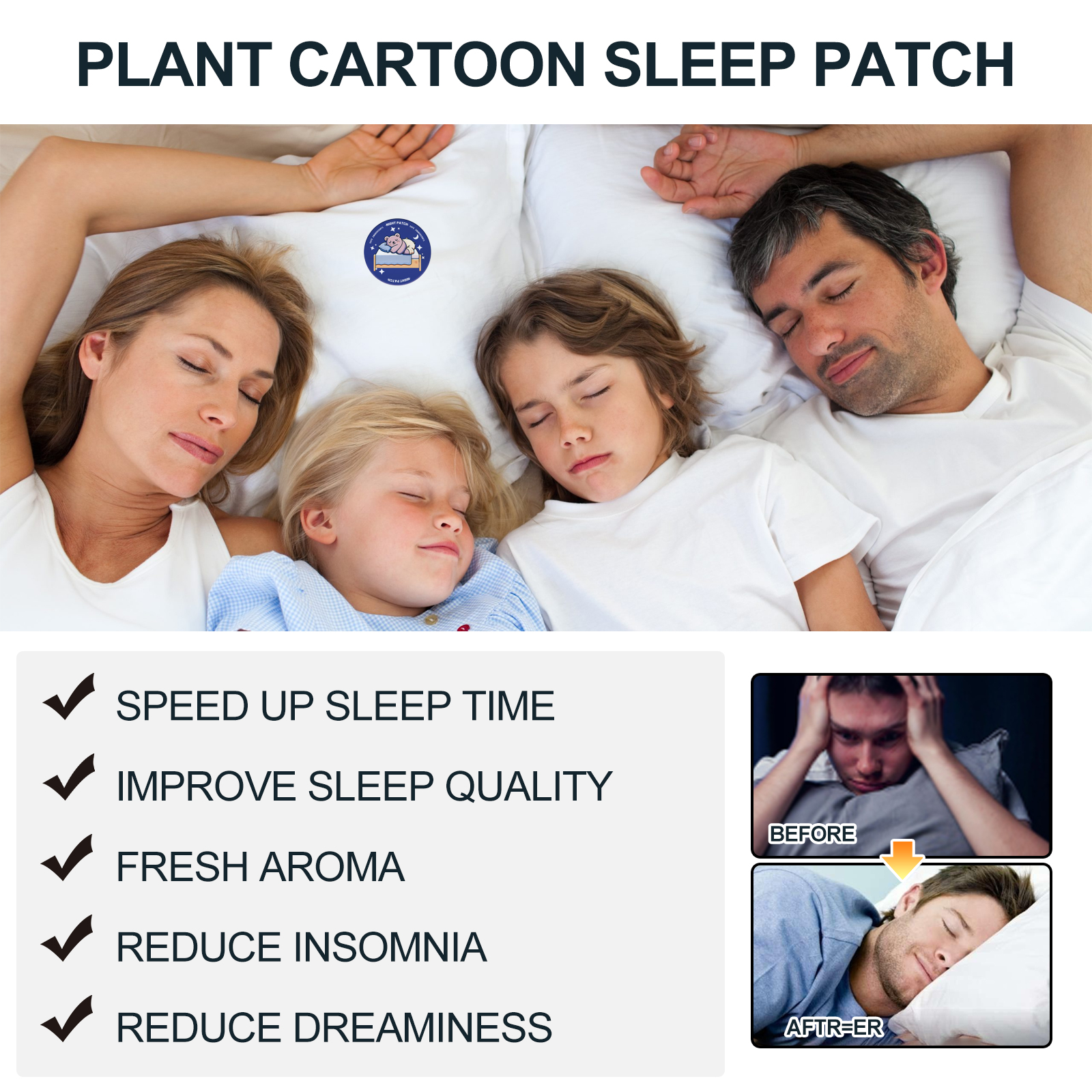 Our plant-based cartoon sleep patches contain glycerin and menthol. It can help you relax, fall asleep quickly, and enjoy a good and comfortable full night's sleep. Its use method is very simple: tear the package to take out the product, tear the patch from the anti-stick layer and stick on the pillow, collar, chest, etc. (do not touch the skin). Can ensure adequate sleep and promote healthier sleep habits.