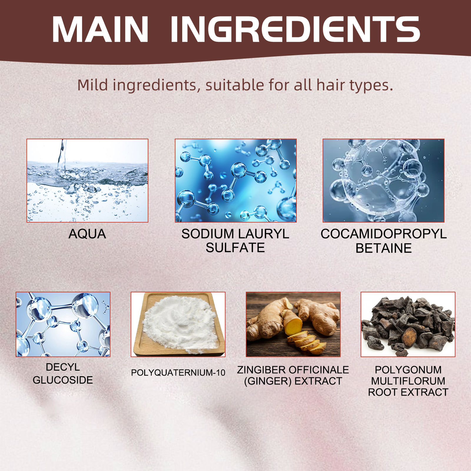 Our PolOur Polygonum multiflorum shampoo contains ginger extract and Polygonum multiflorum root extract. It nourishes and protects the hair, improves the health of hair follicles, promotes hair growth, moisturizes the roots, brightens the hair, covers your white hair, and gives you glossy black hair. Its application method is very simple: wet the hair with water, evenly apply the shampoo to the hair, and gently massage the scalp, and finally clean the hair and scalp with clean water until there is no residue. It can deeply nourish hair roots, effectively control oil, and make hair look more fluffy and shiny.