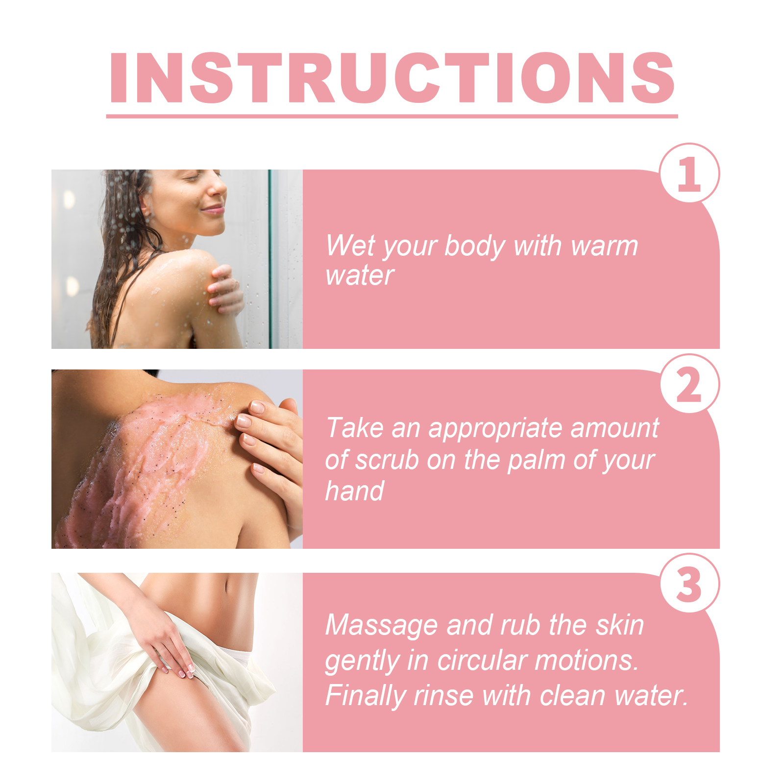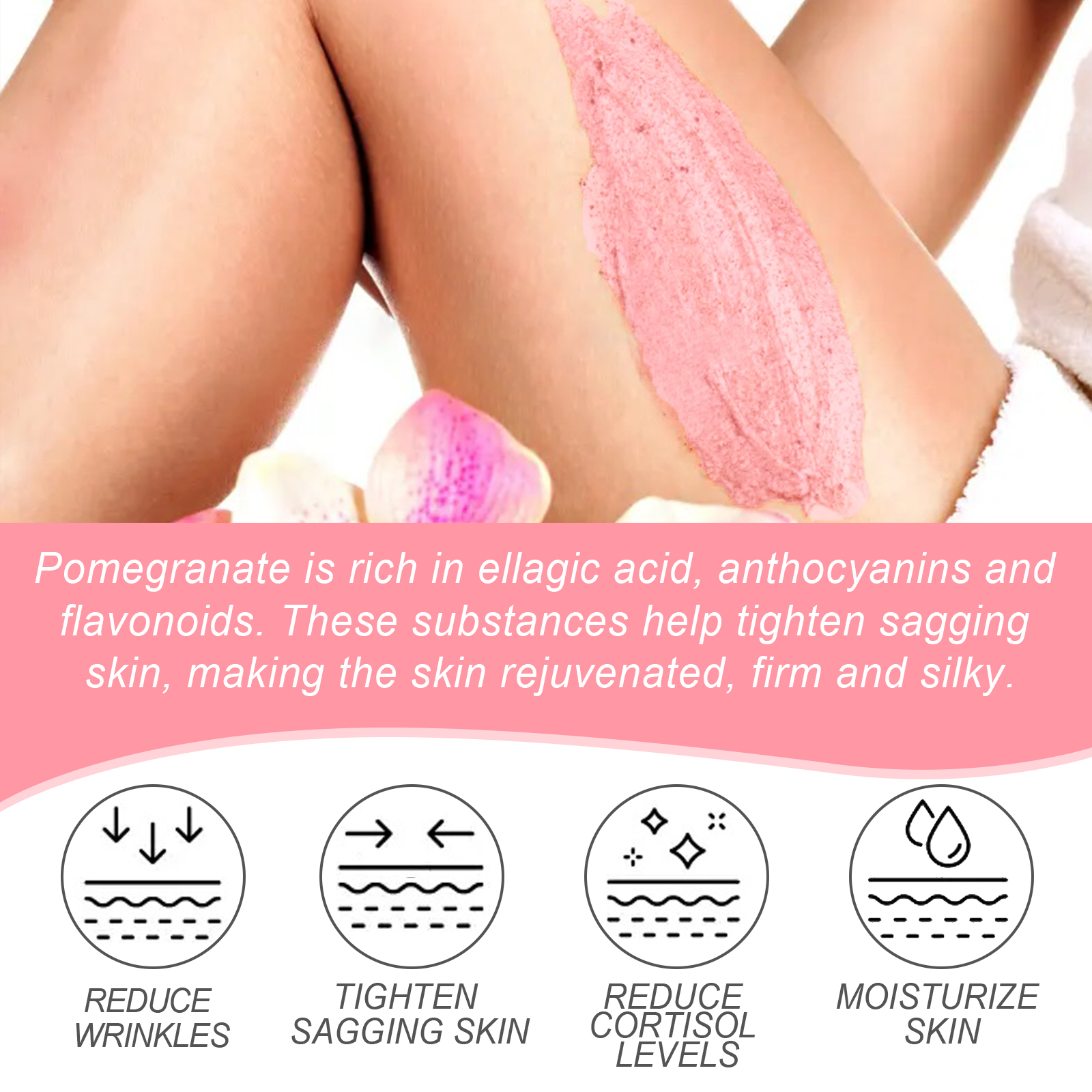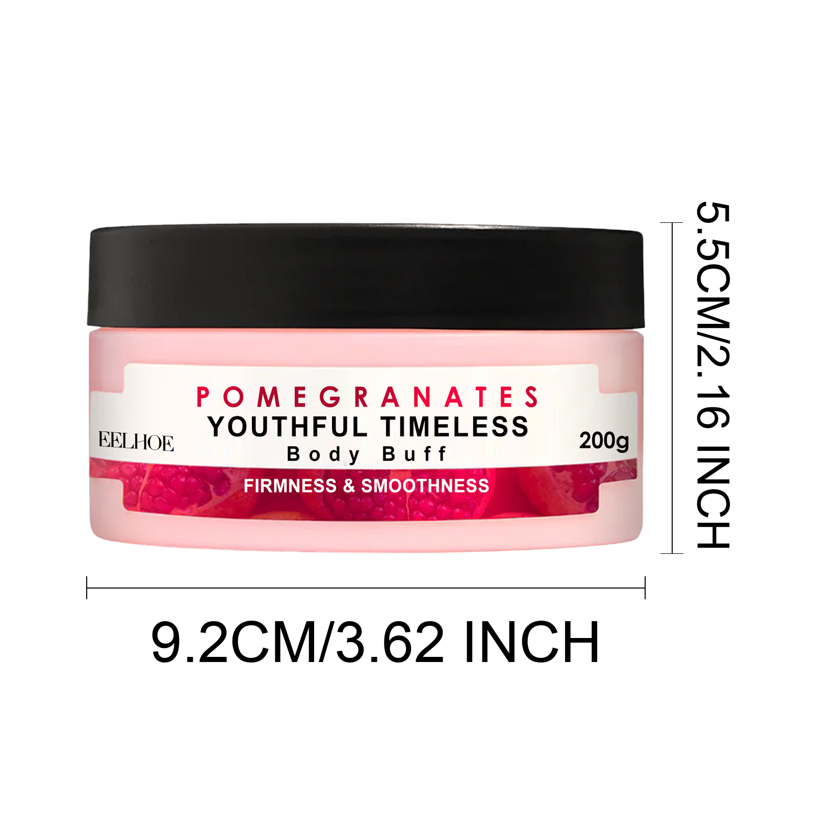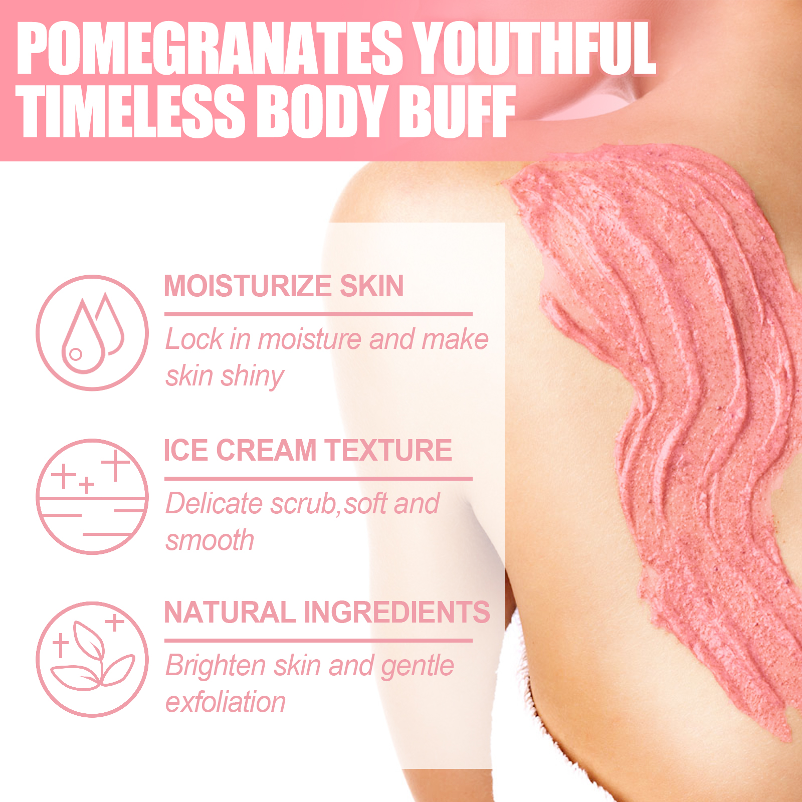 Our Pomegranates Youthful Timeless Body Buff contains pomegranate extract, eucalyptus oil, safflower seed oil. It can deeply penetrate the skin and enhance skin plumpness, firmness and elasticity, lower cortisol levels, helps relax the mind and reduces stress. Its application method is very simple: Wet your body with warm water, take an appropriate amount of scrub on the palm of your hand, massage and rub the skin gently in circular motions. Finally rinse with clean water. Tighten sagging skin, making the skin rejuvenated, firm and silky.
